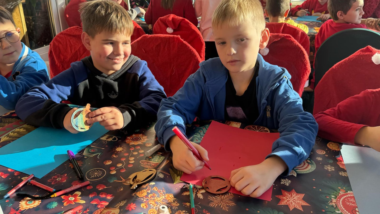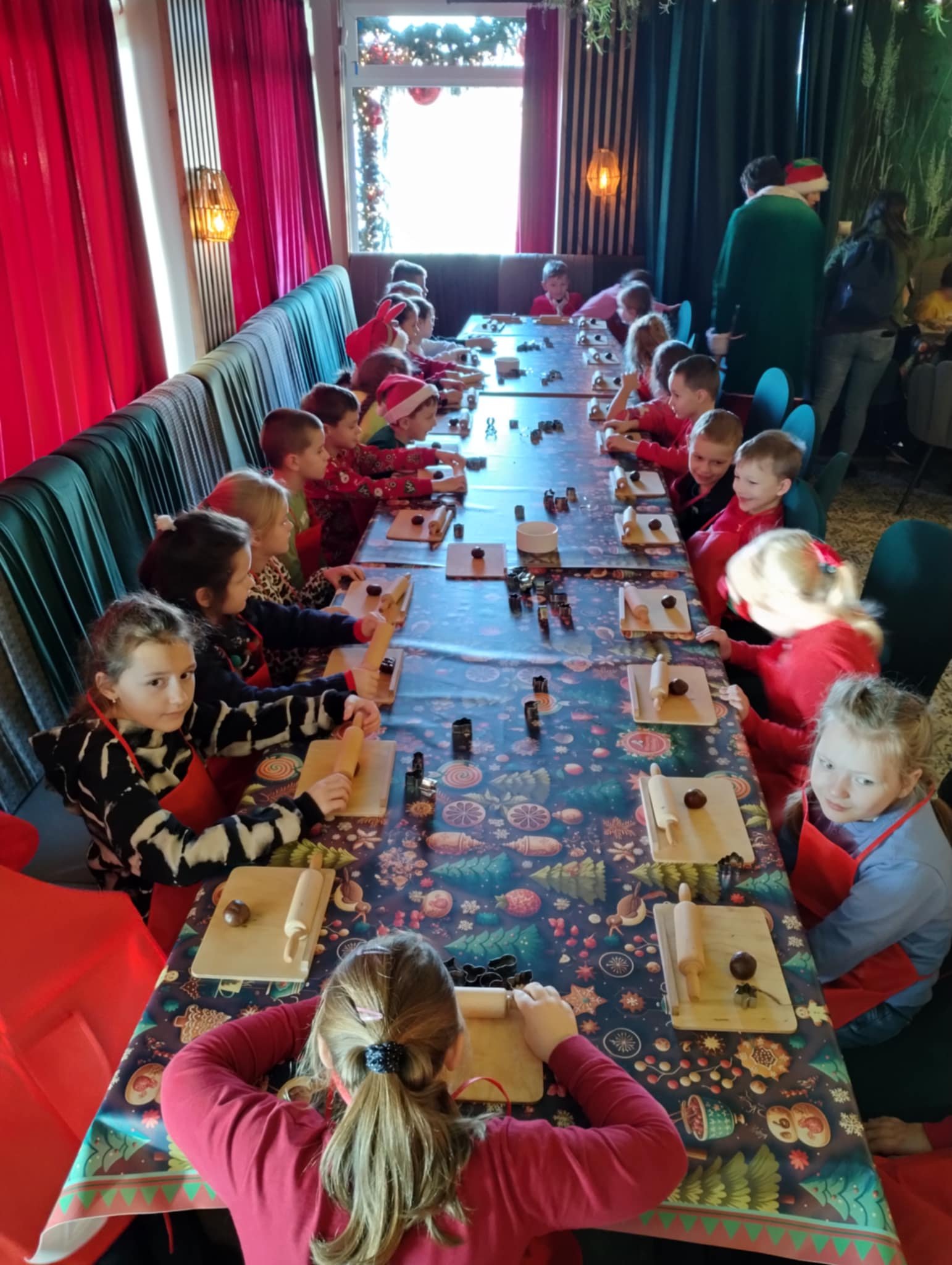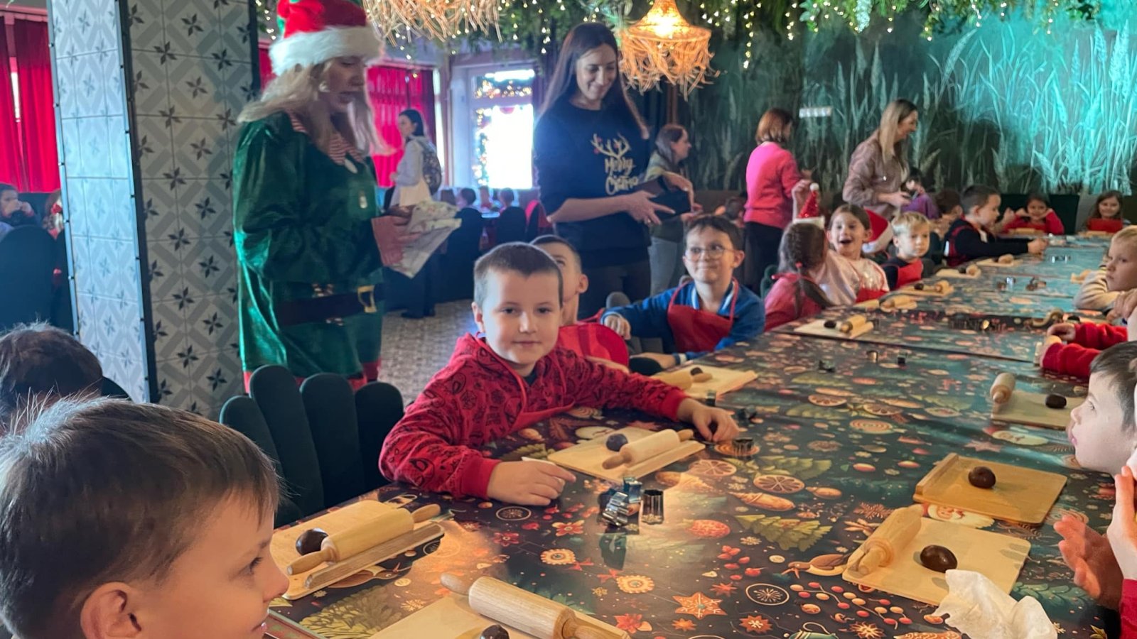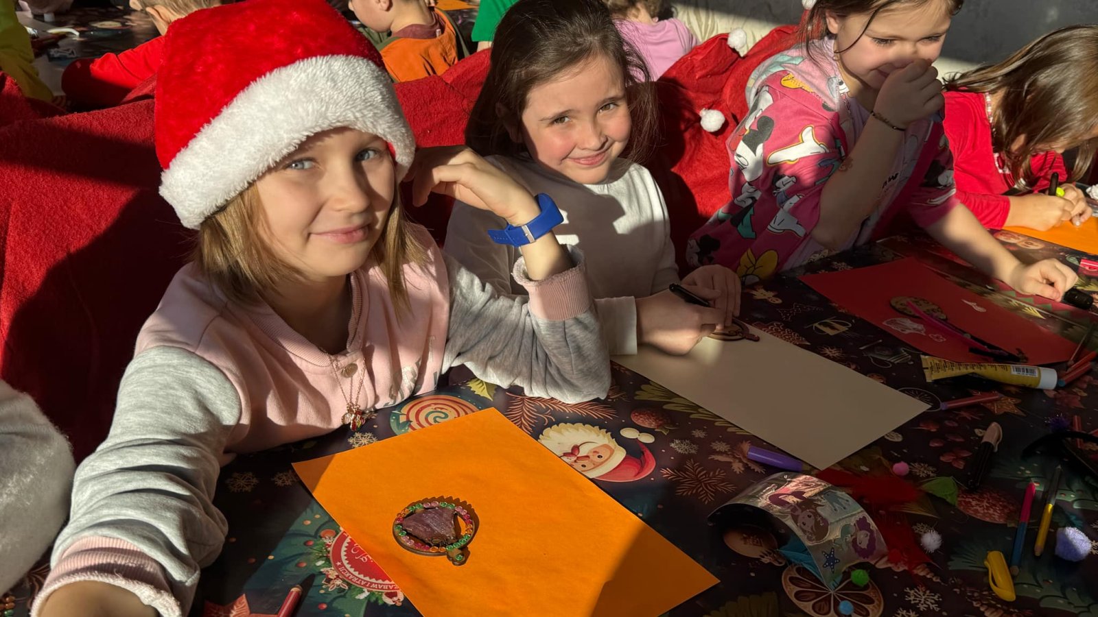 Pierwszym punktem programu były warsztaty pieczenia pierniczków. Dzieci z zapałem wałkowały ciasto, wycinały kształty choinek, gwiazdek i serduszek. Gotowe pierniczki, jeszcze ciepłe, nie tylko pięknie wyglądały, ale i smakowały wyśmienicie! Po słodkich warsztatach uczniowie wzięli udział w konkursie na zgadywanie świątecznych zagadek. Pytania dotyczyły tradycji bożonarodzeniowych, kolęd i postaci związanych ze świętami. Wspólne zgadywanie wywołało mnóstwo śmiechu i rywalizacji. Kolejną atrakcją było dekorowanie bombek. Dzieci, z pomocą elfów, malowały kule różnokolorowymi farbami i ozdabiały je brokatem. Każda bombka była wyjątkowa i odzwierciedlała kreatywność małych artystów. Poza tym uczniowie przygotowali piękne laurki dla Świętego Mikołaja, na których dziękowali za prezenty i składali mu życzenia świąteczne.