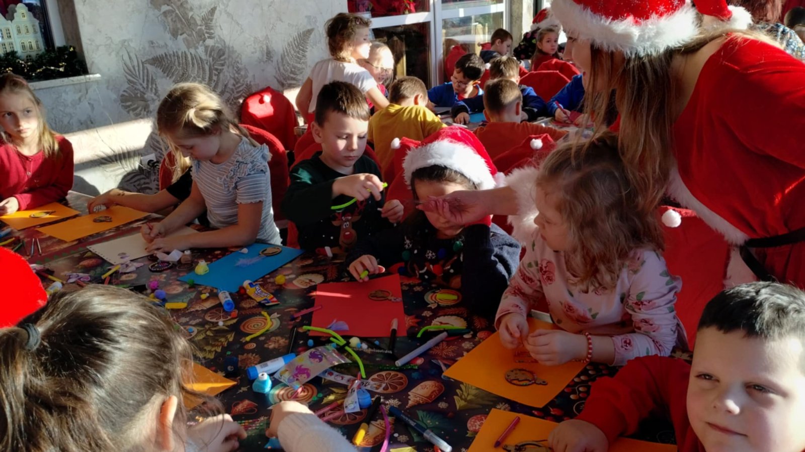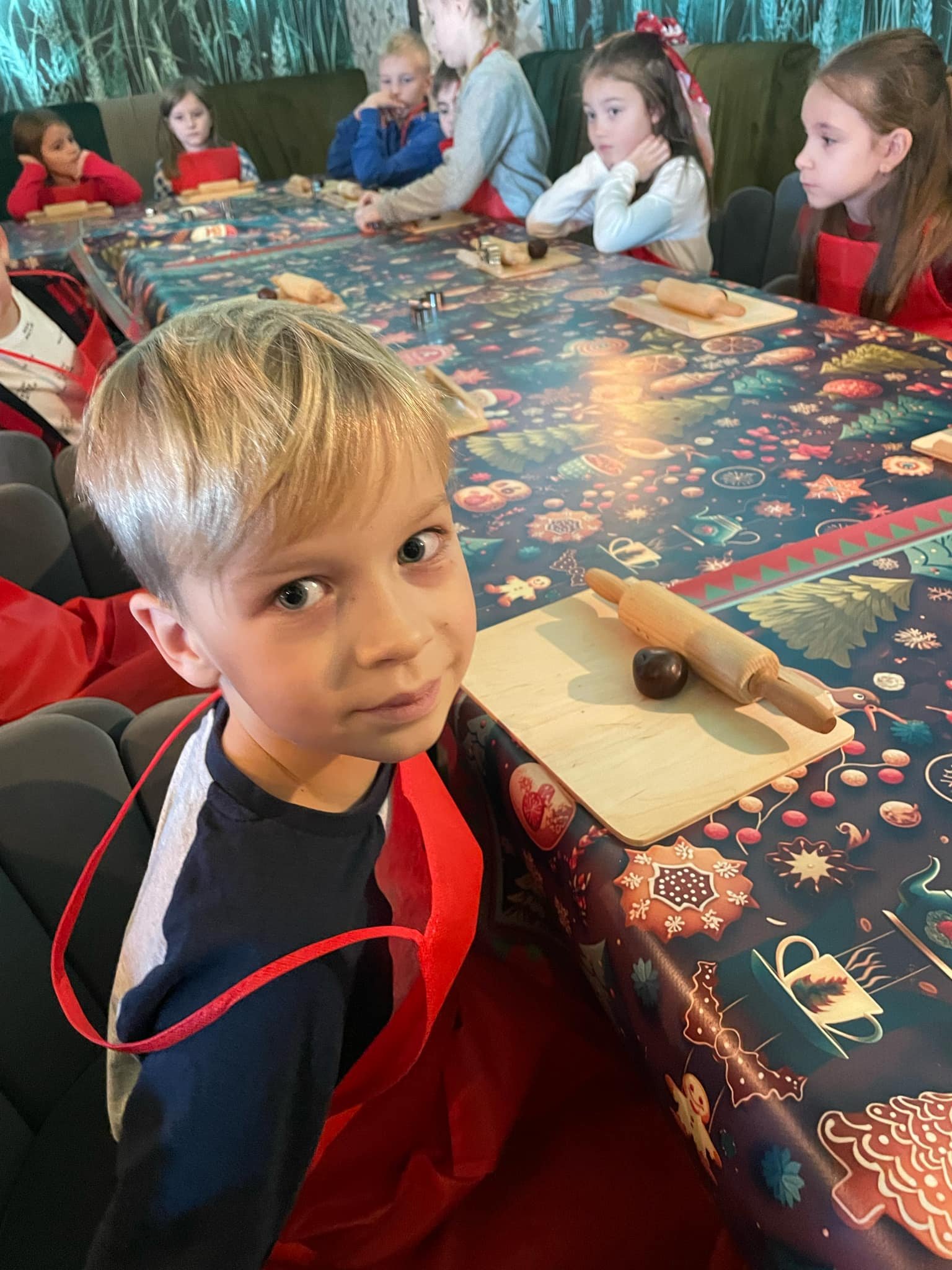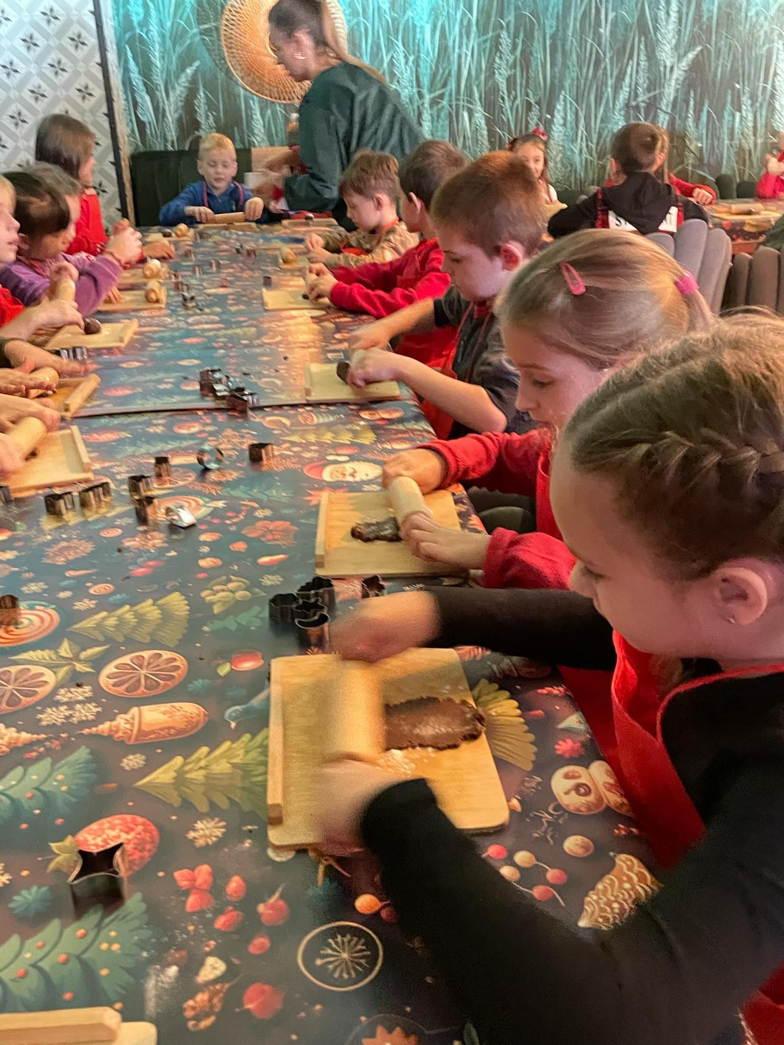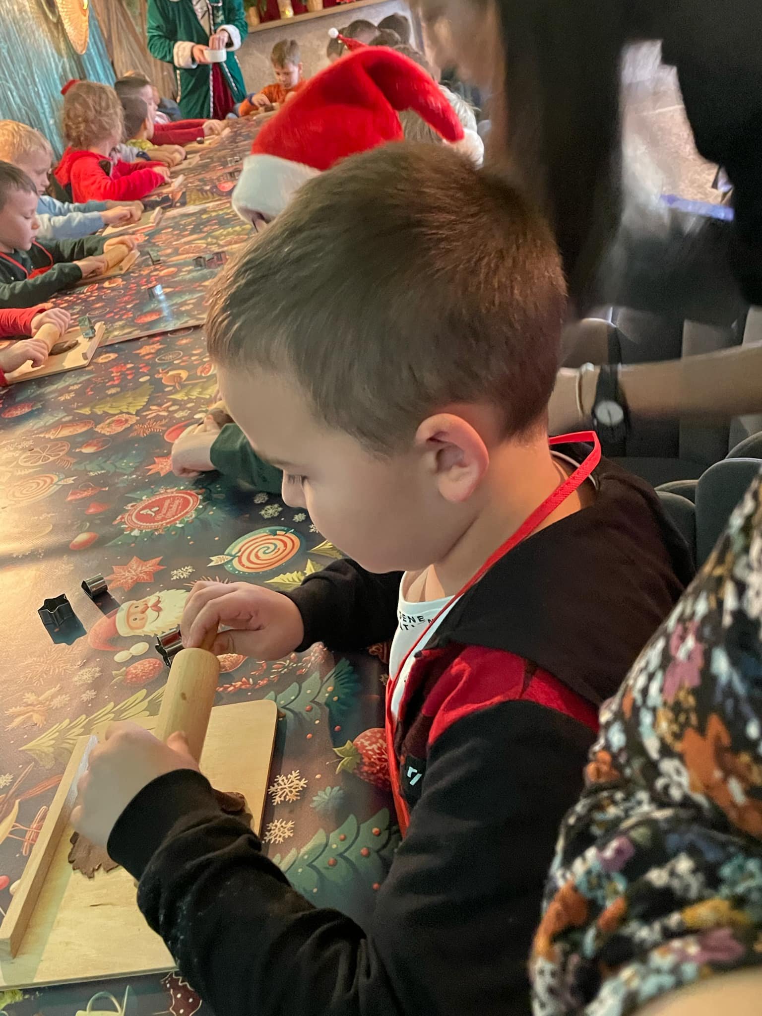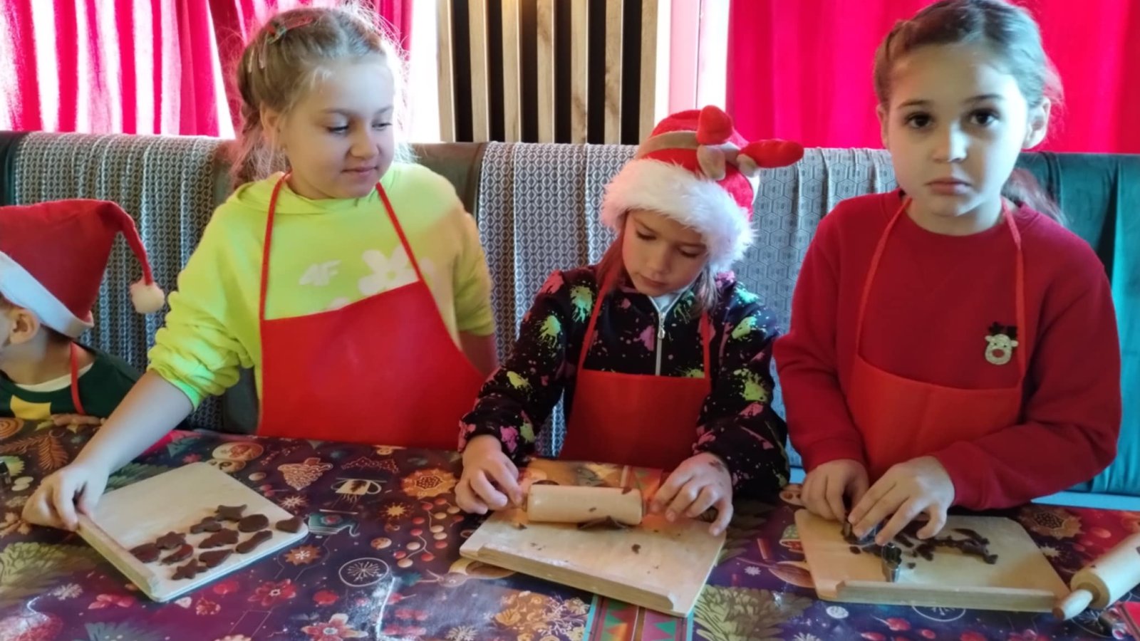 Pierwszym punktem programu były warsztaty pieczenia pierniczków. Dzieci z zapałem wałkowały ciasto, wycinały kształty choinek, gwiazdek i serduszek. Gotowe pierniczki, jeszcze ciepłe, nie tylko pięknie wyglądały, ale i smakowały wyśmienicie! Po słodkich warsztatach uczniowie wzięli udział w konkursie na zgadywanie świątecznych zagadek. Pytania dotyczyły tradycji bożonarodzeniowych, kolęd i postaci związanych ze świętami. Wspólne zgadywanie wywołało mnóstwo śmiechu i rywalizacji. Kolejną atrakcją było dekorowanie bombek. Dzieci, z pomocą elfów, malowały kule różnokolorowymi farbami i ozdabiały je brokatem. Każda bombka była wyjątkowa i odzwierciedlała kreatywność małych artystów. Poza tym uczniowie przygotowali piękne laurki dla Świętego Mikołaja, na których dziękowali za prezenty i składali mu życzenia świąteczne.