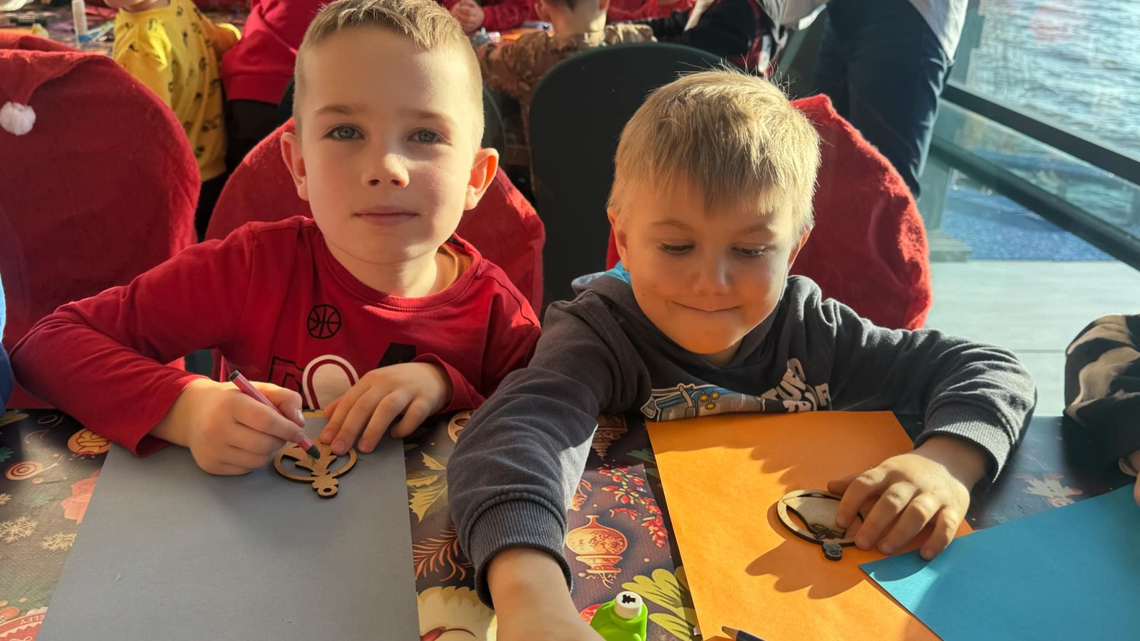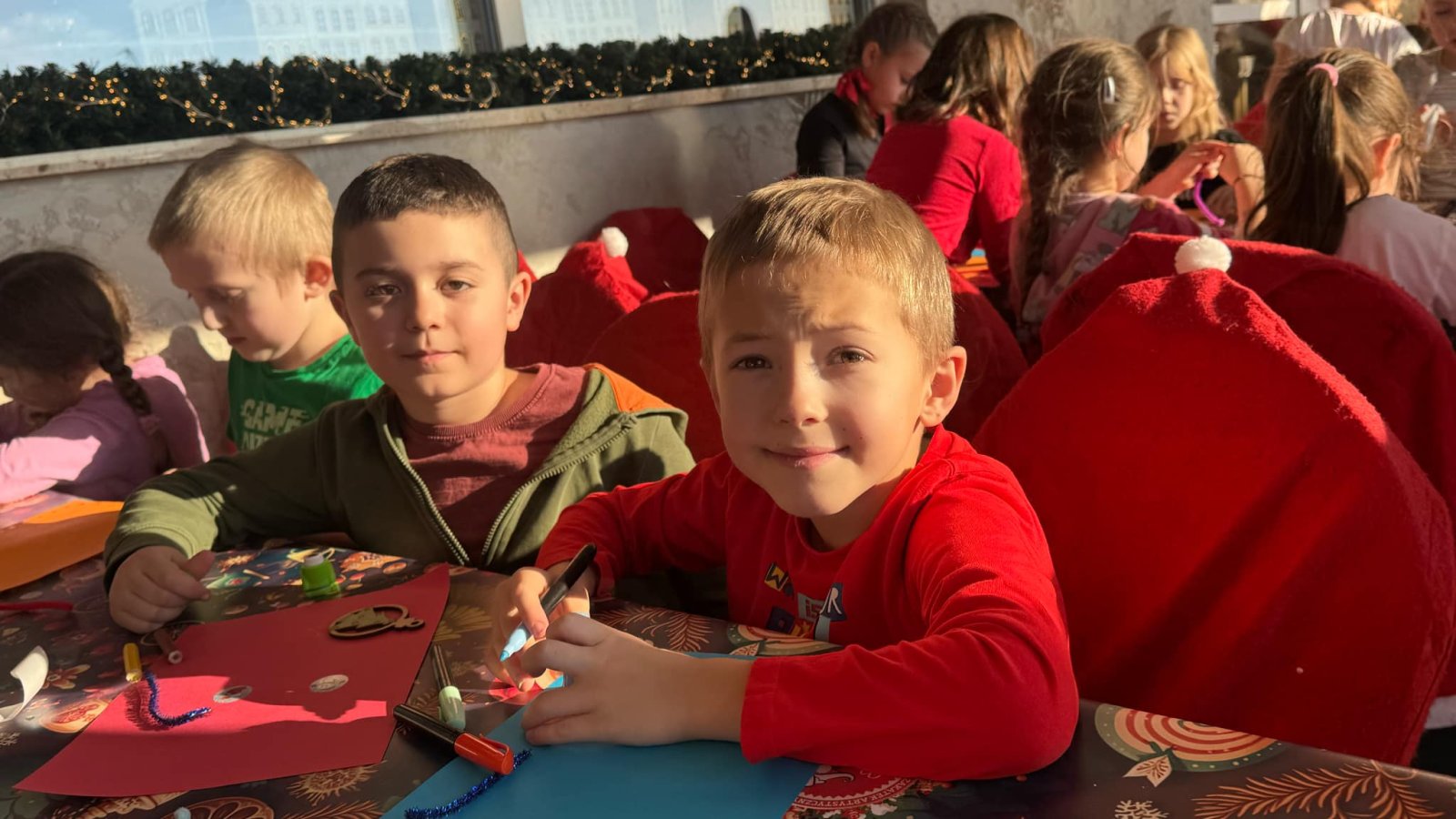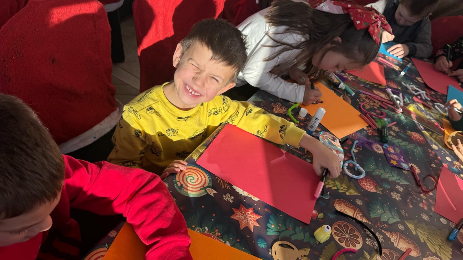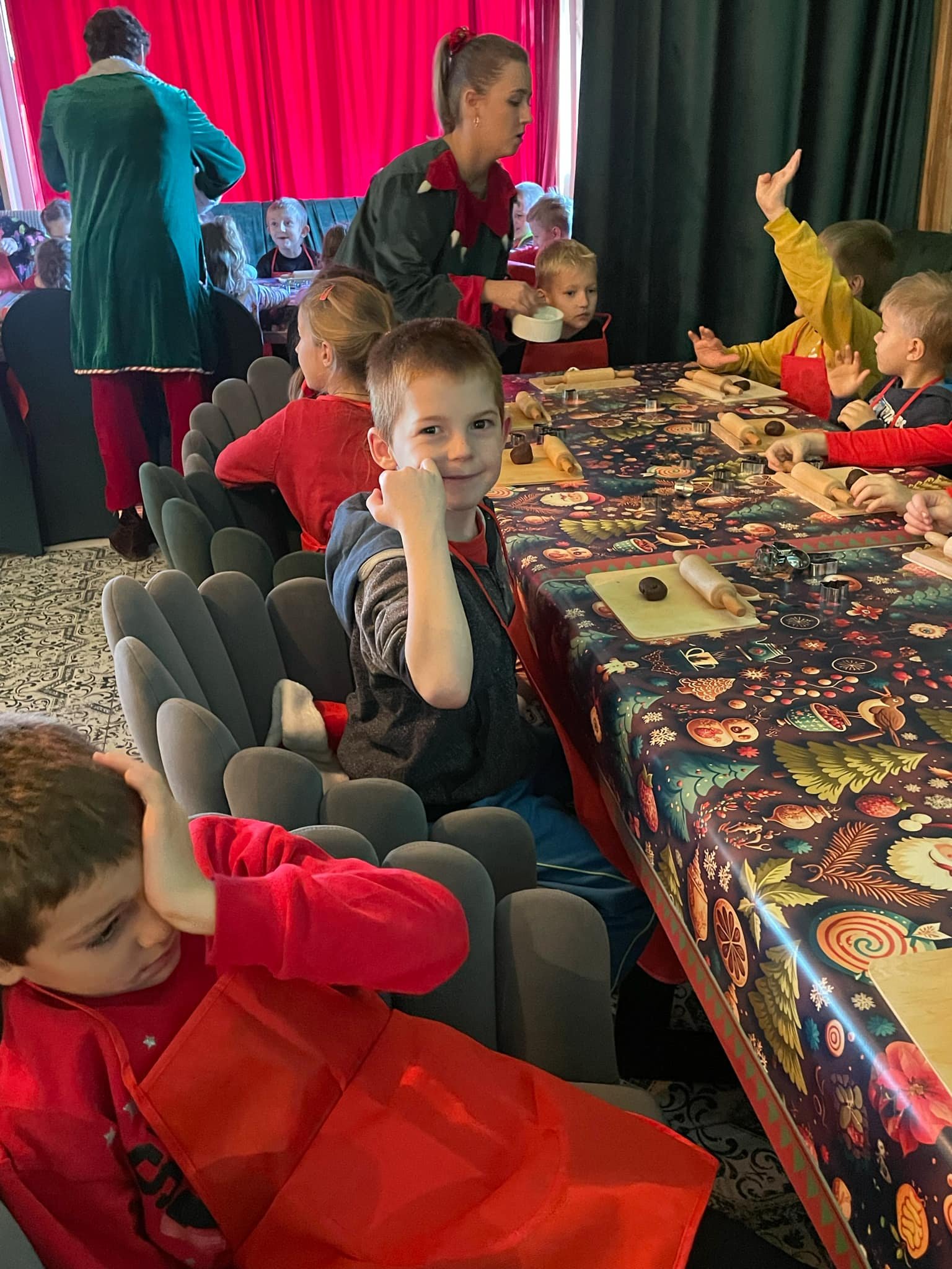 Pierwszym punktem programu były warsztaty pieczenia pierniczków. Dzieci z zapałem wałkowały ciasto, wycinały kształty choinek, gwiazdek i serduszek. Gotowe pierniczki, jeszcze ciepłe, nie tylko pięknie wyglądały, ale i smakowały wyśmienicie! Po słodkich warsztatach uczniowie wzięli udział w konkursie na zgadywanie świątecznych zagadek. Pytania dotyczyły tradycji bożonarodzeniowych, kolęd i postaci związanych ze świętami. Wspólne zgadywanie wywołało mnóstwo śmiechu i rywalizacji. Kolejną atrakcją było dekorowanie bombek. Dzieci, z pomocą elfów, malowały kule różnokolorowymi farbami i ozdabiały je brokatem. Każda bombka była wyjątkowa i odzwierciedlała kreatywność małych artystów. Poza tym uczniowie przygotowali piękne laurki dla Świętego Mikołaja, na których dziękowali za prezenty i składali mu życzenia świąteczne.