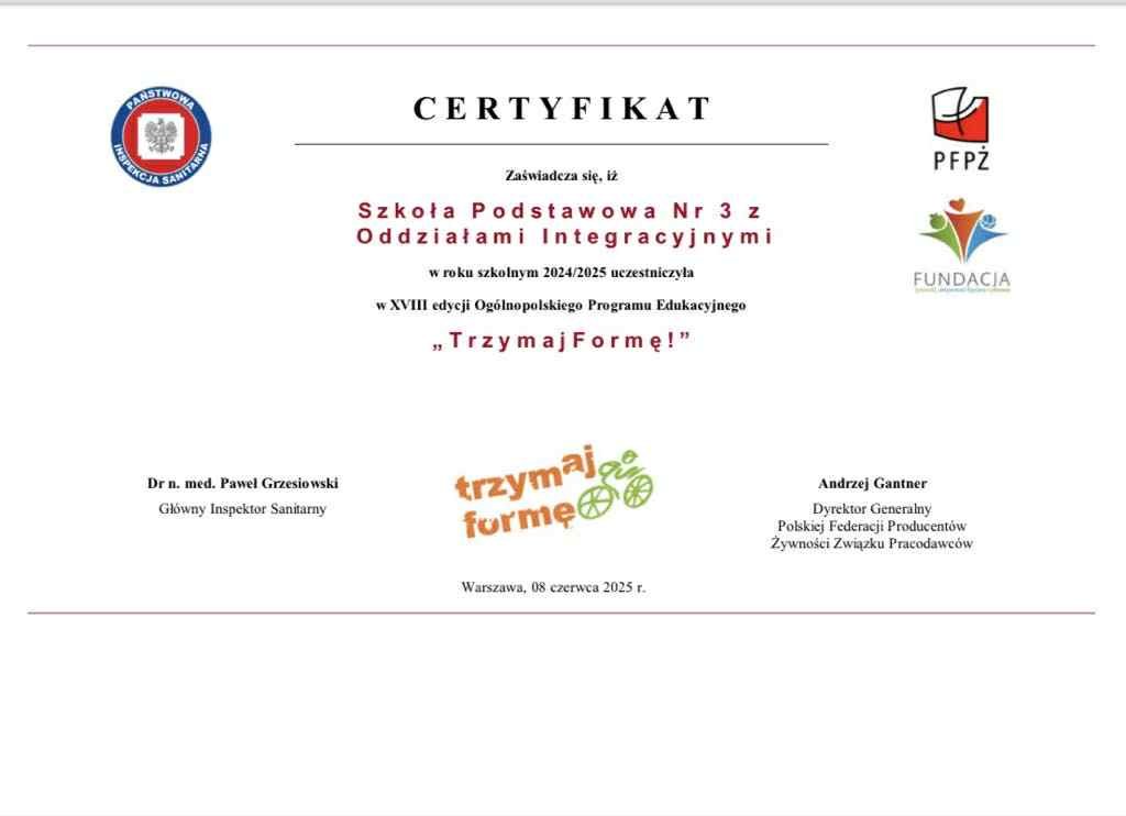 Z przyjemnością informujemy, że nasza szkoła w roku szkolnym 2024/2025 otrzymała Certyfikat XVIII edycji Ogólnopolskiego Projektu Edukacyjnego „Trzymaj formę”. Program Edukacyjny „Trzymaj Formę" współorganizowany jest przez Główny Inspektorat Sanitarny oraz Polską Federację Producentów Żywności Związek Pracodawców w ramach realizacji strategii WHO dotyczącej diety, aktywności fizycznej i zdrowia. Założeniem w/w programu jest promocja zdrowego stylu życia promującym zbilansowane odżywianie połączone z regularną aktywnością fizyczną.