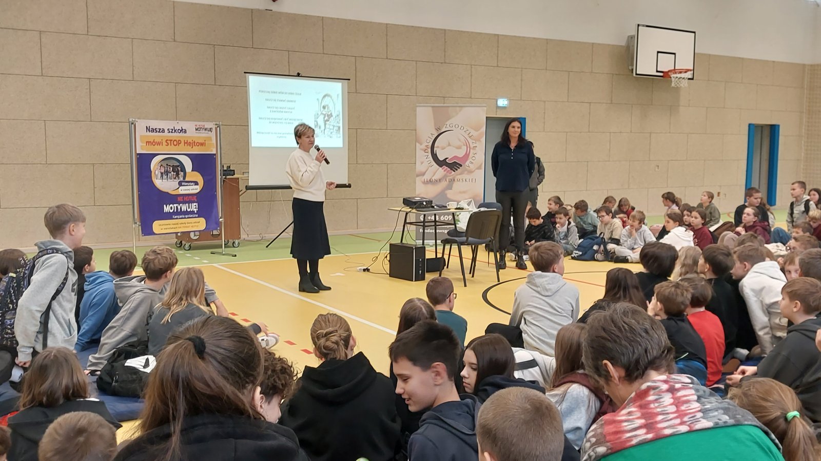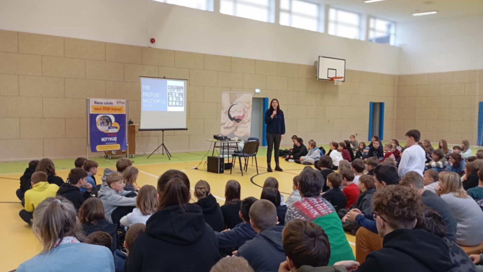 Warsztaty spotkały się z dużym zainteresowaniem uczniów. Pani Ilona od pierwszych minut przyciągnęła uwagę młodzieży, łącząc treści teoretyczne z osobistymi doświadczeniami. Dzięki temu uczestnicy mogli lepiej zrozumieć, jakie konsekwencje niesie za sobą agresja słowna oraz jak ważna jest odpowiedzialność za wypowiadane słowa. Spotkanie odbyło się w ramach ogólnopolskiej kampanii „Nie hejtuję – motywuję”, nad którą patronat honorowy objęli: Minister Edukacji Narodowej, Minister Sprawiedliwości oraz Rzecznik Praw Dziecka.
