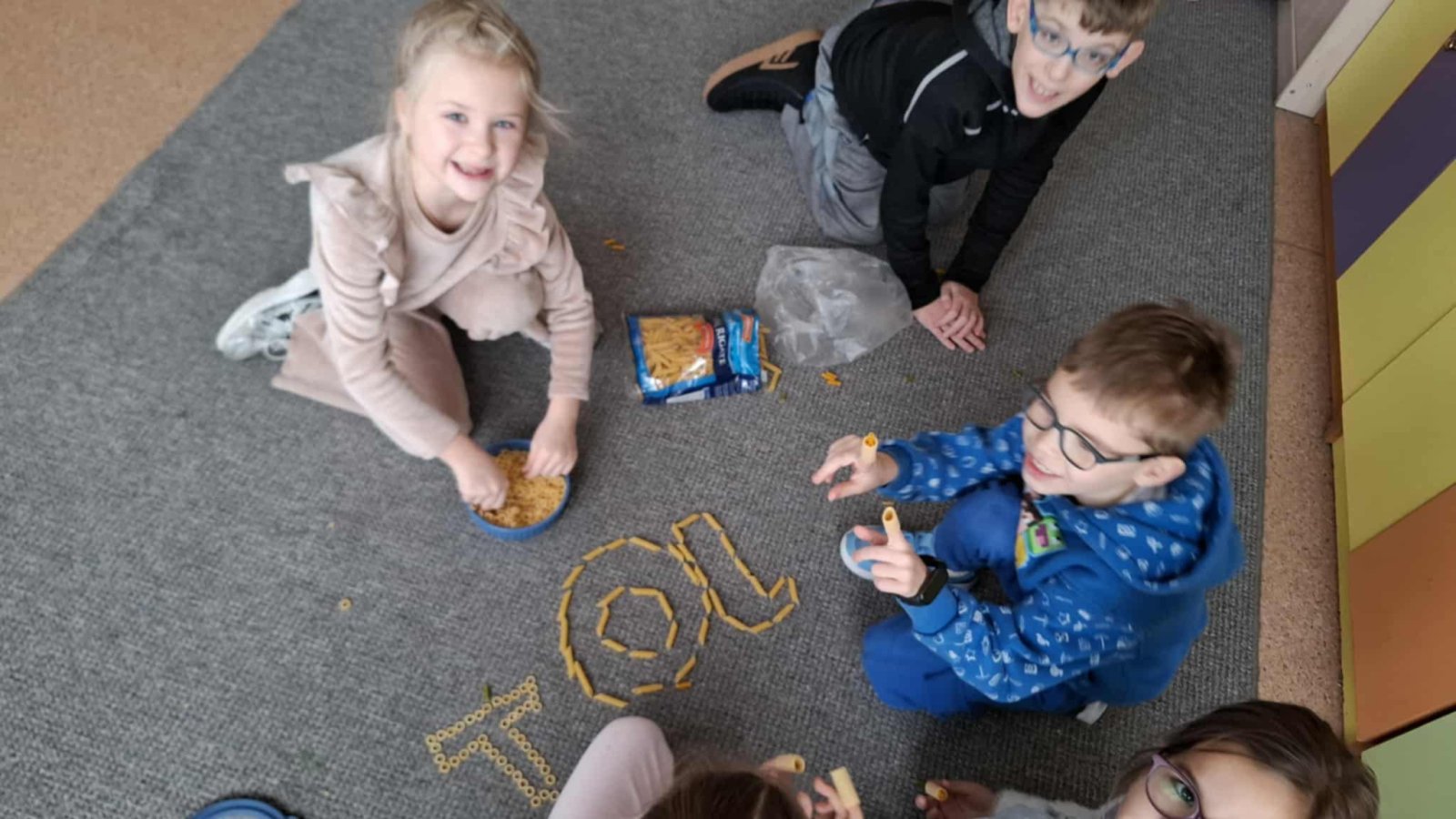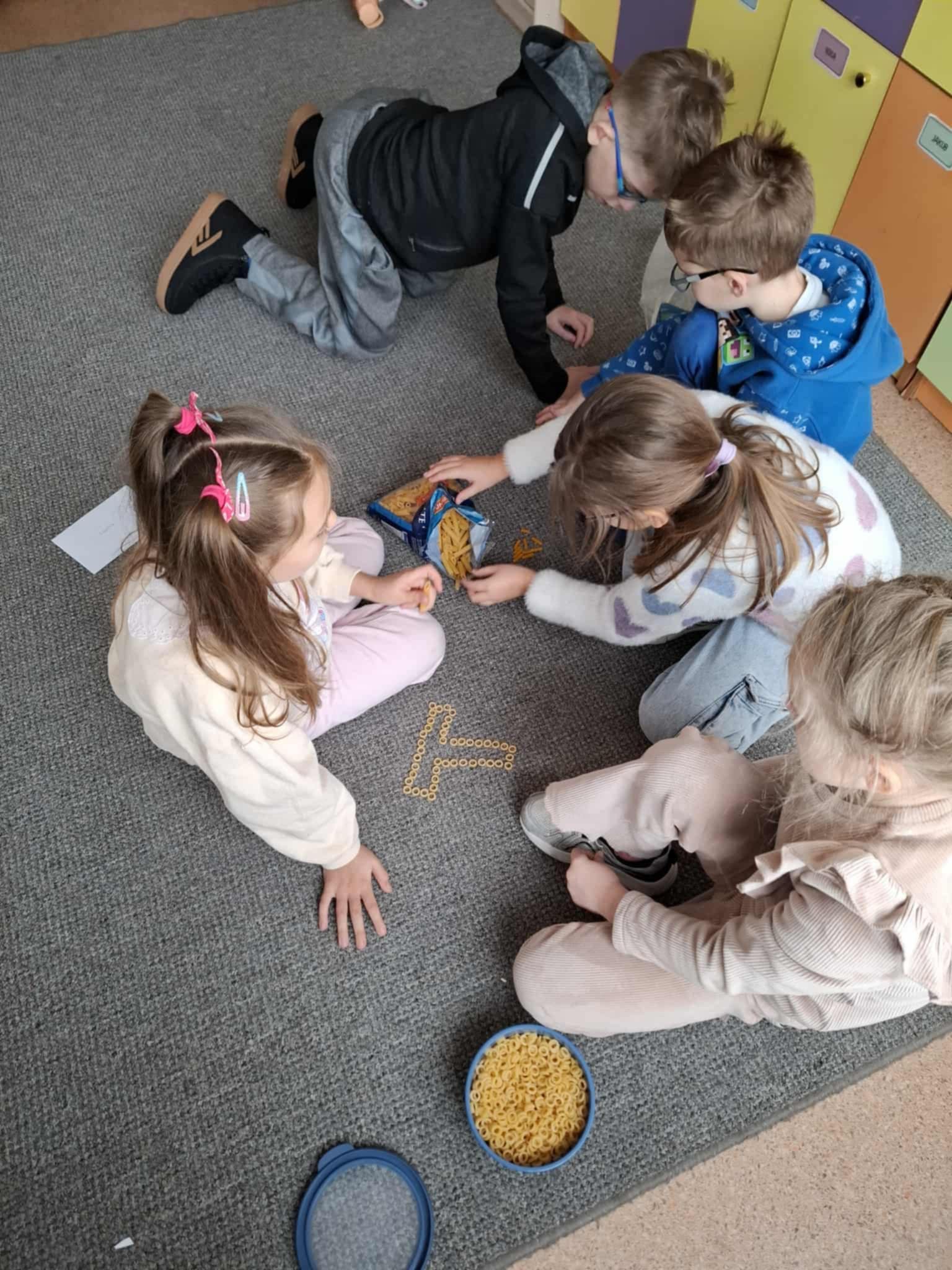 Dzieci z wielkim entuzjazmem wybierały odpowiednie kształty makaronu, tworzyły z nich litery alfabetu, a następnie układały krótkie, własne wyrazy. Ćwiczenie to nie tylko rozwijało umiejętności językowe, lecz także wspierało motorykę małą, kreatywność oraz współpracę w grupie.