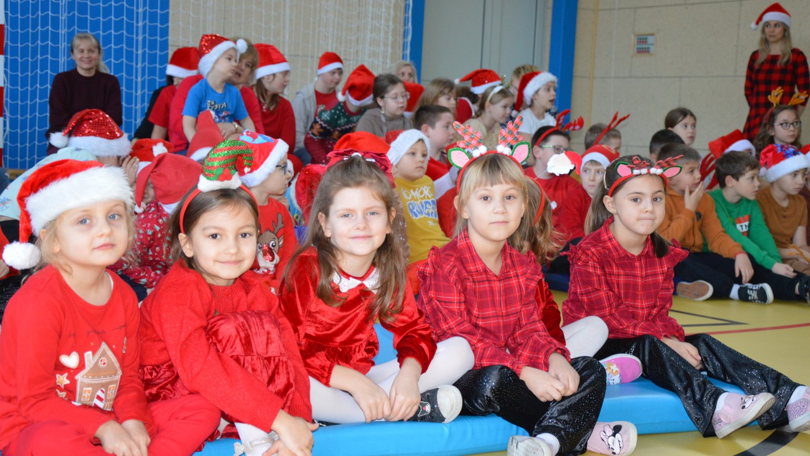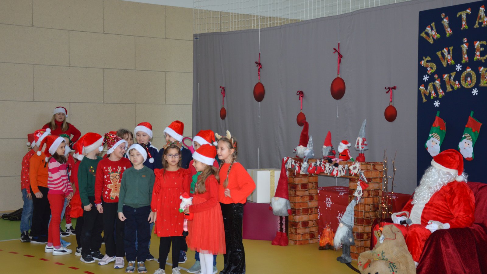 Święty Mikołaj spotkał się z uczniami najmłodszych klas, którzy z wielkim zaangażowaniem zaprezentowali przygotowane piosenki oraz wierszyki. Nie zabrakło również wspólnych, pamiątkowych zdjęć, które na długo pozostaną miłym wspomnieniem tego dnia. Najwięcej radości sprawiły oczywiście mikołajkowe upominki – wywołały one wiele emocji, śmiechu i szczerych uśmiechów. Wizyta św. Mikołaja była dla dzieci niezapomnianym przeżyciem i wprowadziła całą społeczność szkolną w świąteczny nastrój.