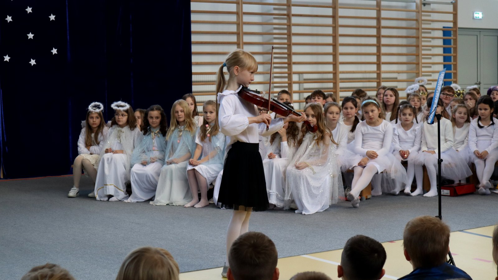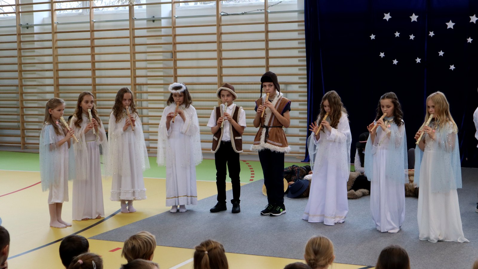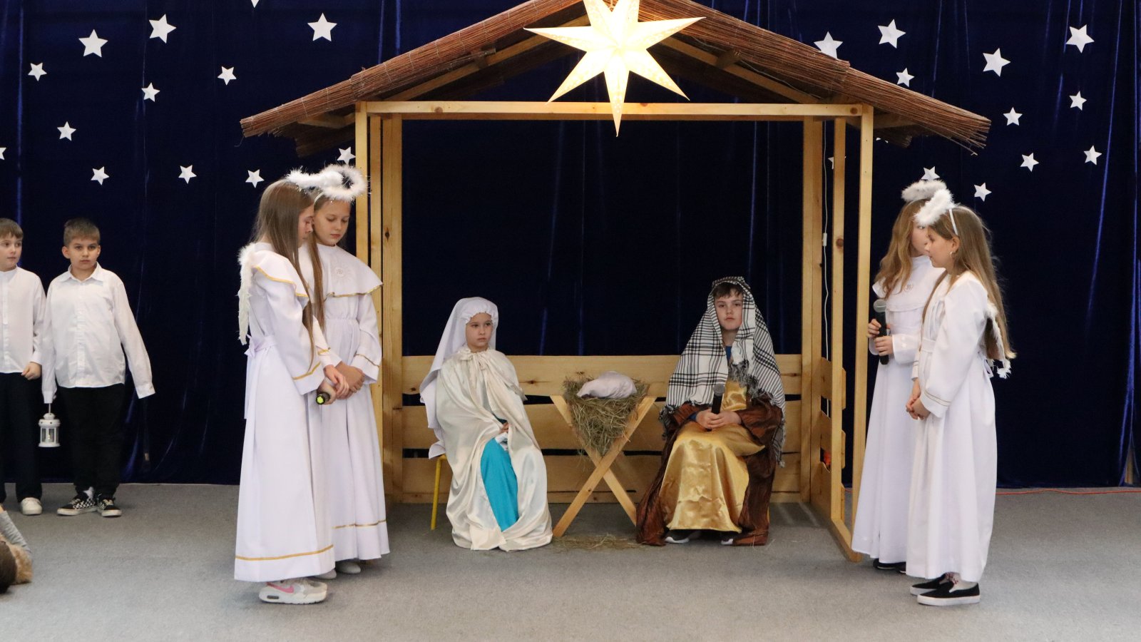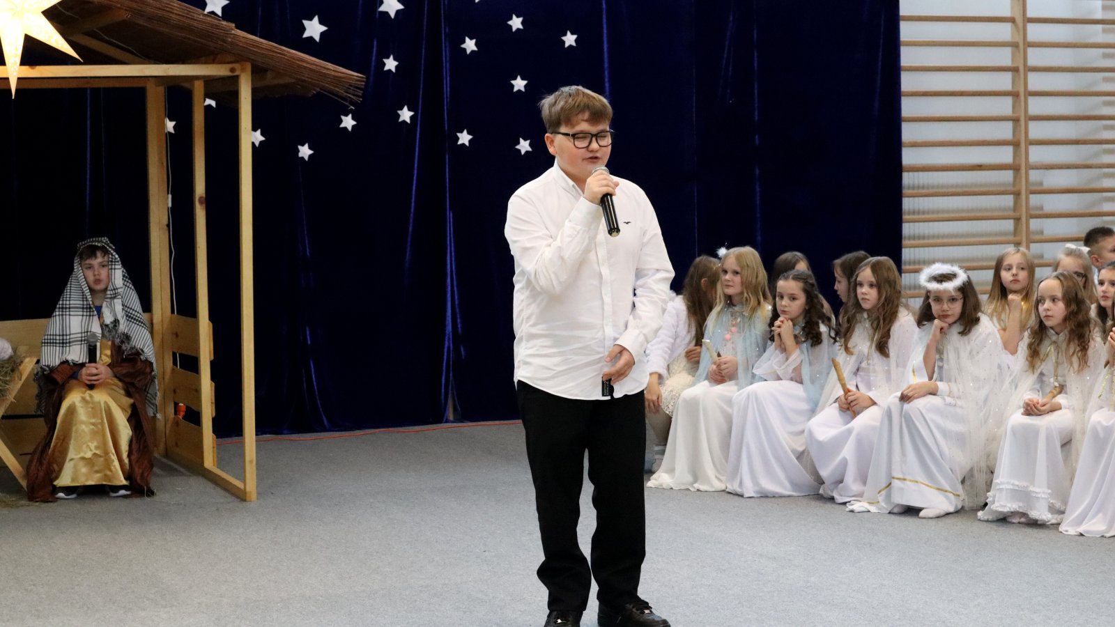 Uczniowie z wielkim zaangażowaniem zaprezentowali historię narodzin Jezusa, wcielając się w role Maryi, Józefa, pasterzy, aniołów oraz Trzech Króli. Przedstawienie zostało wzbogacone pięknymi kolędami i pastorałkami, które stworzyły podniosłą i ciepłą atmosferę. Starannie przygotowane stroje, dekoracje oraz oprawa muzyczna sprawiły, że występ na długo pozostanie w pamięci widzów. Jasełka były nie tylko artystycznym wydarzeniem, ale również okazją do wspólnego przeżywania wartości takich jak dobro, miłość, pokój i wzajemna życzliwość. Publiczność nagrodziła młodych artystów gromkimi brawami, doceniając ich trud, talent i odwagę sceniczną.