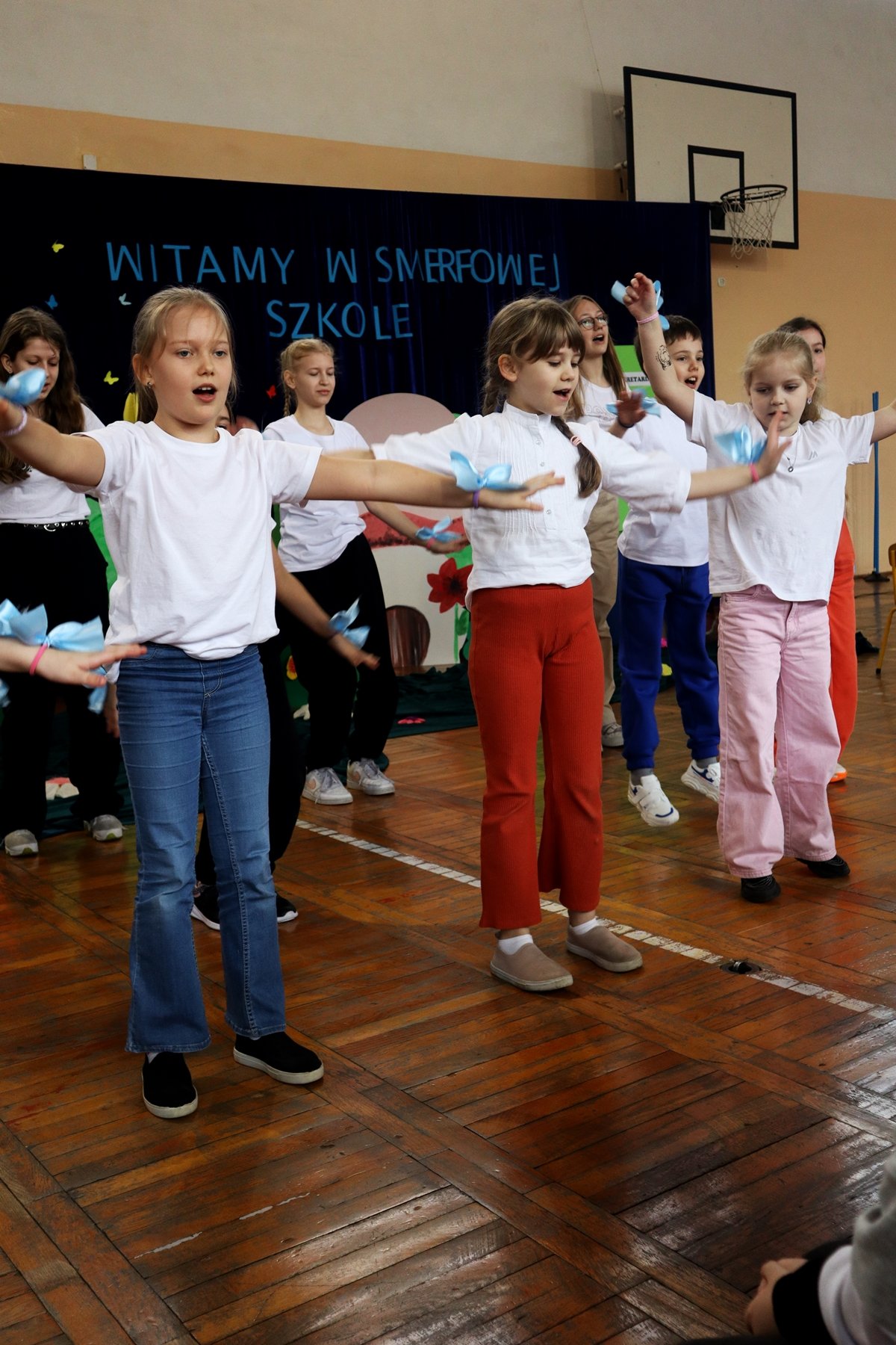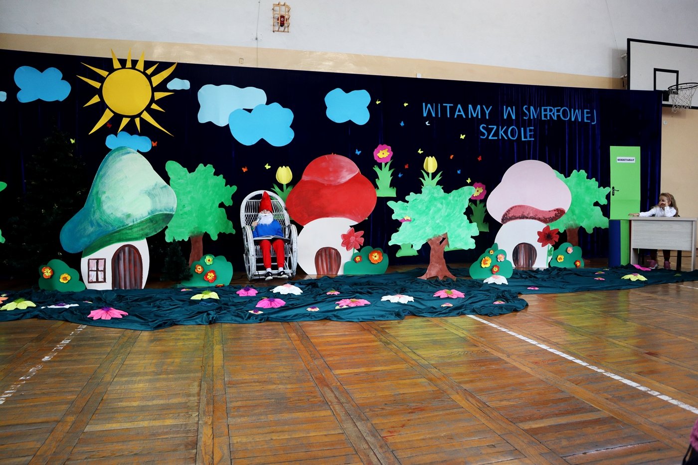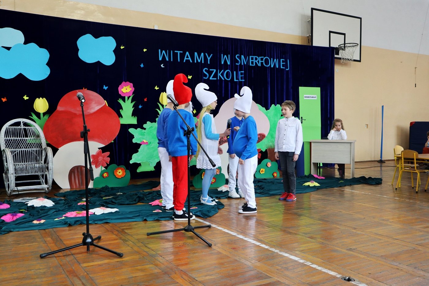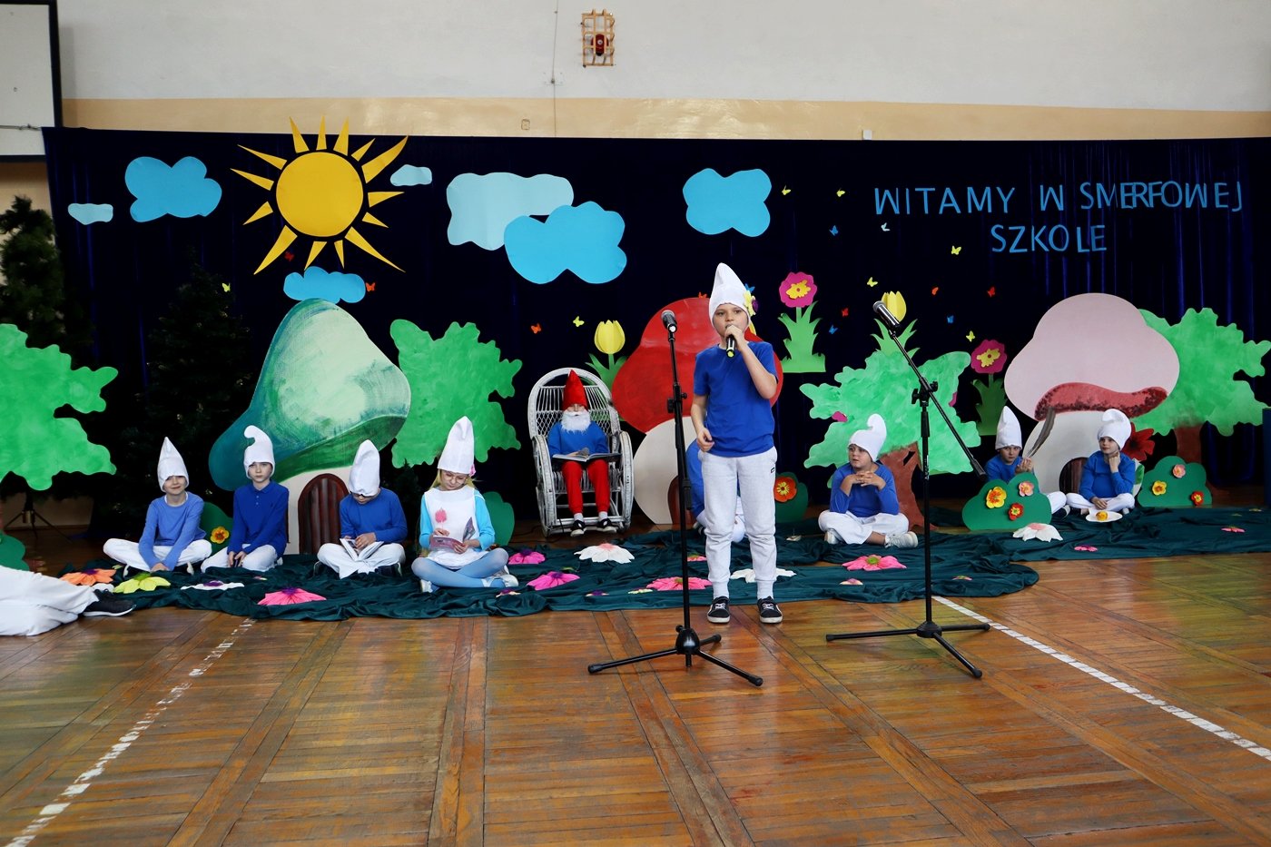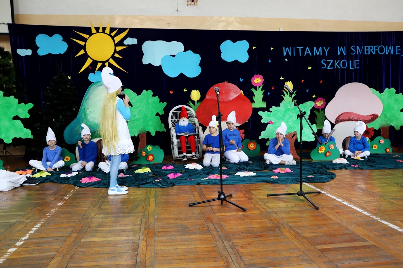 Dyrekcja, zaproszeni goście, nauczyciele i uczniowie spotkali się w sali gimnastycznej. Dyrektor Jan Majewski oraz pani Anna Kusz uroczyście powitali wszystkie dzieci, rodziców i zaprosili na część artystyczną wydarzenia. Zabrzmiała muzyka, na scenie pojawili się aktorzy, rozpoczęło się przedstawienie pt. „W smerfowej szkole”. Wspaniała gra i zaangażowanie naszych uczniów, bogata sceneria i oprawa muzyczna przeniosły na chwilę wszystkich do magicznej, smerfowej krainy. Kolejnymi artystami, którzy zaprezentowali swoje umiejętności taneczno- wokalne, a zrobili to popisowo, były uczennice Kółka Wokalnego, przygotowane przez panią Annę Tarnowską. Swoje zdolności wokalne wyśpiewali w języku angielskim uczniowie klasy III b. W piosence pt. „Shake your body” wykazali się nie tylko znajomością części ciała w obcym języku, ale też pokazali, że dobrze się przy tym bawią.
