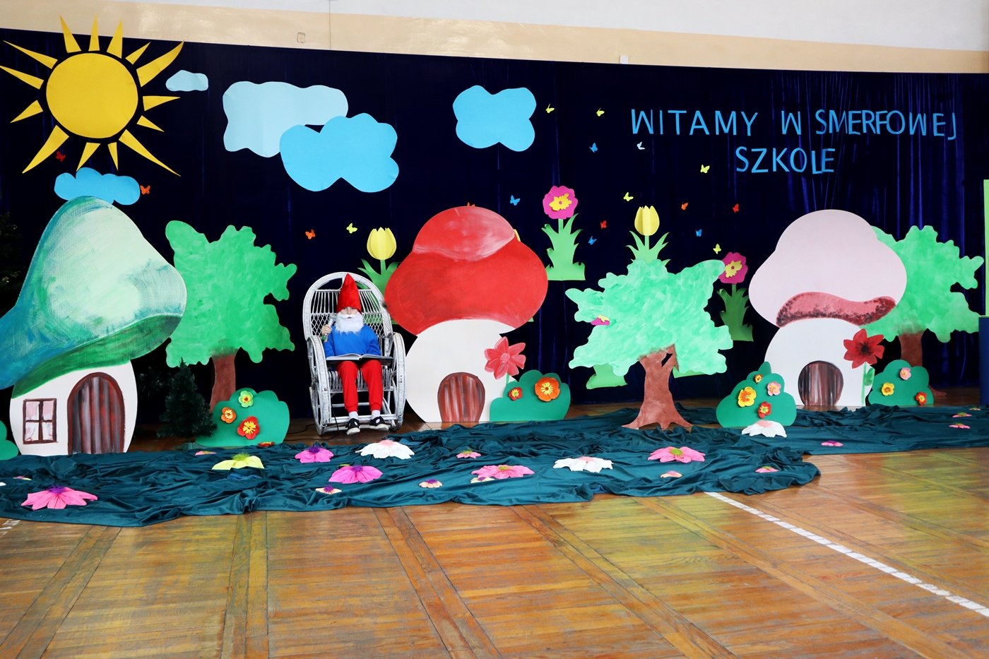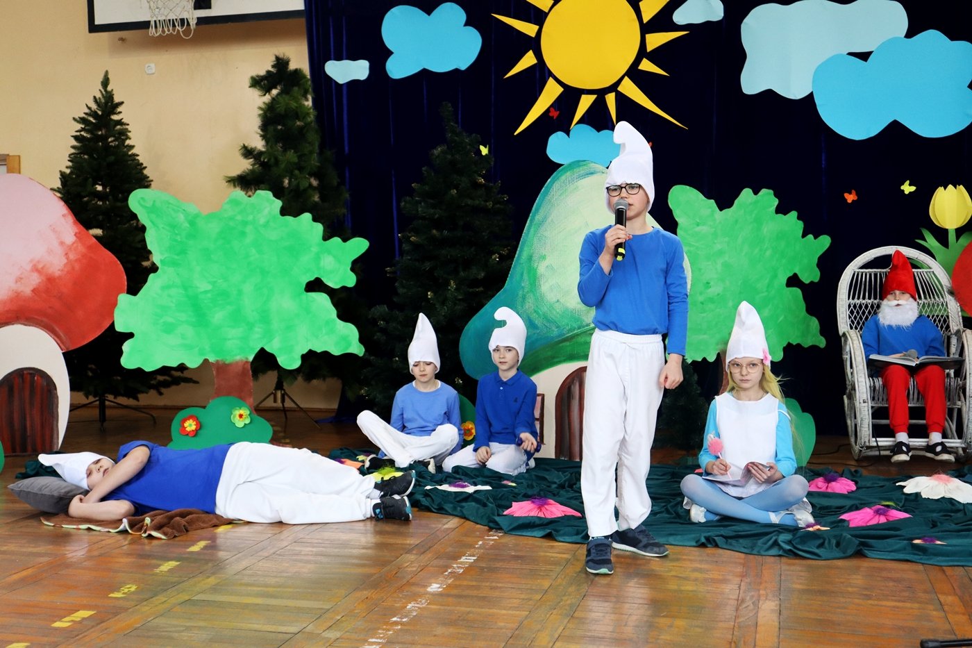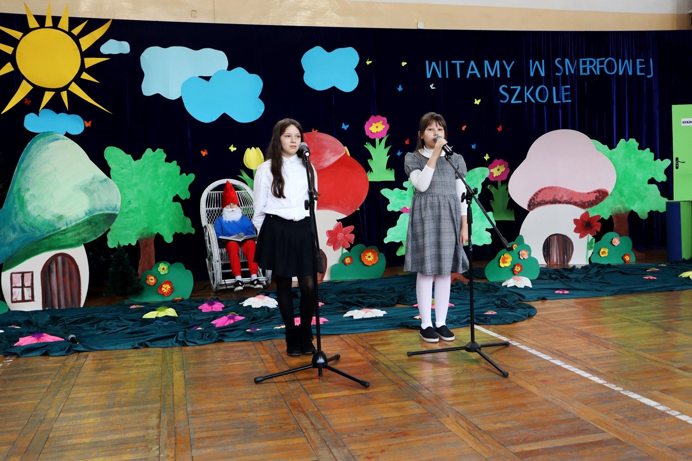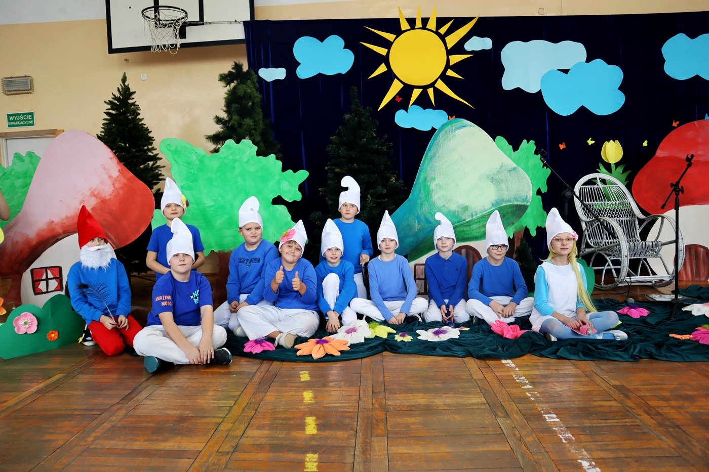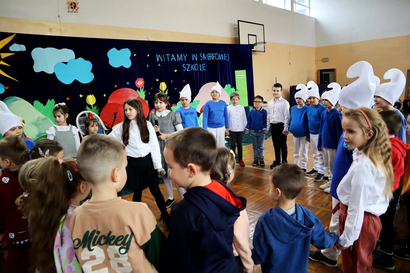 Dyrekcja, zaproszeni goście, nauczyciele i uczniowie spotkali się w sali gimnastycznej. Dyrektor Jan Majewski oraz pani Anna Kusz uroczyście powitali wszystkie dzieci, rodziców i zaprosili na część artystyczną wydarzenia. Zabrzmiała muzyka, na scenie pojawili się aktorzy, rozpoczęło się przedstawienie pt. „W smerfowej szkole”. Wspaniała gra i zaangażowanie naszych uczniów, bogata sceneria i oprawa muzyczna przeniosły na chwilę wszystkich do magicznej, smerfowej krainy. Kolejnymi artystami, którzy zaprezentowali swoje umiejętności taneczno- wokalne, a zrobili to popisowo, były uczennice Kółka Wokalnego, przygotowane przez panią Annę Tarnowską. Swoje zdolności wokalne wyśpiewali w języku angielskim uczniowie klasy III b. W piosence pt. „Shake your body” wykazali się nie tylko znajomością części ciała w obcym języku, ale też pokazali, że dobrze się przy tym bawią.