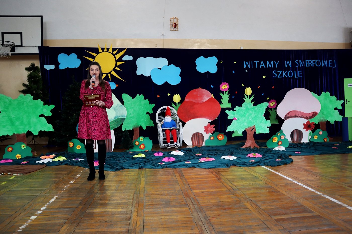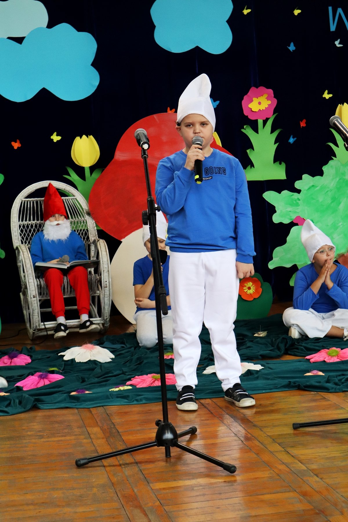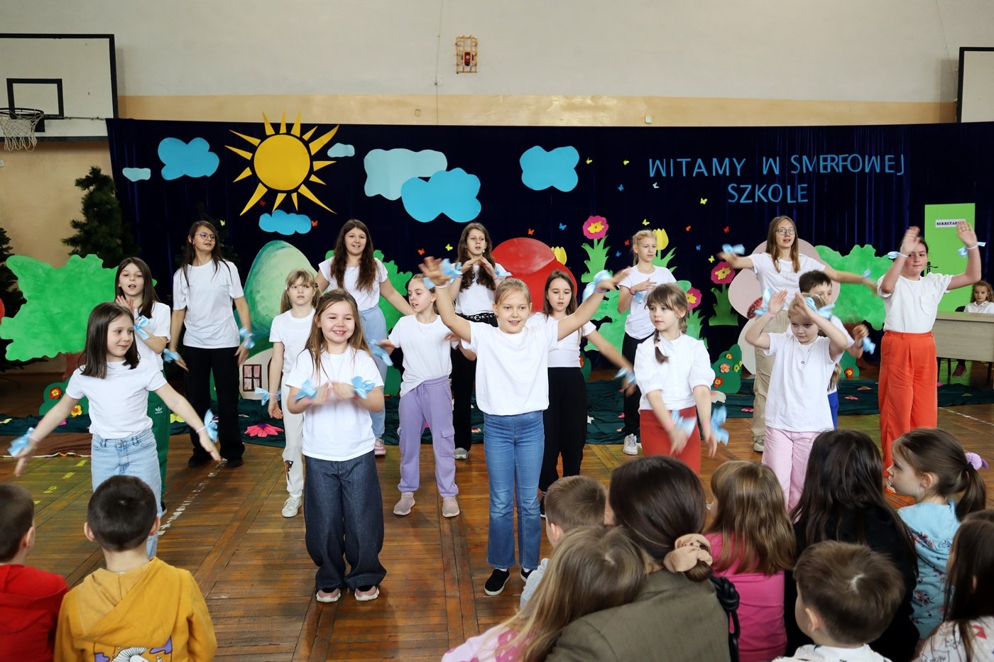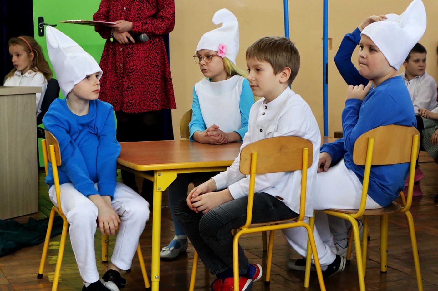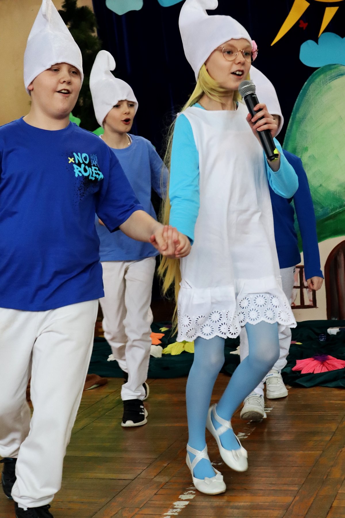 Dyrekcja, zaproszeni goście, nauczyciele i uczniowie spotkali się w sali gimnastycznej. Dyrektor Jan Majewski oraz pani Anna Kusz uroczyście powitali wszystkie dzieci, rodziców i zaprosili na część artystyczną wydarzenia. Zabrzmiała muzyka, na scenie pojawili się aktorzy, rozpoczęło się przedstawienie pt. „W smerfowej szkole”. Wspaniała gra i zaangażowanie naszych uczniów, bogata sceneria i oprawa muzyczna przeniosły na chwilę wszystkich do magicznej, smerfowej krainy. Kolejnymi artystami, którzy zaprezentowali swoje umiejętności taneczno- wokalne, a zrobili to popisowo, były uczennice Kółka Wokalnego, przygotowane przez panią Annę Tarnowską. Swoje zdolności wokalne wyśpiewali w języku angielskim uczniowie klasy III b. W piosence pt. „Shake your body” wykazali się nie tylko znajomością części ciała w obcym języku, ale też pokazali, że dobrze się przy tym bawią.