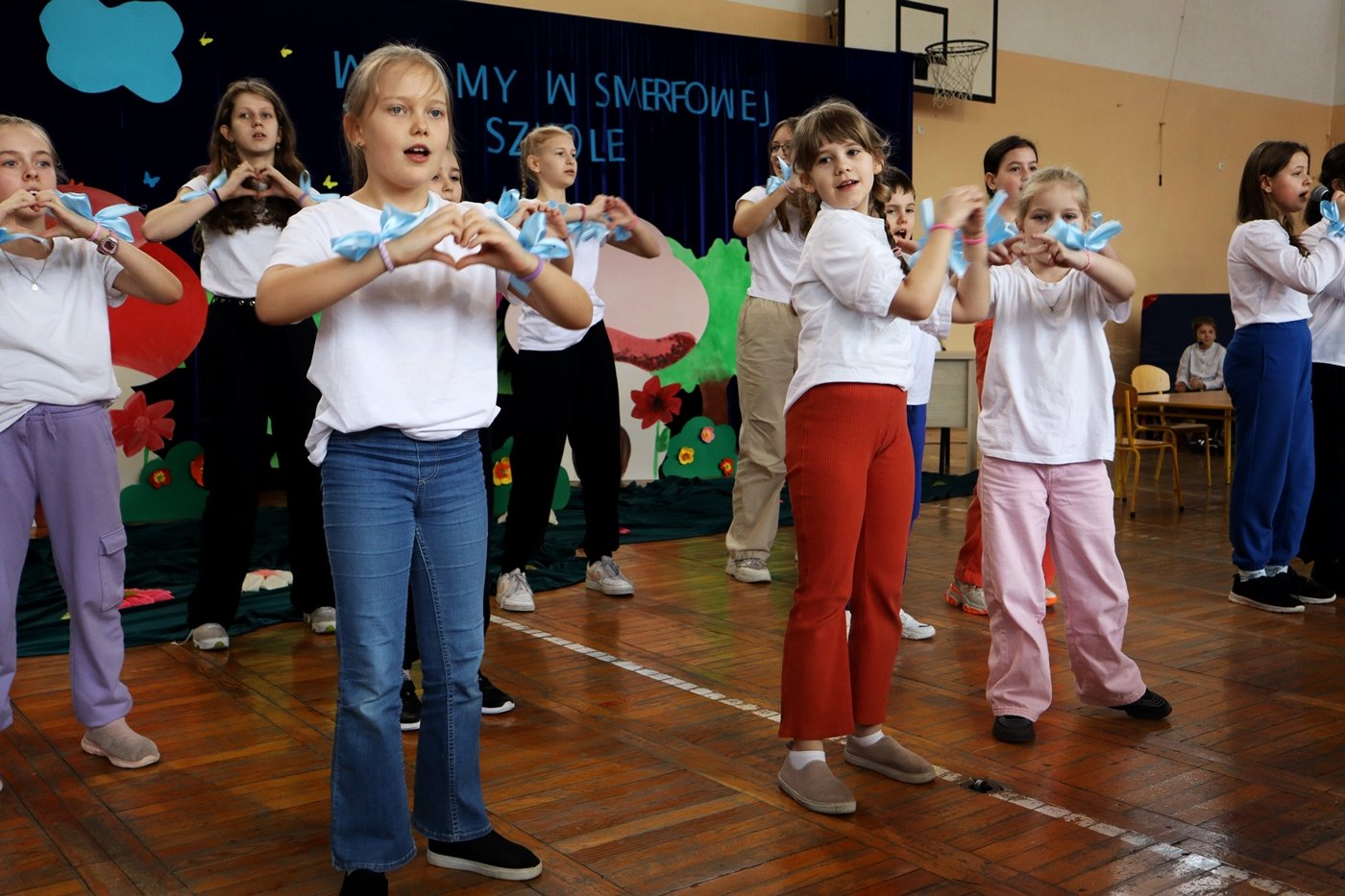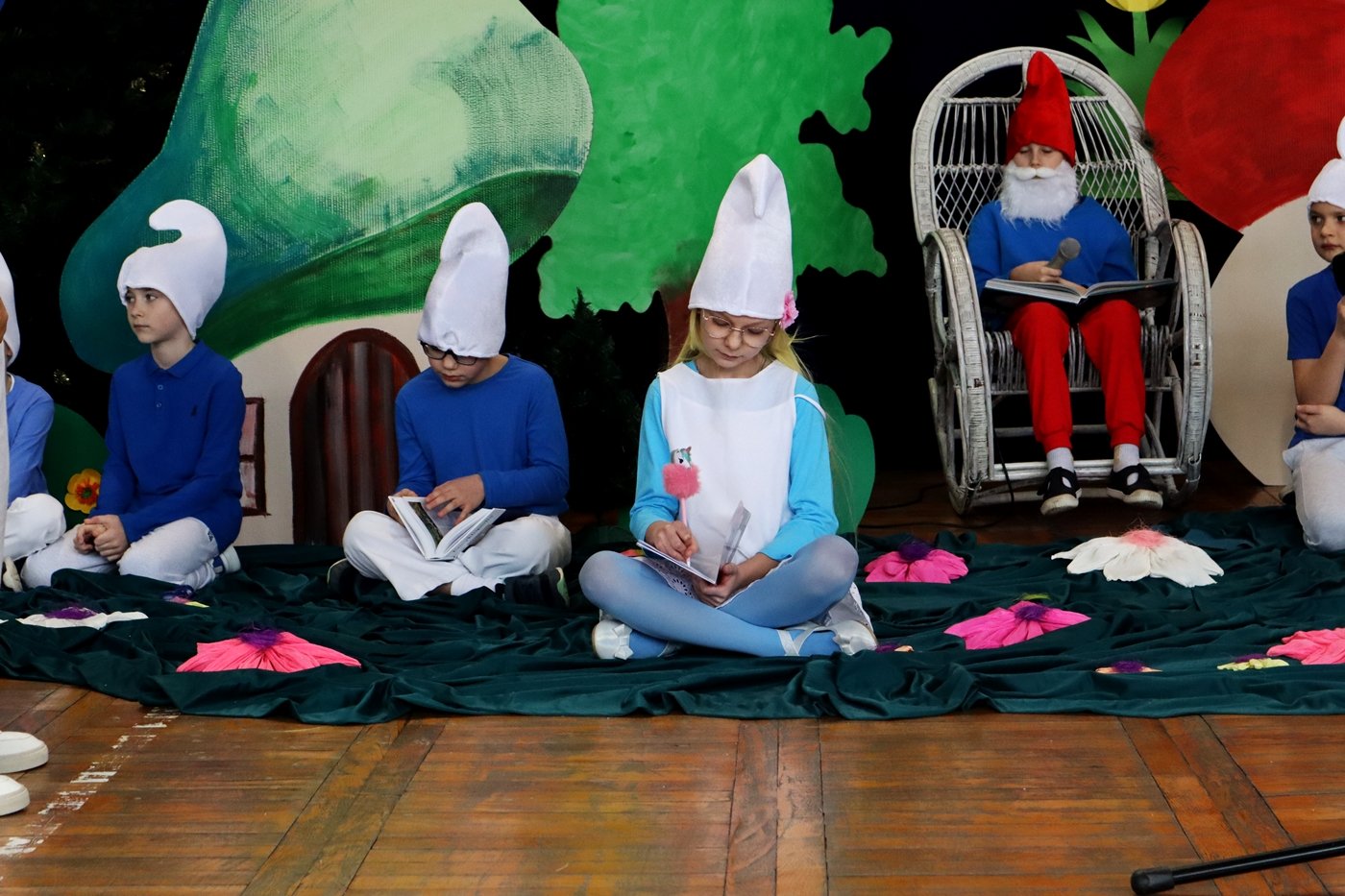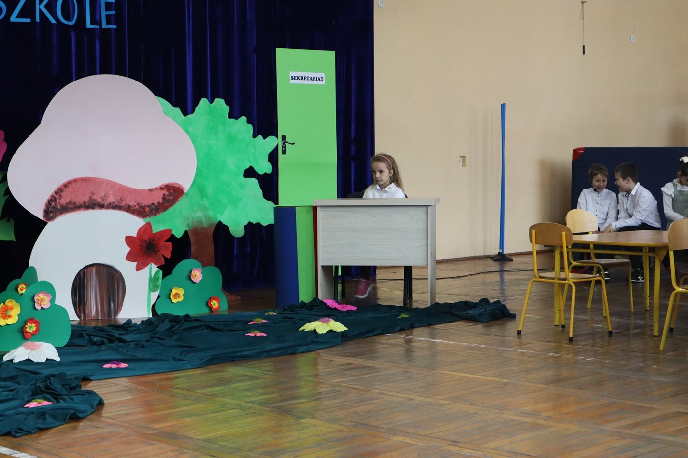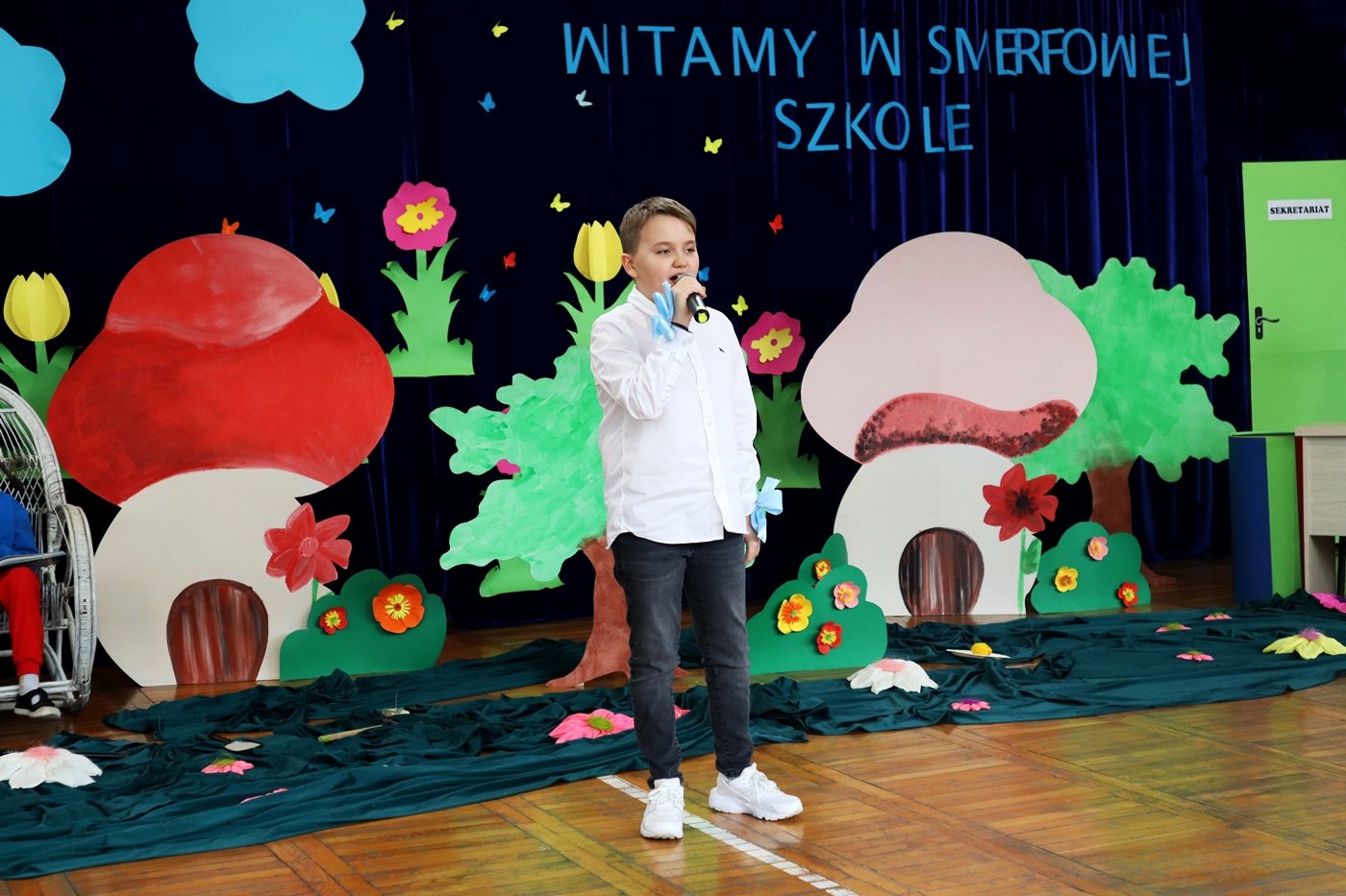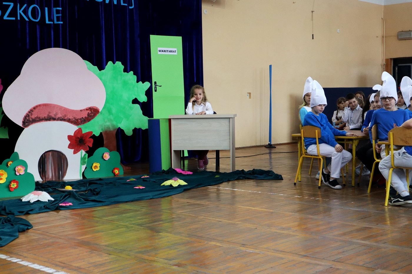Dyrekcja, zaproszeni goście, nauczyciele i uczniowie spotkali się w sali gimnastycznej. Dyrektor Jan Majewski oraz pani Anna Kusz uroczyście powitali wszystkie dzieci, rodziców i zaprosili na część artystyczną wydarzenia. Zabrzmiała muzyka, na scenie pojawili się aktorzy, rozpoczęło się przedstawienie pt. „W smerfowej szkole”. Wspaniała gra i zaangażowanie naszych uczniów, bogata sceneria i oprawa muzyczna przeniosły na chwilę wszystkich do magicznej, smerfowej krainy. Kolejnymi artystami, którzy zaprezentowali swoje umiejętności taneczno- wokalne, a zrobili to popisowo, były uczennice Kółka Wokalnego, przygotowane przez panią Annę Tarnowską. Swoje zdolności wokalne wyśpiewali w języku angielskim uczniowie klasy III b. W piosence pt. „Shake your body” wykazali się nie tylko znajomością części ciała w obcym języku, ale też pokazali, że dobrze się przy tym bawią.