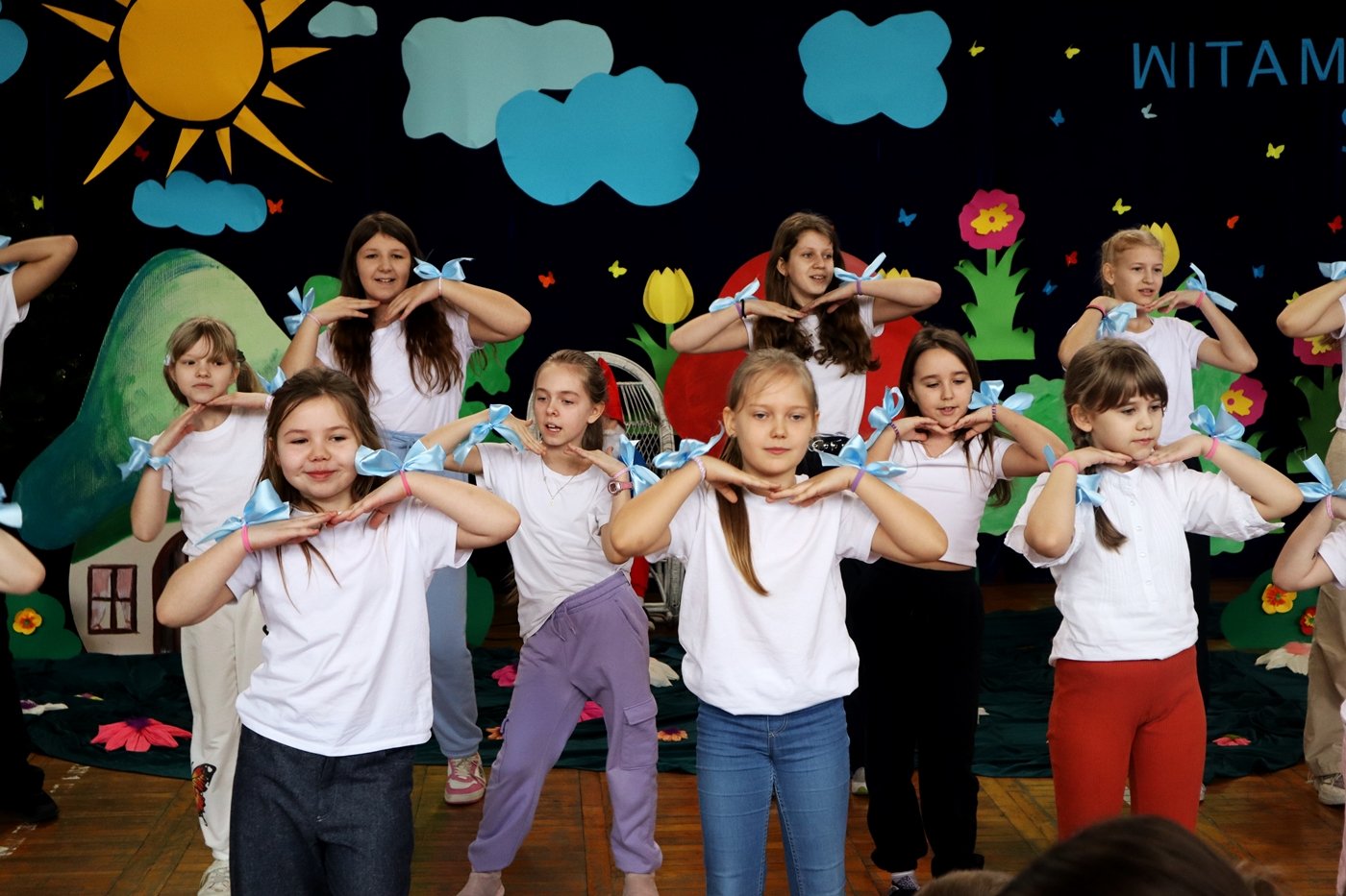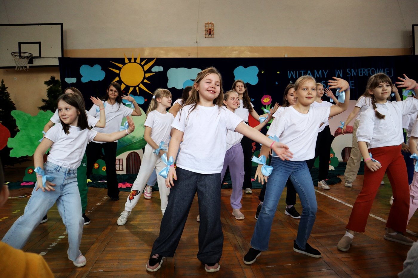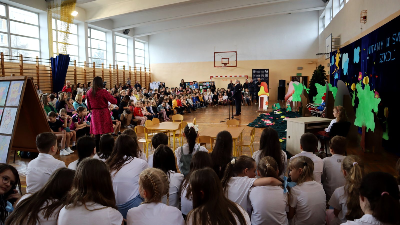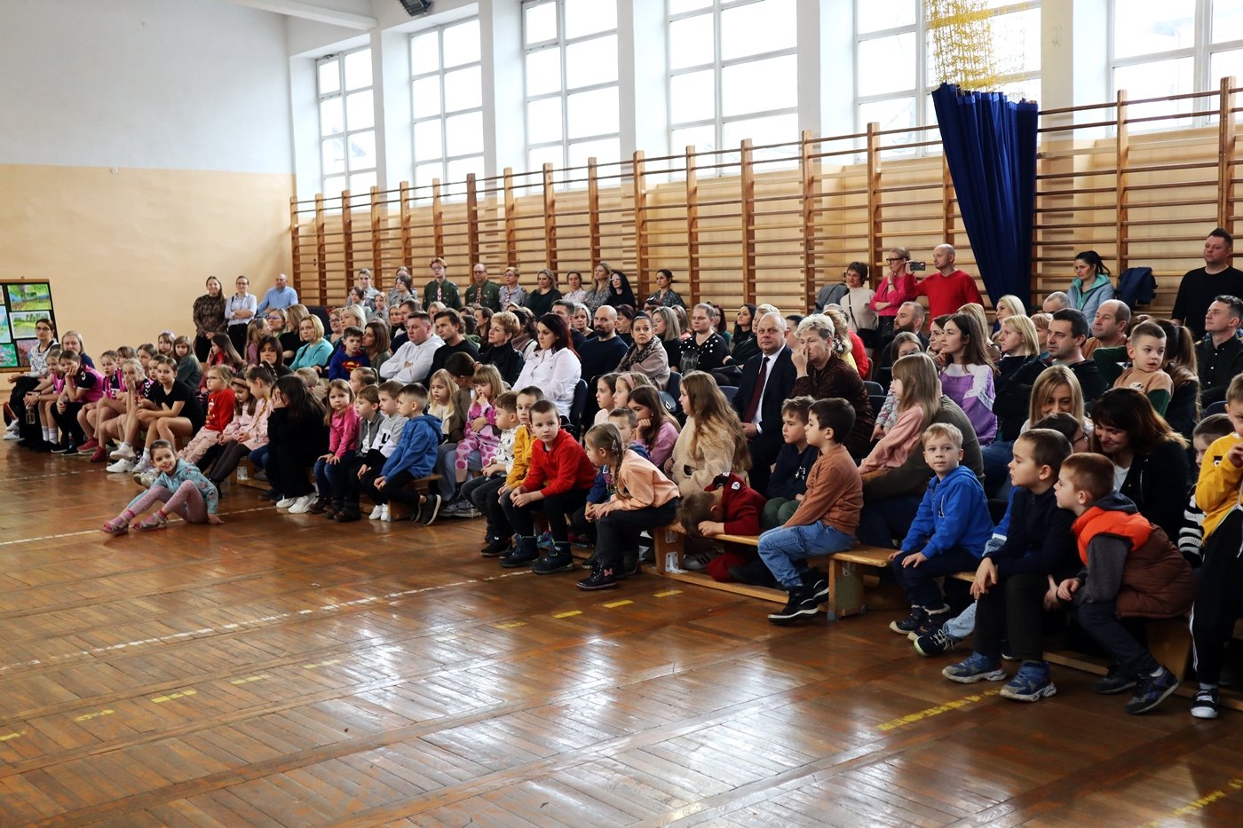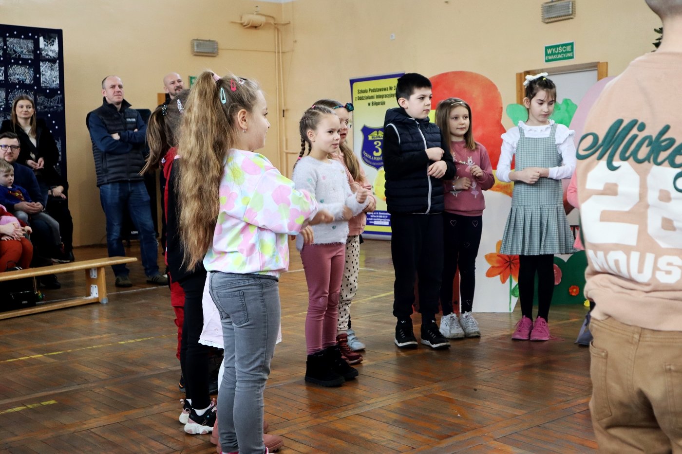 Dyrekcja, zaproszeni goście, nauczyciele i uczniowie spotkali się w sali gimnastycznej. Dyrektor Jan Majewski oraz pani Anna Kusz uroczyście powitali wszystkie dzieci, rodziców i zaprosili na część artystyczną wydarzenia. Zabrzmiała muzyka, na scenie pojawili się aktorzy, rozpoczęło się przedstawienie pt. „W smerfowej szkole”. Wspaniała gra i zaangażowanie naszych uczniów, bogata sceneria i oprawa muzyczna przeniosły na chwilę wszystkich do magicznej, smerfowej krainy. Kolejnymi artystami, którzy zaprezentowali swoje umiejętności taneczno- wokalne, a zrobili to popisowo, były uczennice Kółka Wokalnego, przygotowane przez panią Annę Tarnowską. Swoje zdolności wokalne wyśpiewali w języku angielskim uczniowie klasy III b. W piosence pt. „Shake your body” wykazali się nie tylko znajomością części ciała w obcym języku, ale też pokazali, że dobrze się przy tym bawią.