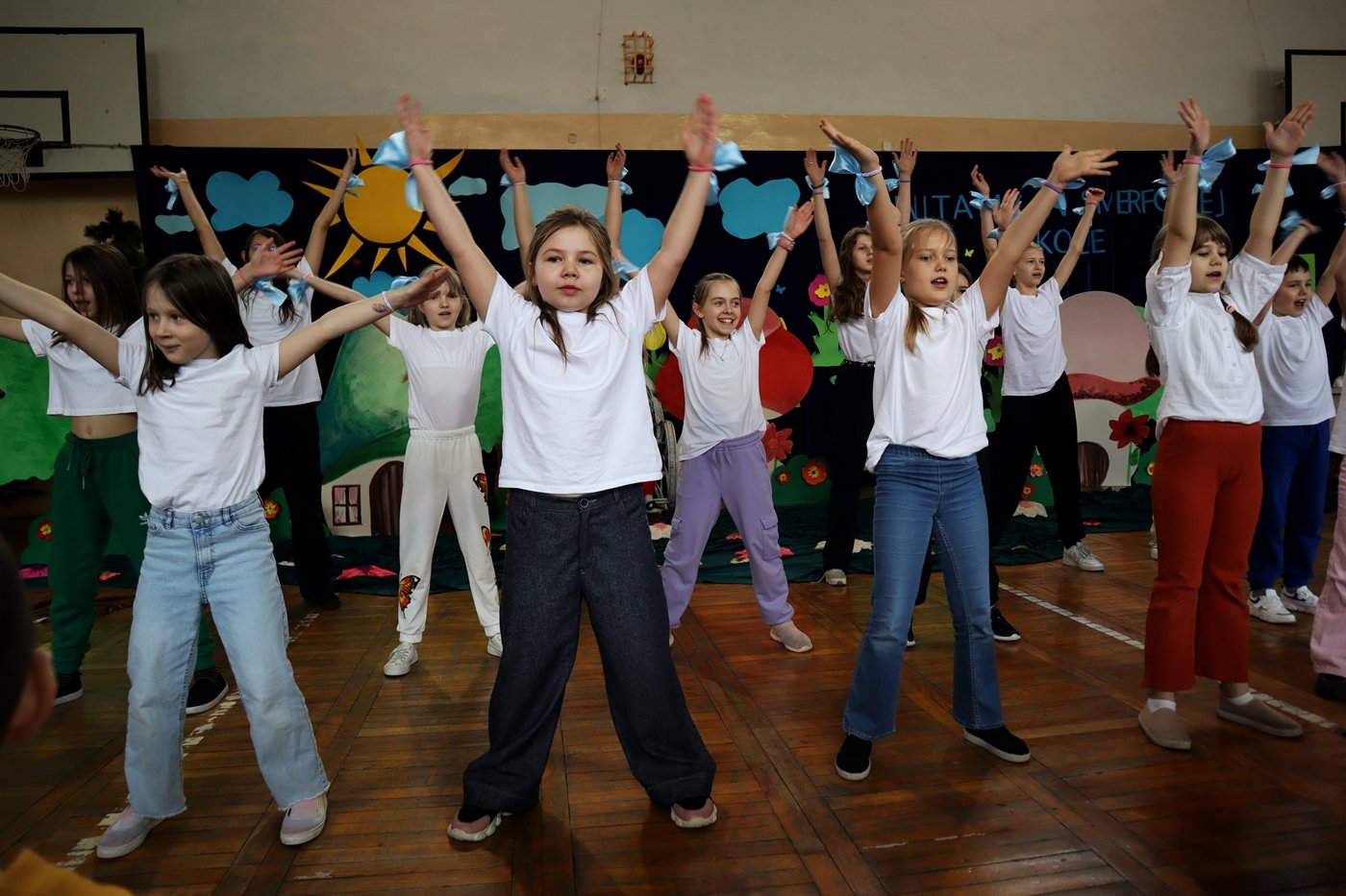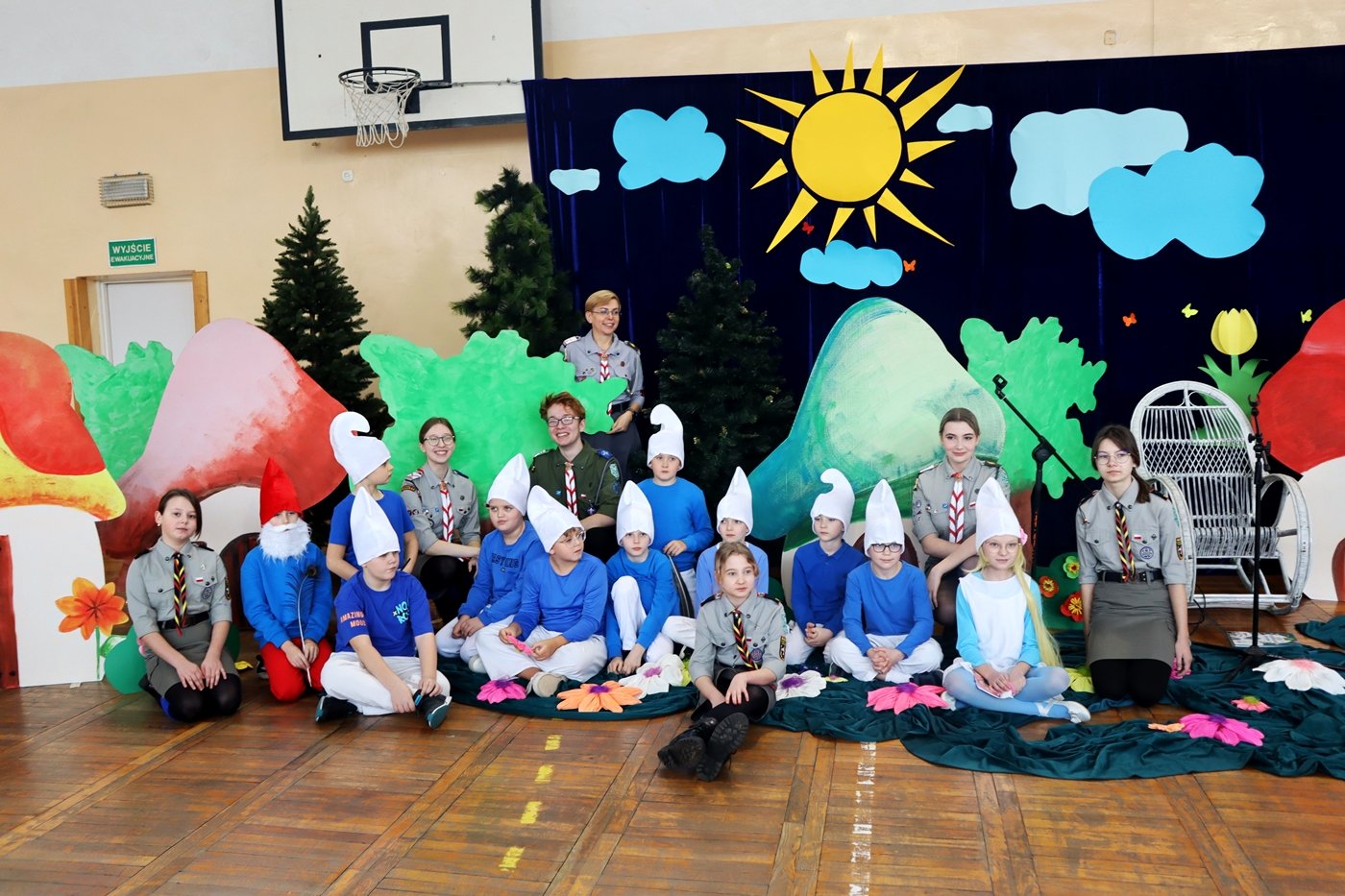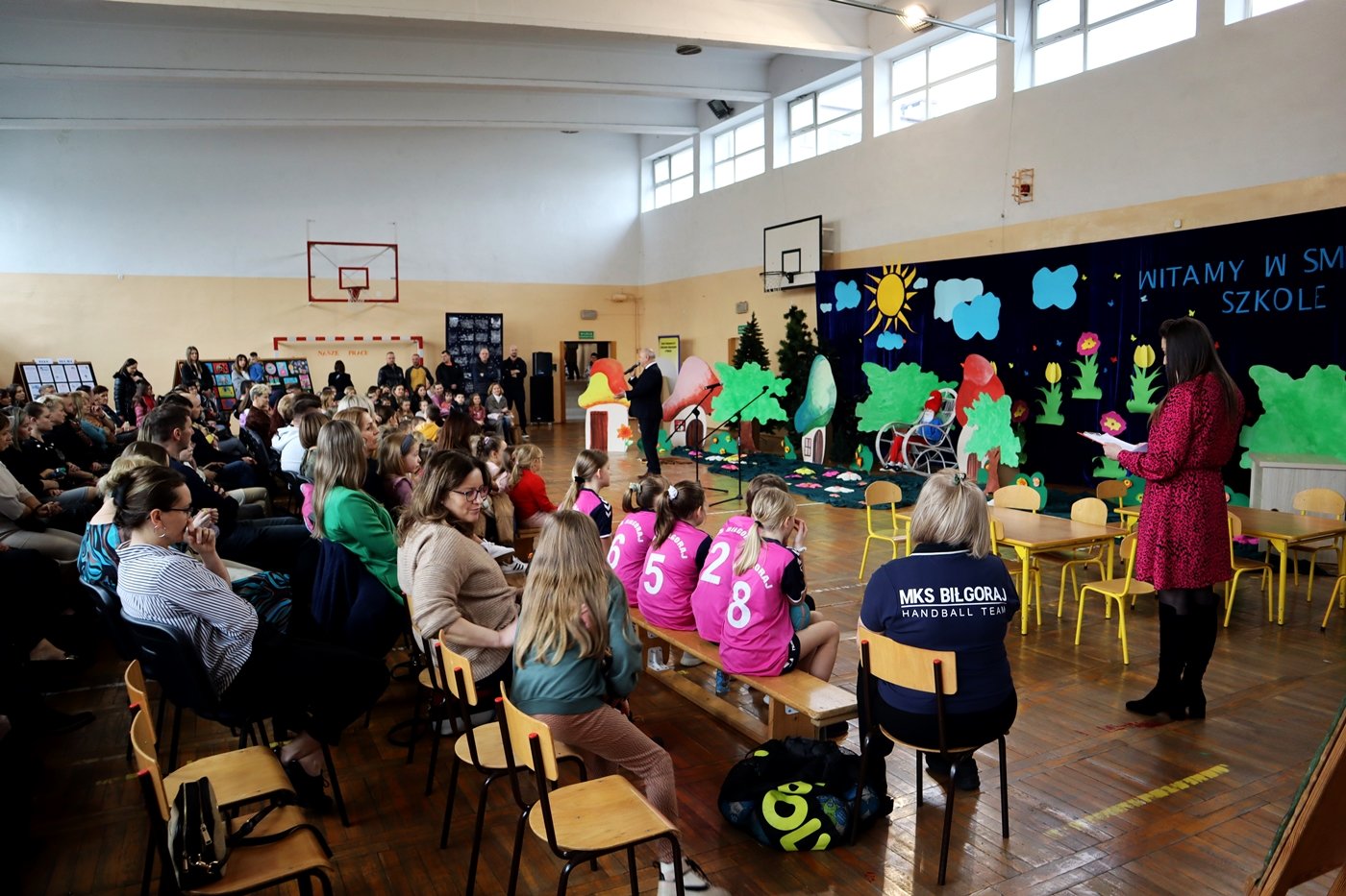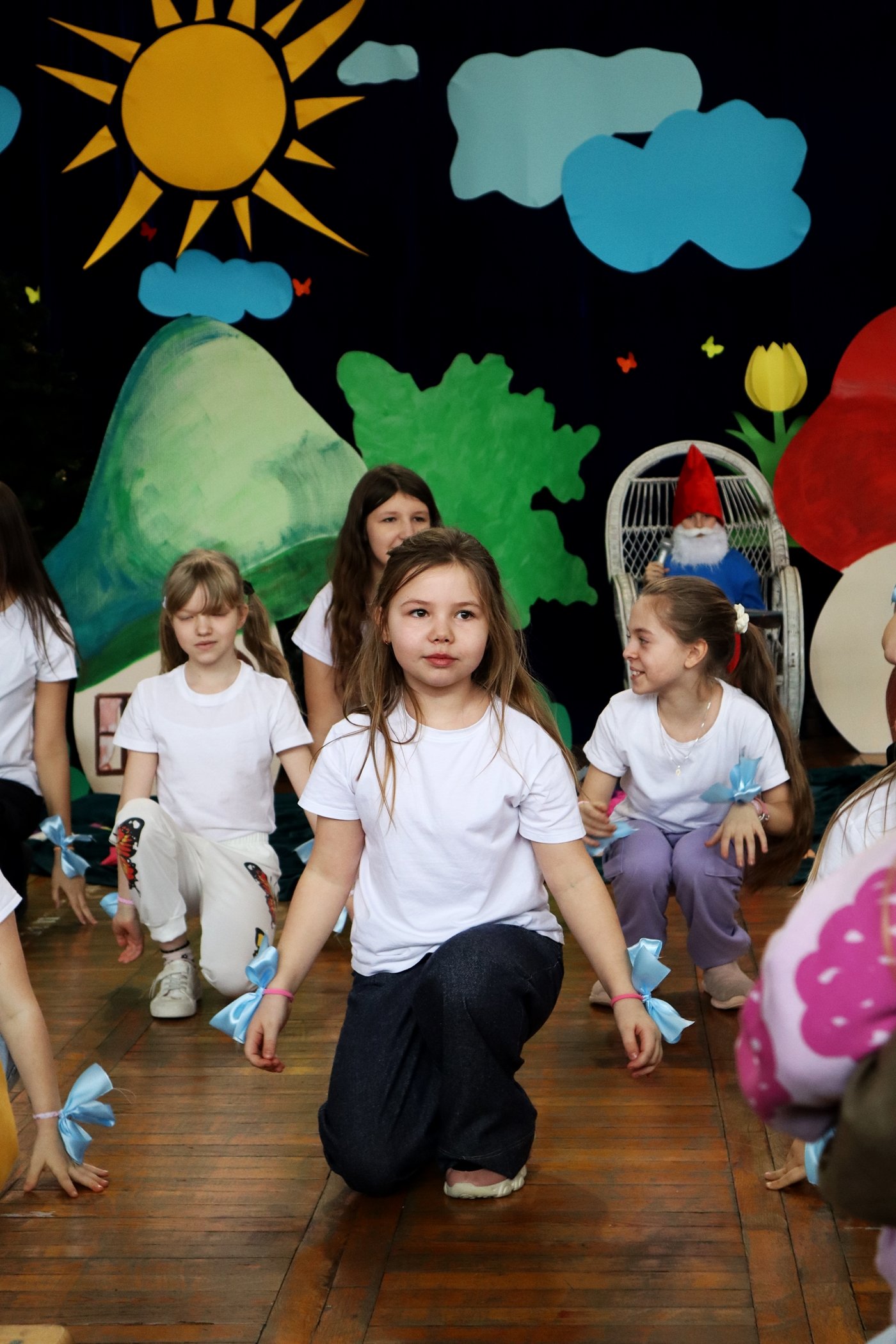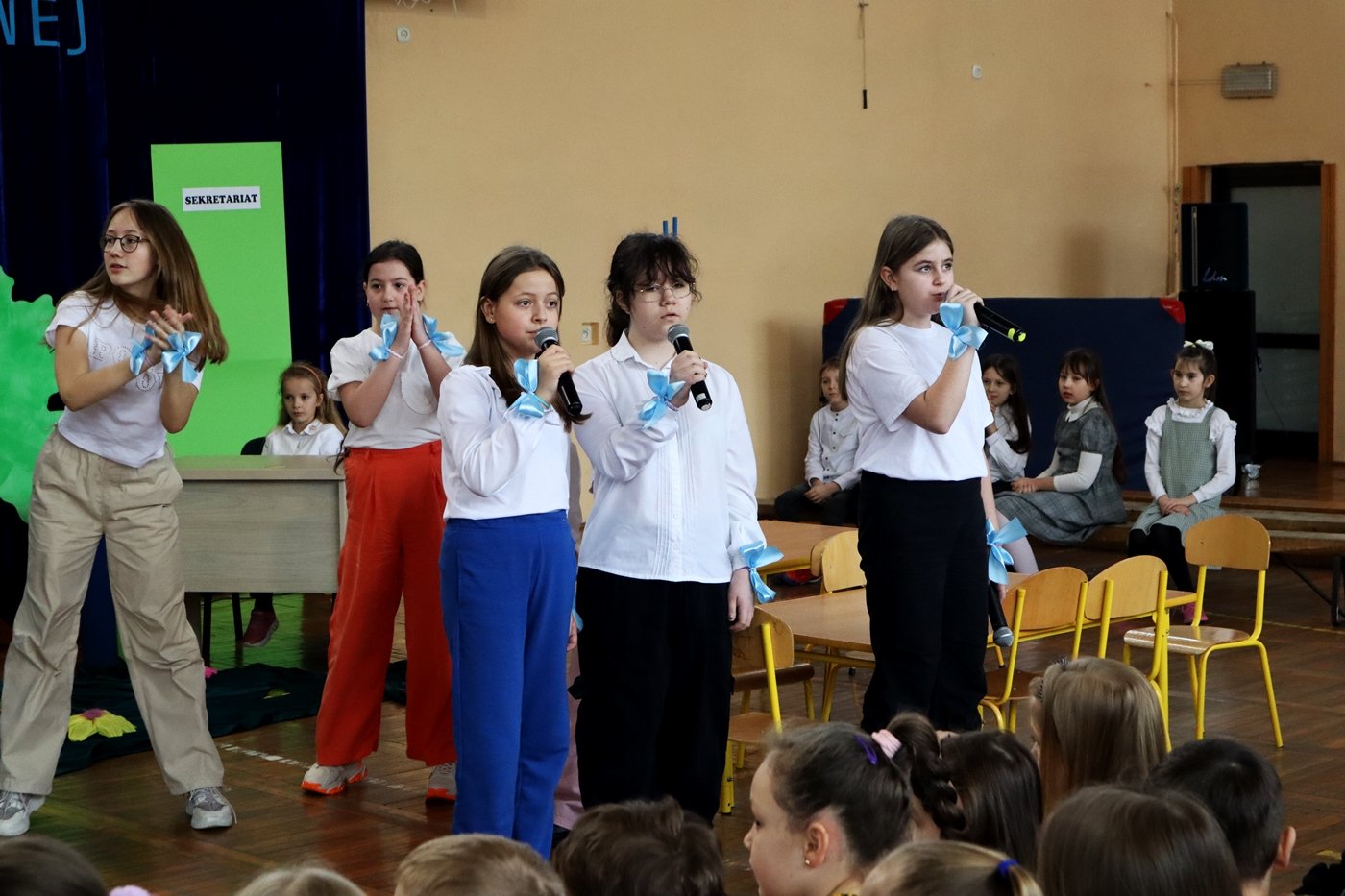 Dyrekcja, zaproszeni goście, nauczyciele i uczniowie spotkali się w sali gimnastycznej. Dyrektor Jan Majewski oraz pani Anna Kusz uroczyście powitali wszystkie dzieci, rodziców i zaprosili na część artystyczną wydarzenia. Zabrzmiała muzyka, na scenie pojawili się aktorzy, rozpoczęło się przedstawienie pt. „W smerfowej szkole”. Wspaniała gra i zaangażowanie naszych uczniów, bogata sceneria i oprawa muzyczna przeniosły na chwilę wszystkich do magicznej, smerfowej krainy. Kolejnymi artystami, którzy zaprezentowali swoje umiejętności taneczno- wokalne, a zrobili to popisowo, były uczennice Kółka Wokalnego, przygotowane przez panią Annę Tarnowską. Swoje zdolności wokalne wyśpiewali w języku angielskim uczniowie klasy III b. W piosence pt. „Shake your body” wykazali się nie tylko znajomością części ciała w obcym języku, ale też pokazali, że dobrze się przy tym bawią.