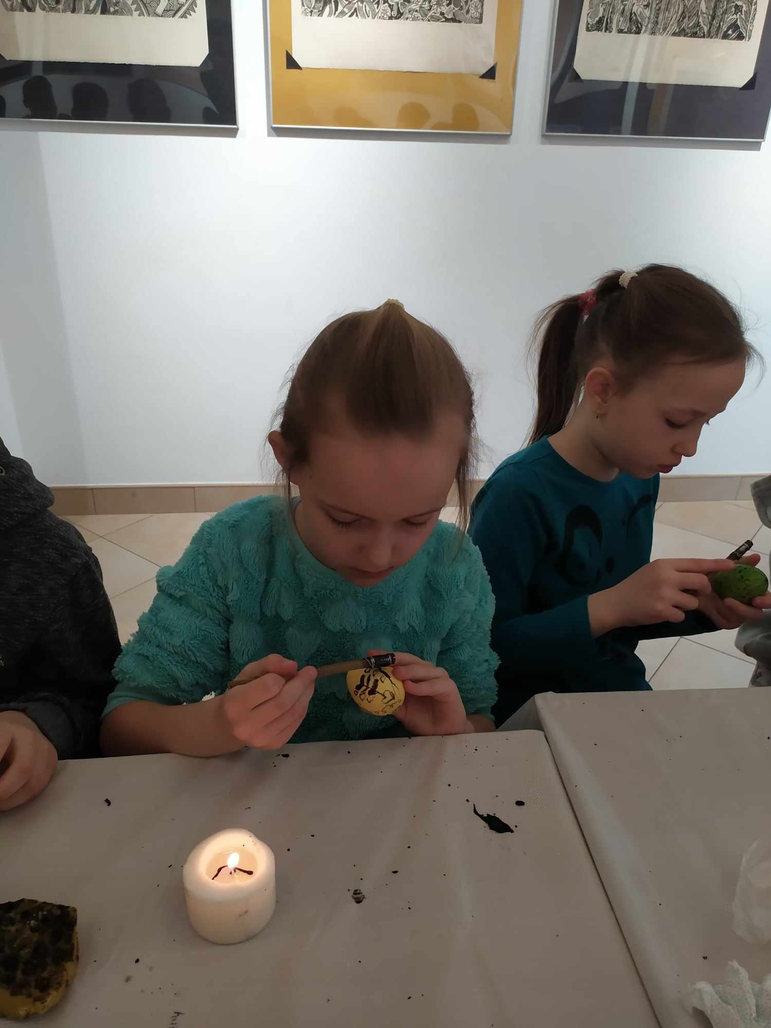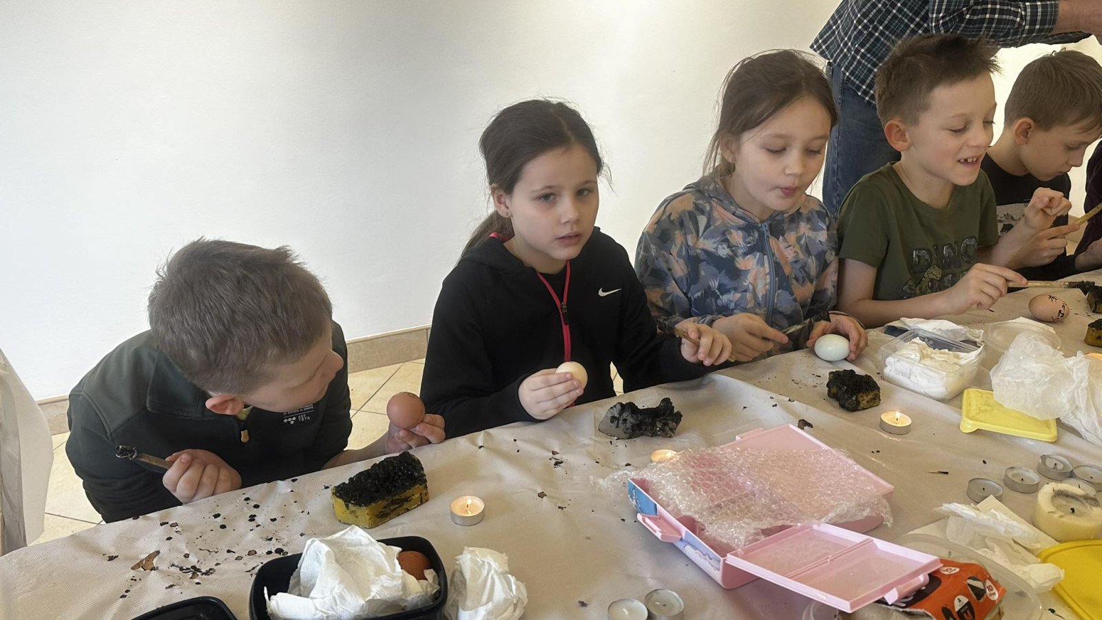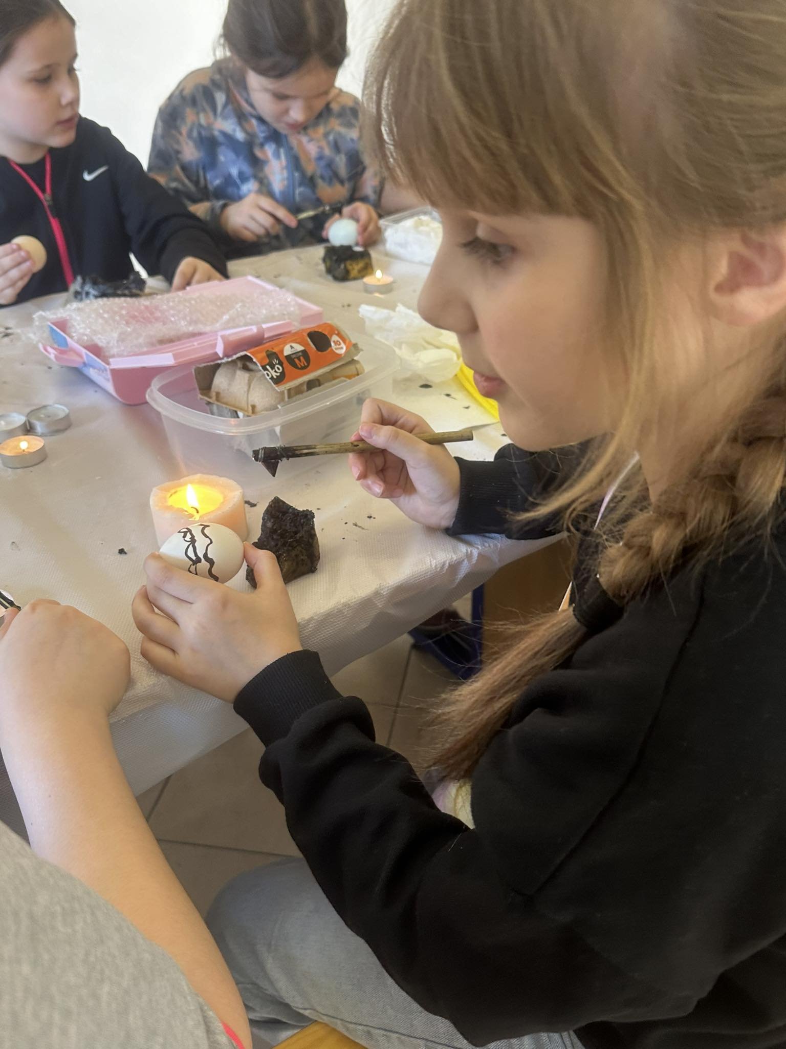 Nasi uczniowie z klasy 2a i 1b mieli okazję poznać najstarszą technikę tworzenia pisanek, dzięki uprzejmości Muzeum Ziemi Biłgorajskiej w Biłgoraju. Na specjalnie przygotowanych dla nich warsztatach rysowali roztopionym woskiem po jajku, następnie zanurzali w barwniku. Jako narzędzi do pisania używali patyków, które zakończone były ostrym metalowym elementem, aby powstałe linie na pisance były cienkie i estetyczne. Powstało wiele pięknych i efektownych pisanek.