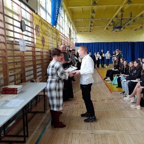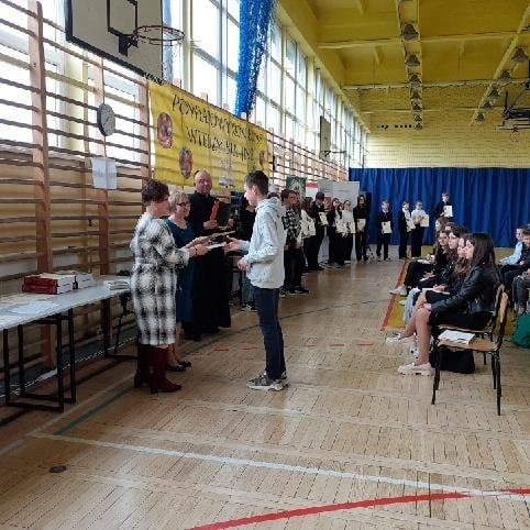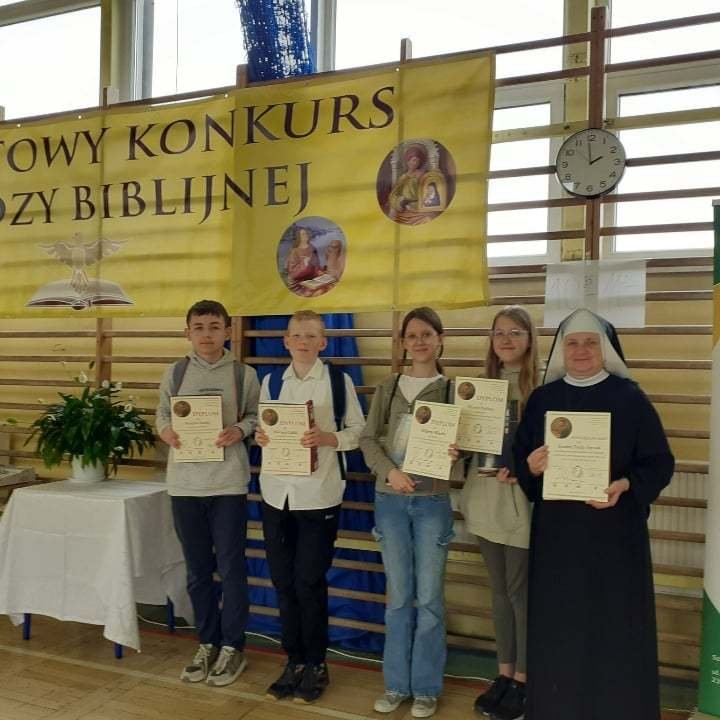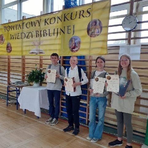 W dniu 23.04.24 r. w Szkole Podstawowej nr 5 im. Księdza Jana Twardowskiego odbyły się eliminacje VII Powiatowego Konkursu Wiedzy Biblijnej z Ewangelii św. Łukasza. Maciej Gałka z kl. VII d zajął I miejsce, a Kacper Socha z kl. VII c zajął III miejsce. W eliminacjach reprezentowały naszą szkołę także Oliwia Pytlarz z kl. VI c i Milena Blacha z kl. VI c. Maciej Gałka podczas warsztatów biblijnych zadziwiał wszystkich posiadaną wiedzą na temat Ziemi Świętej- Ojczyzny Chrystusa i wydarzeń biblijnych zamieszczonych w Ewangelii św. Łukasza.
