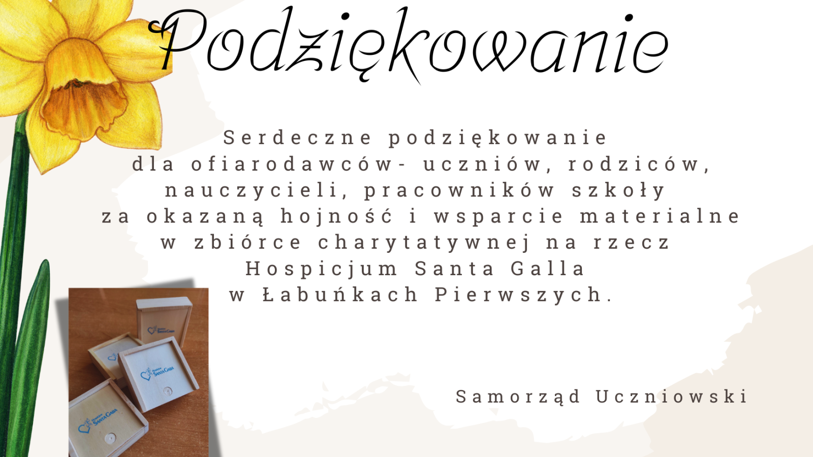 Samorząd Uczniowski naszej szkoły przeprowadził akcję charytatywną na rzecz Hospicjum Santa Galla w Łabuńkach Pierwszych. Osoby, które wsparły zbiórkę kwotą min. 10 zł otrzymały grę logiczną "Kółko krzyżyk". W sumie, dzięki hojności uczniów, ich rodziców, nauczycieli oraz pracowników szkoły, udało się zebrać kwotę 2142,47zł. Serdecznie dziękujemy wszystkim ofiarodawcom. Zapewniamy, że to nie jest ostatnia akcja charytatywna w naszej szkole, bo jak powiedział św. Jan Paweł II „Tam, gdzie jest człowiek cierpiący, musi znaleźć się człowiek, który otoczy cierpiącego wsparciem”.