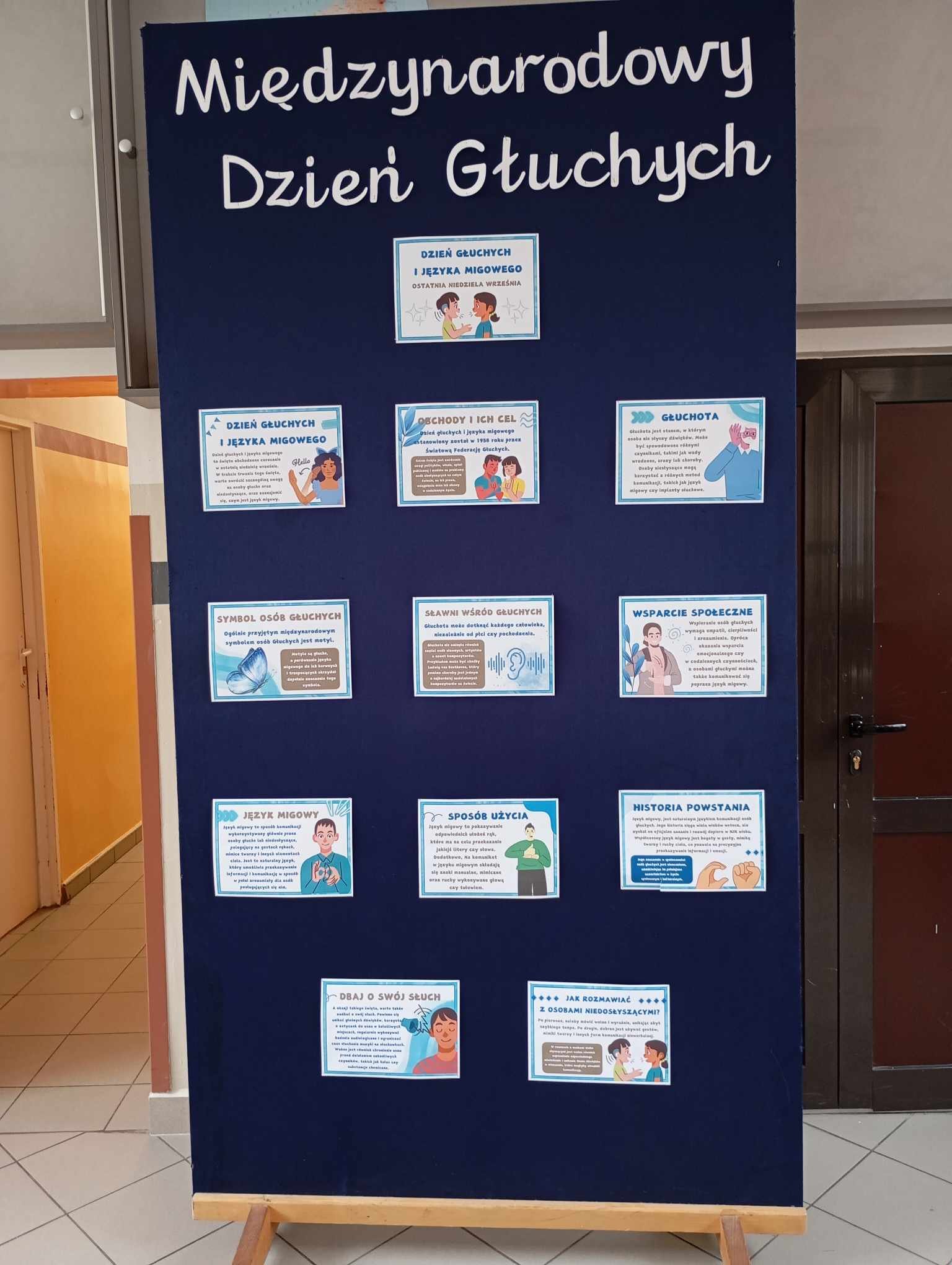 Dzieci obejrzały film o tematyce związanej z językiem migowym oraz na temat osób niedosłyszących. W ramach zwiększania świadomości społecznej na korytarzu w naszej szkole powstała gazetka z informacjami na ten temat. Kolejnym punktem tego dnia były zajęcia świetlicowe, podczas których uczniowie wysłuchali opowiadania pt. „Tajne znaki” oraz „Szymon i kosmiczne aparaty”, poznali pojęcia i ciekawostki dotyczące głuchoty i niedosłuchu, symbole osób głuchych, zasady zachowania wobec osób niedosłyszących i wykonali pracę plastyczną „Niebieski motyl”. Niezwykle ciekawym doświadczeniem była zabawa spostrzegawcza „Co mówię”- czytanie z ruchu warg.