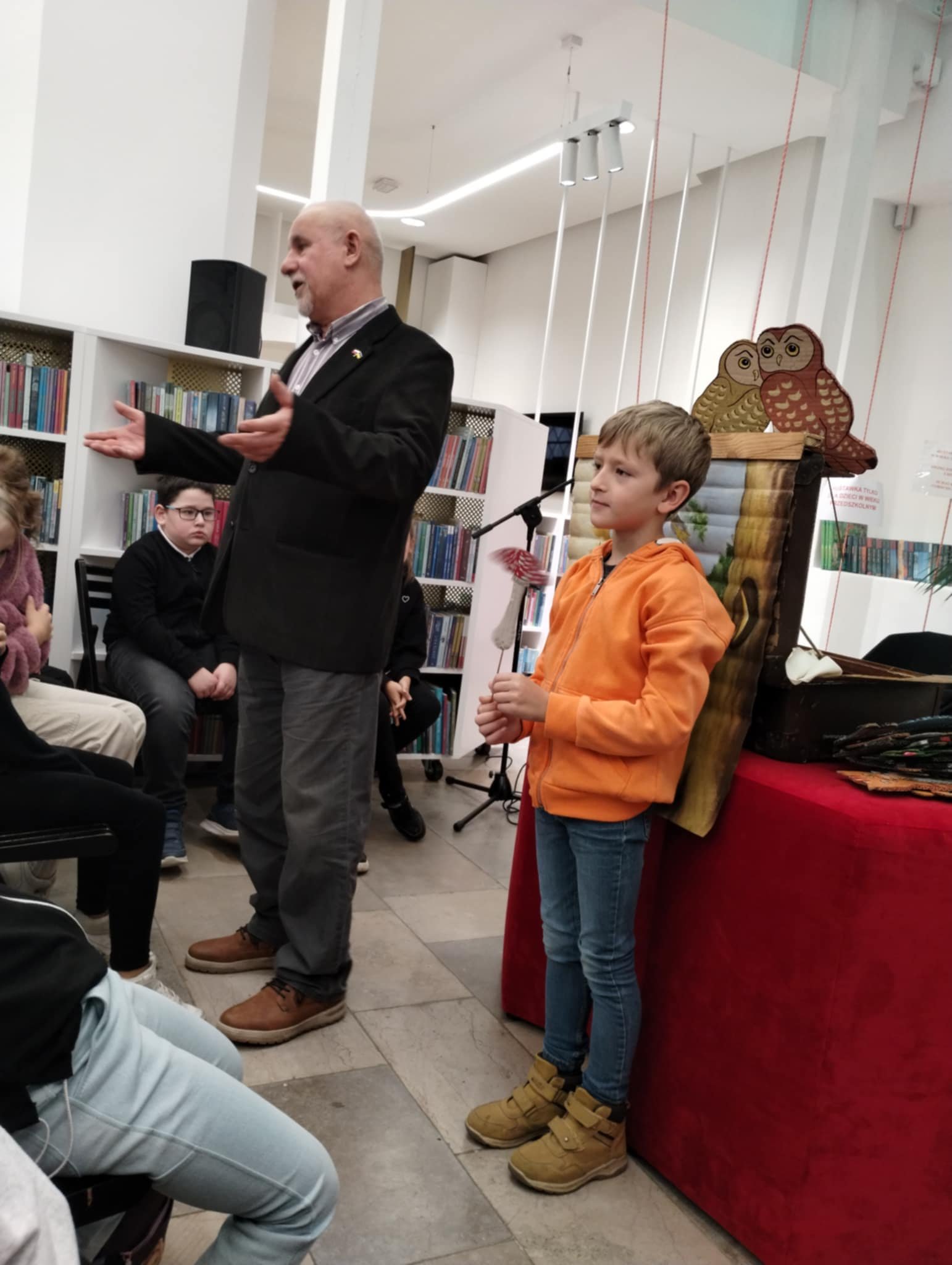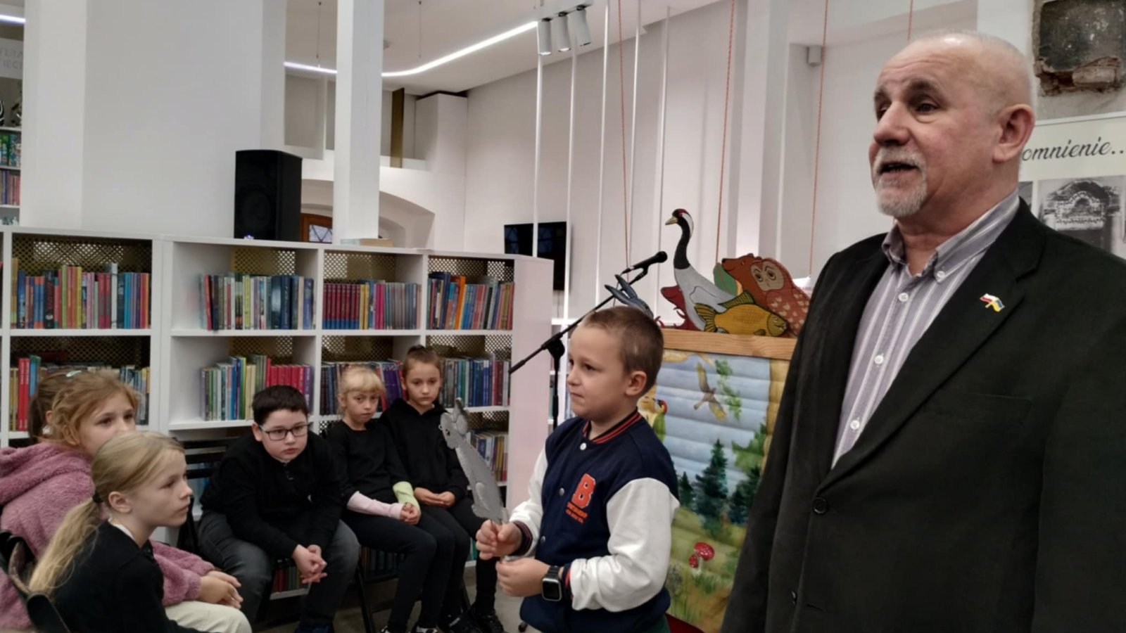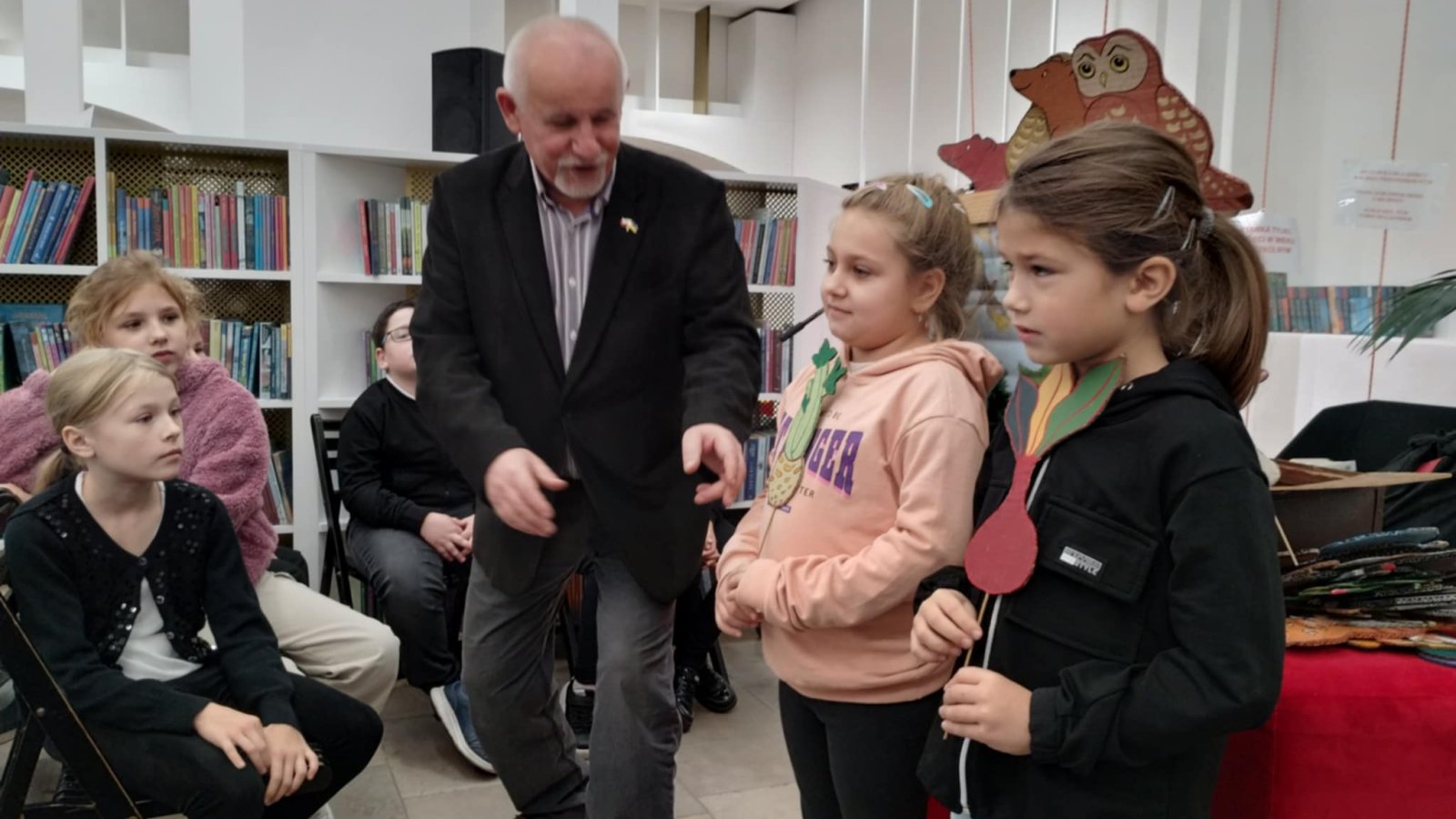 Spotkanie miało miejsce w Miejskiej Bibliotece Publicznej w Tarnogrodzie. Odrestaurowana biblioteka mieszcząca się w zabytkowej synagodze i znajdujące się w niej Muzeum Nożyczek zrobiły na nas ogromne wrażenie. Spotkanie autorskie przebiegało w bardzo przyjemnej atmosferze. Dowiedzieliśmy się kim jest poeta, ile autor napisał wierszy i opowiadań, czy ciężko się pisze wiersze. Na zaproszenie Pana Dimitrocy kilkoro z nas mogło wziąć udział w inscenizacji wiersza, prezentując pacynki – bohaterów wierszy wykonanych przez Panią Magdalenę – żonę pisarza.