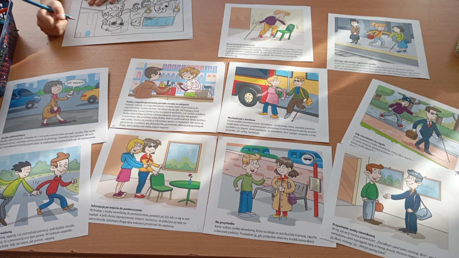 W ramach projektu edukacyjnego „Jak mówić o niepełnosprawności?” zrealizowaliśmy kolejne zadanie. Wychowankowie świetlicy szkolnej mieli okazję wielozmysłowo poznać zagadnienia związane z tematyką niepełnosprawności wzroku. Pierwszym etapem była projekcja filmu edukacyjnego pt. N jak niewidomy, czyli ja pomóc osobie z dysfunkcją wzroku, którego celem było przybliżenie różnych aspektów tej niepełnosprawności. Następnie uczniowie wysłuchali opowiadania W świecie ciemności. Ponadto dzieci dowiedziały się, że pies to nie tylko najlepszy przyjaciel człowieka, ale może być także wspaniałym i nieocenionym towarzyszem oraz przewodnikiem osoby niewidomej. Uczniowie poznali także historię i przeznaczenie białej laski oraz pokonywały trudności napotkane na drodze z zamkniętymi oczami i wiemy już, że osobom niewidomym nie jest łatwo. Końcowym elementem zajęć było przygotowanie przez uczniów pracy plastycznej „ Pies przewodnik”. Jak co miesiąc koordynatorzy projektu przygotowali informacyjną gazetkę na korytarzu szkolnym, przybliżającą tematykę tego dnia.