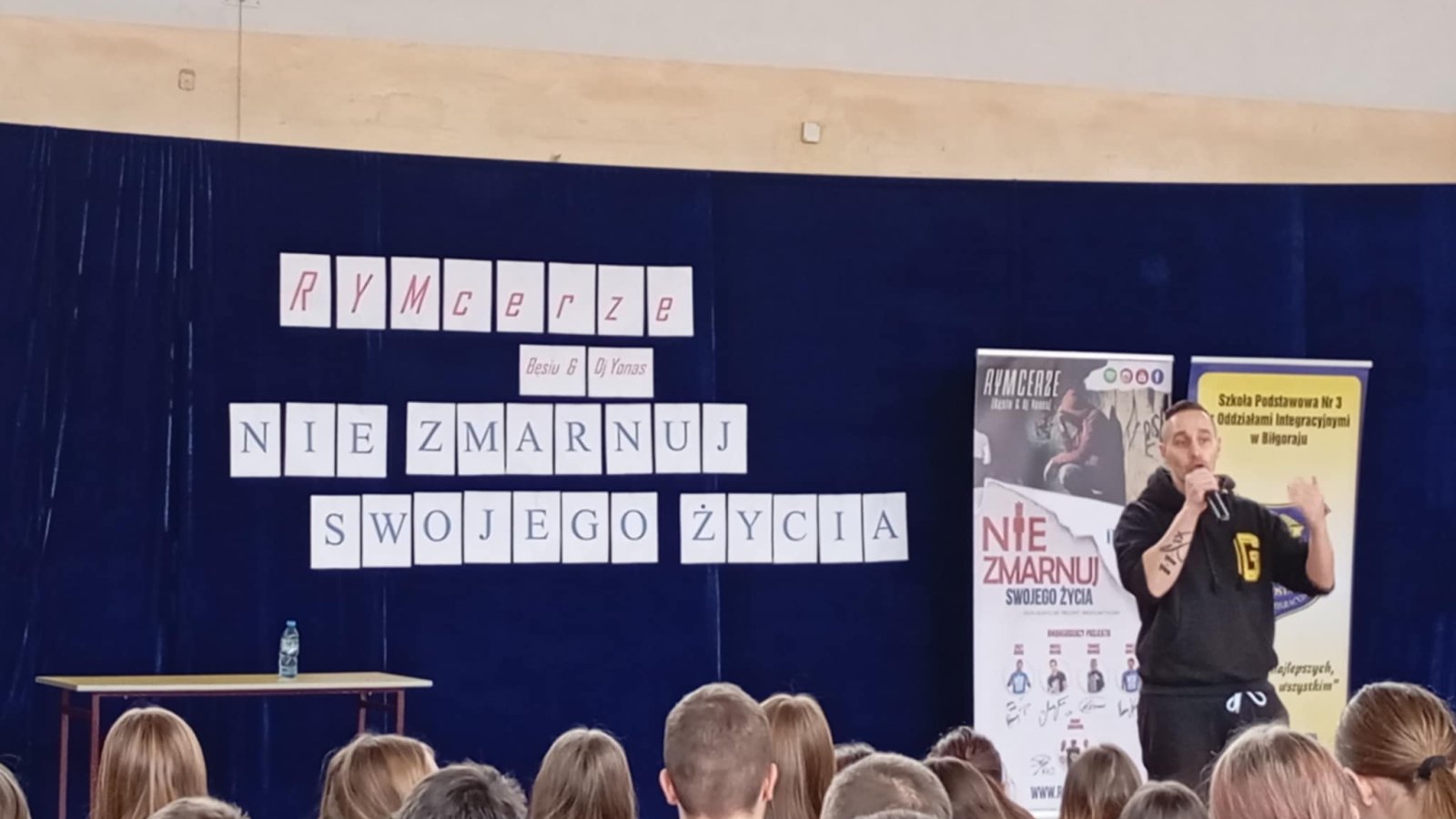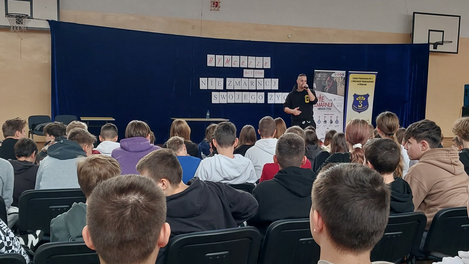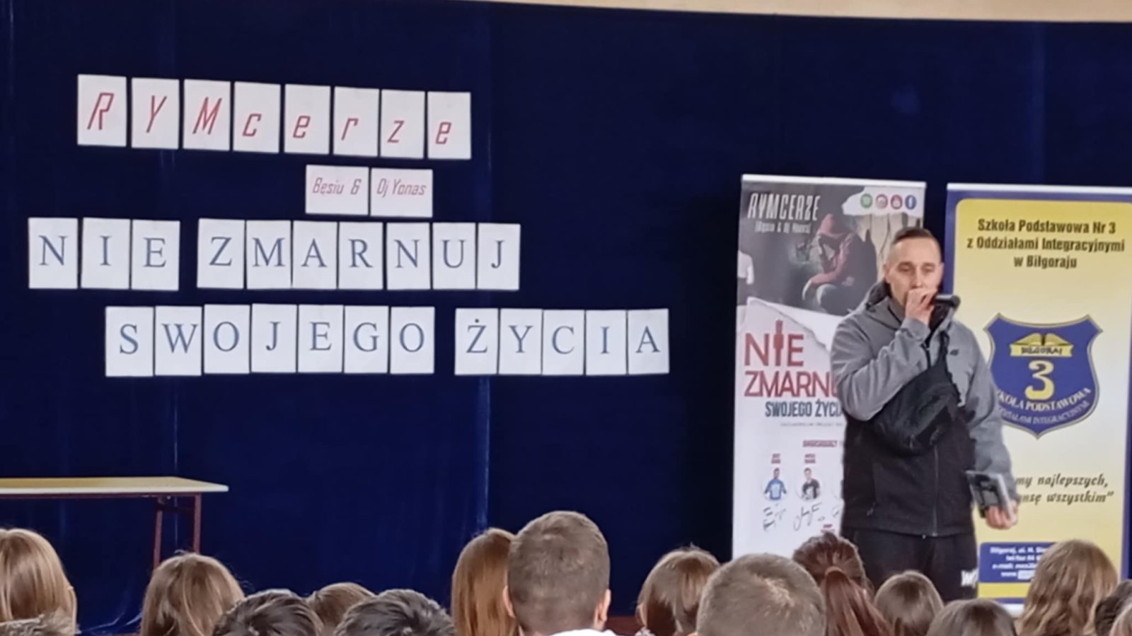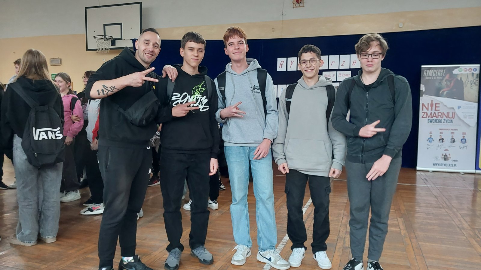 W poniedziałek, 2 grudnia RYMCERZE Bęsiu i Dj Yonas „zagrali” dla naszej młodzieży. Zagrali o swoim życiu bardzo szczerze i otwarcie. Nie bali się mówić o swoich problemach z używkami w wieku kilkunastu lat. W życiu każdego z Nich zdarzył się dzień, który wszystko odmienił. A teraz łącząc swoją pasję do muzyki jaką jest hip –hop i poczucie misji spotykają się z uczniami z jednym konkretnym przekazem „Nie Zmarnuj Swojego Życia”. Tak nazywa się ich autorski projekt profilaktyczny. Poprzez swoje opowiedziane historie chcą uświadomić młodym ludziom jakie zagrożenia niosą wszelkiego rodzaju używki, zachęcają do rozwijania swoich zainteresowań i dążenia do samorealizacji, do progresu, a więc do pójścia naprzód, do kroku w rozwoju. Mocno podkreślają wartości uniwersalne, takie jak szacunek do drugiego człowieka. Temu wszystkiemu towarzyszy rytmiczne wypowiadanie tekstu, czyli rapowanie charakterystyczne dla hip –hopu. Jest też żywa interakcja z uczniami, jest śmiech i wzruszenie. Są wspólne zdjęcia, rozmowy i autografy. Mamy nadzieję, że najważniejsze przesłanie RYMCERZY „Nie Zmarnuj Swojego Życia” pozostanie w pamięci i sercu każdego uczestnika spotkania i zaowocuje tylko dobrymi decyzjami.