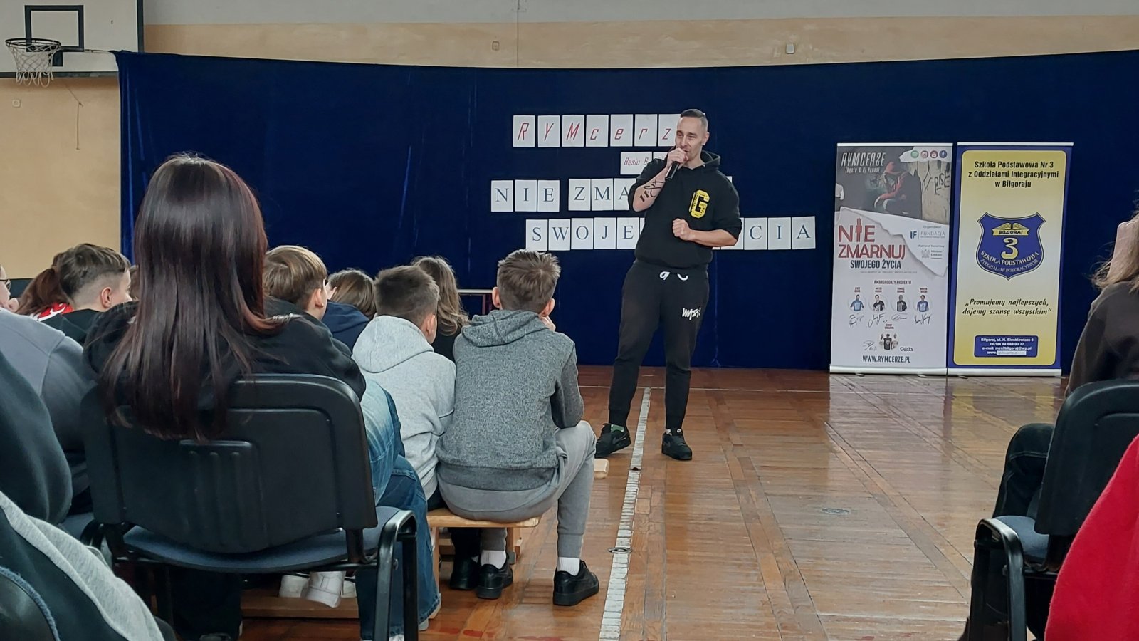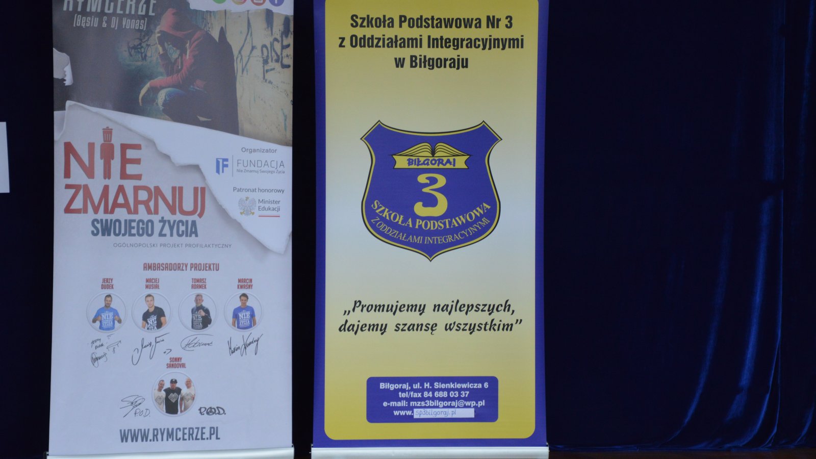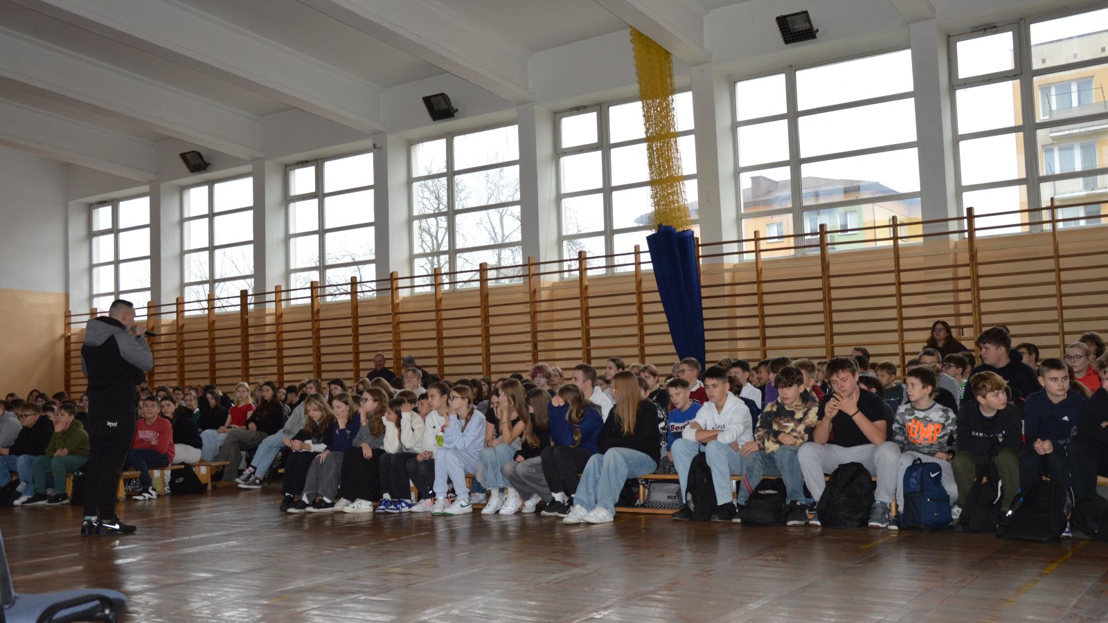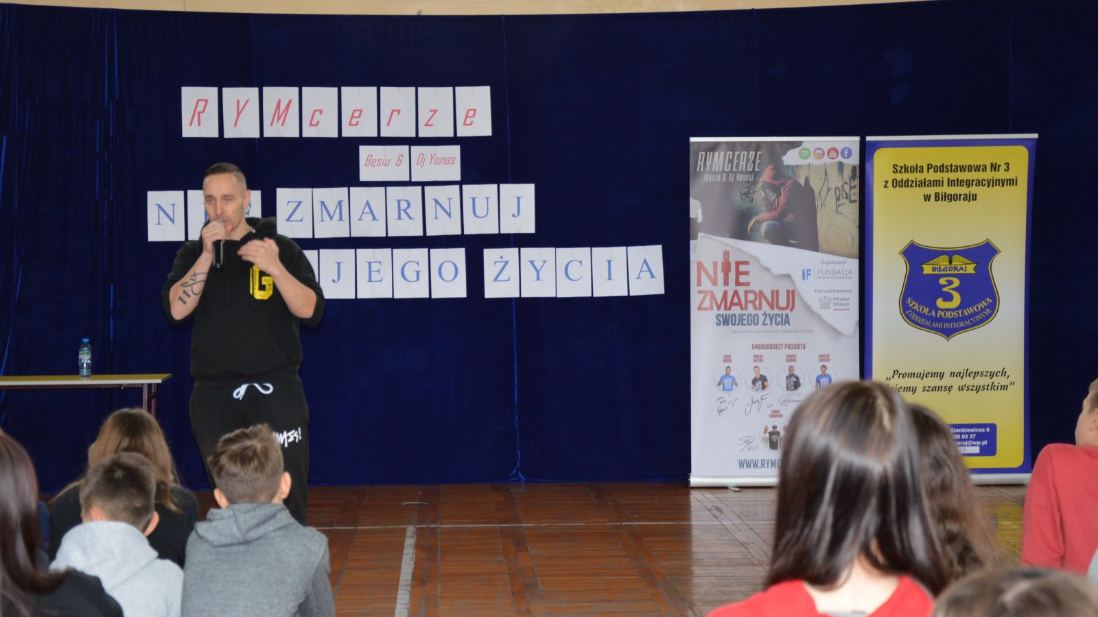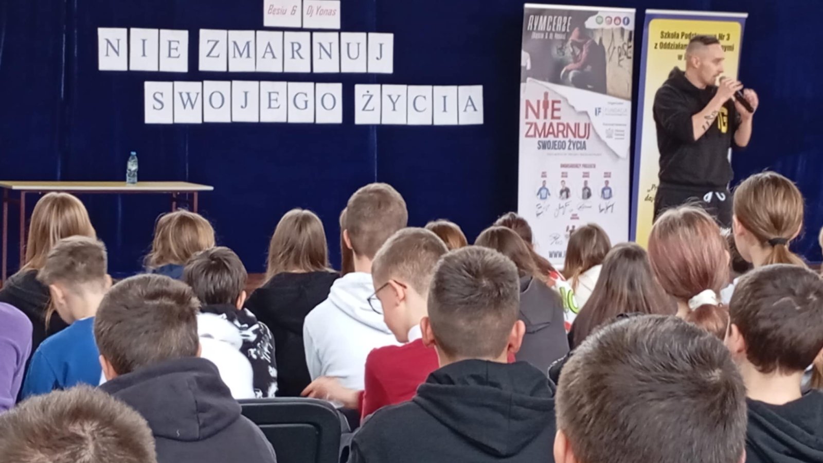 W poniedziałek, 2 grudnia RYMCERZE Bęsiu i Dj Yonas „zagrali” dla naszej młodzieży. Zagrali o swoim życiu bardzo szczerze i otwarcie. Nie bali się mówić o swoich problemach z używkami w wieku kilkunastu lat. W życiu każdego z Nich zdarzył się dzień, który wszystko odmienił. A teraz łącząc swoją pasję do muzyki jaką jest hip –hop i poczucie misji spotykają się z uczniami z jednym konkretnym przekazem „Nie Zmarnuj Swojego Życia”. Tak nazywa się ich autorski projekt profilaktyczny. Poprzez swoje opowiedziane historie chcą uświadomić młodym ludziom jakie zagrożenia niosą wszelkiego rodzaju używki, zachęcają do rozwijania swoich zainteresowań i dążenia do samorealizacji, do progresu, a więc do pójścia naprzód, do kroku w rozwoju. Mocno podkreślają wartości uniwersalne, takie jak szacunek do drugiego człowieka. Temu wszystkiemu towarzyszy rytmiczne wypowiadanie tekstu, czyli rapowanie charakterystyczne dla hip –hopu. Jest też żywa interakcja z uczniami, jest śmiech i wzruszenie. Są wspólne zdjęcia, rozmowy i autografy. Mamy nadzieję, że najważniejsze przesłanie RYMCERZY „Nie Zmarnuj Swojego Życia” pozostanie w pamięci i sercu każdego uczestnika spotkania i zaowocuje tylko dobrymi decyzjami.