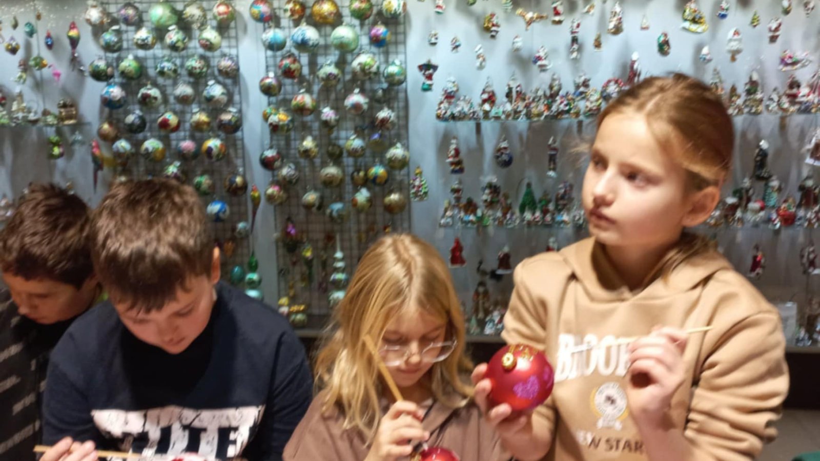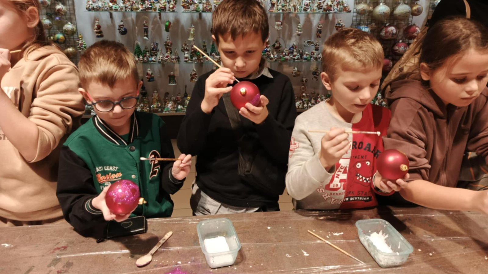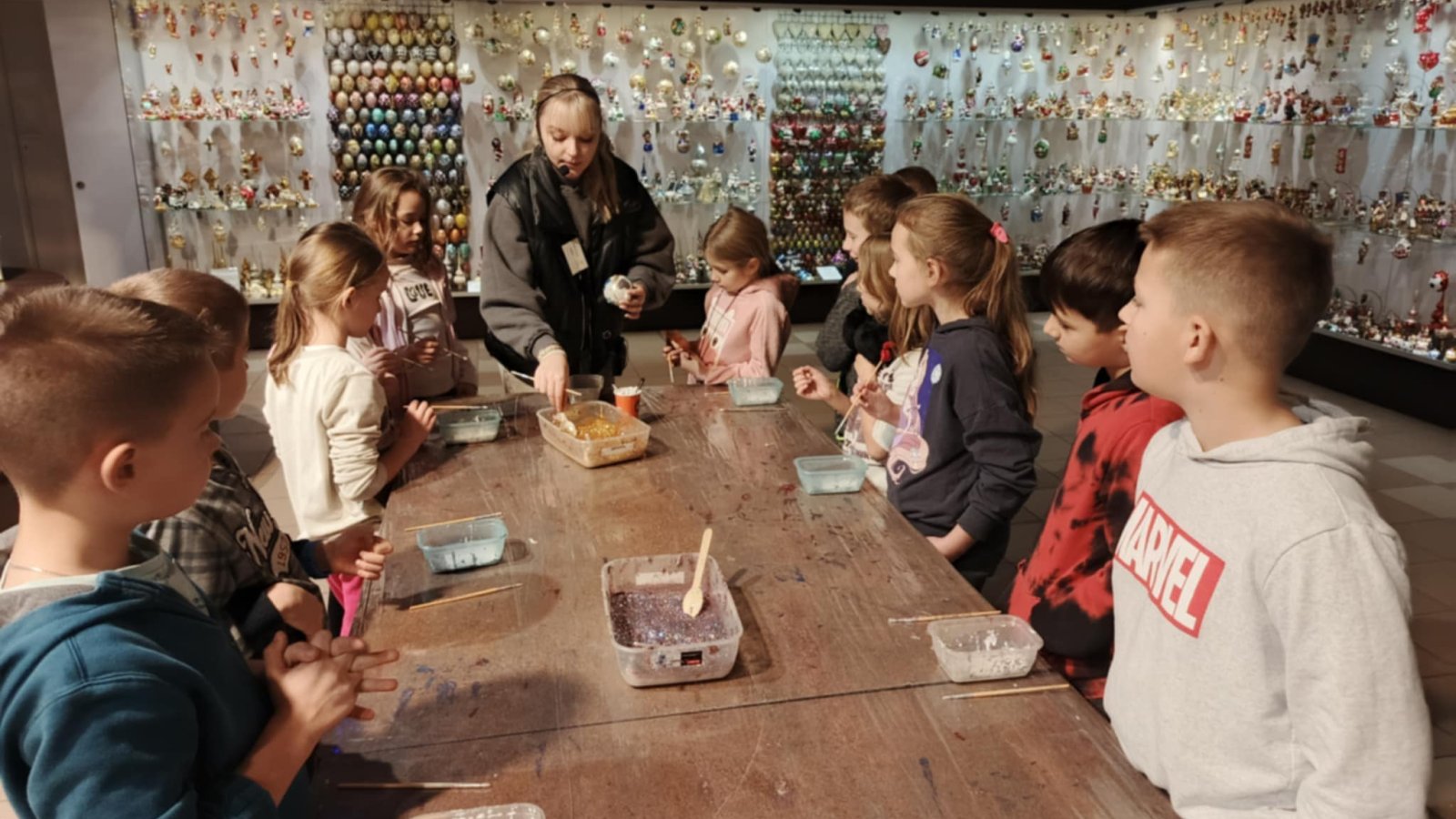 Na początku wycieczki uczniowie mieli okazję zobaczyć, jak powstają ręcznie robione bombki. Z zaciekawieniem obserwowali proces wydmuchiwania szklanych kształtów oraz precyzyjnego malowania i dekorowania każdej ozdoby. Przewodnik opowiadał o tradycjach związanych z dekorowaniem choinek, pokazując unikatowe eksponaty z różnych zakątków świata. Dzieci najbardziej zachwyciła sala wypełniona bombkami o fantazyjnych kształtach – od klasycznych kul po miniaturowe samochody, zwierzątka i postacie z bajek. Było też miejsce na warsztaty, gdzie każdy mógł własnoręcznie ozdobić bombkę, co sprawiło ogromną radość młodym uczestnikom.