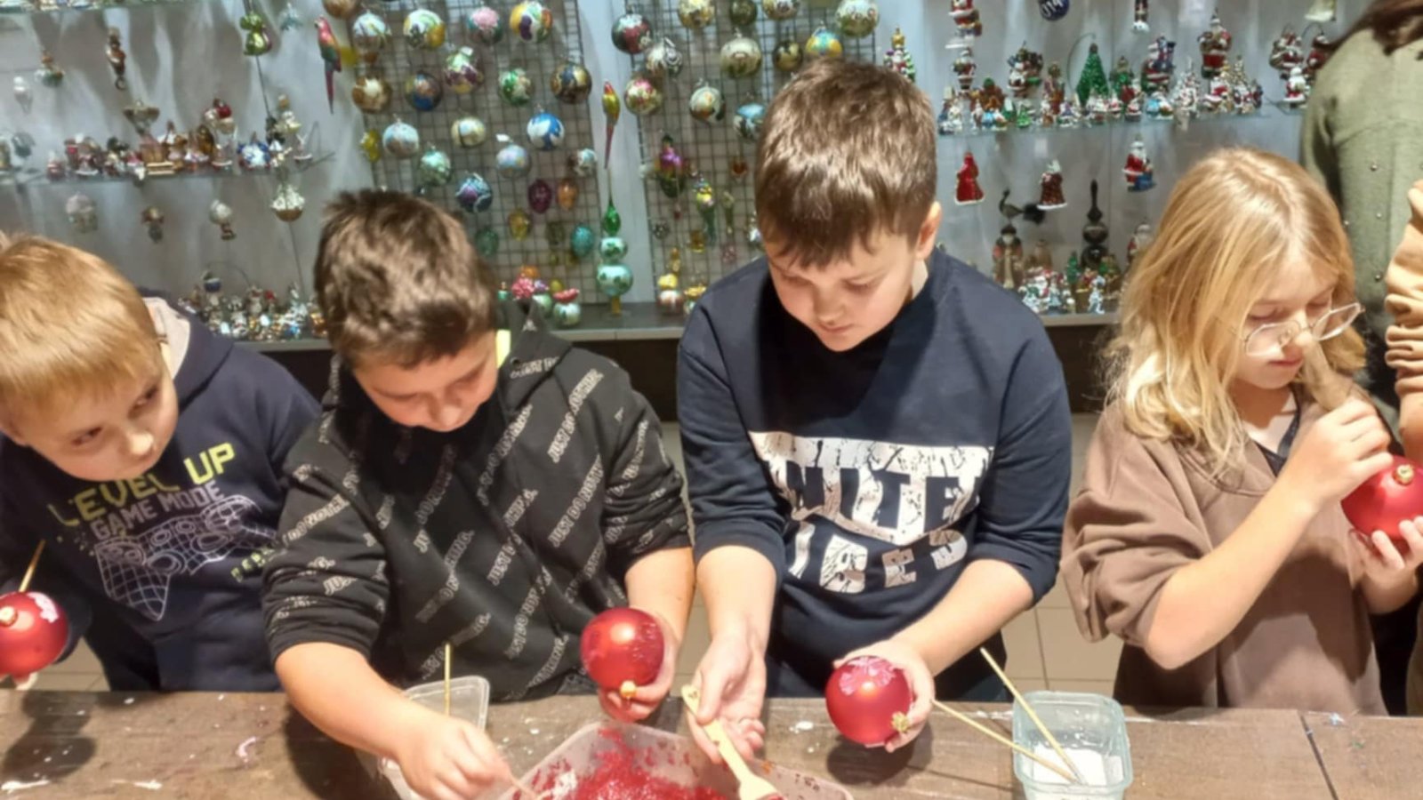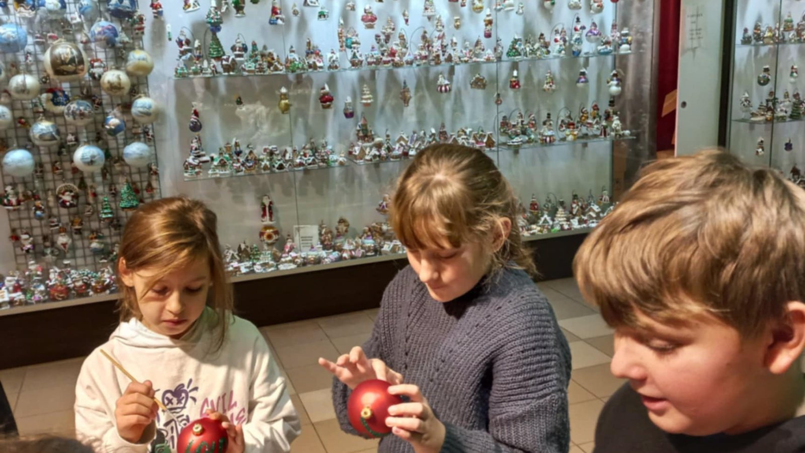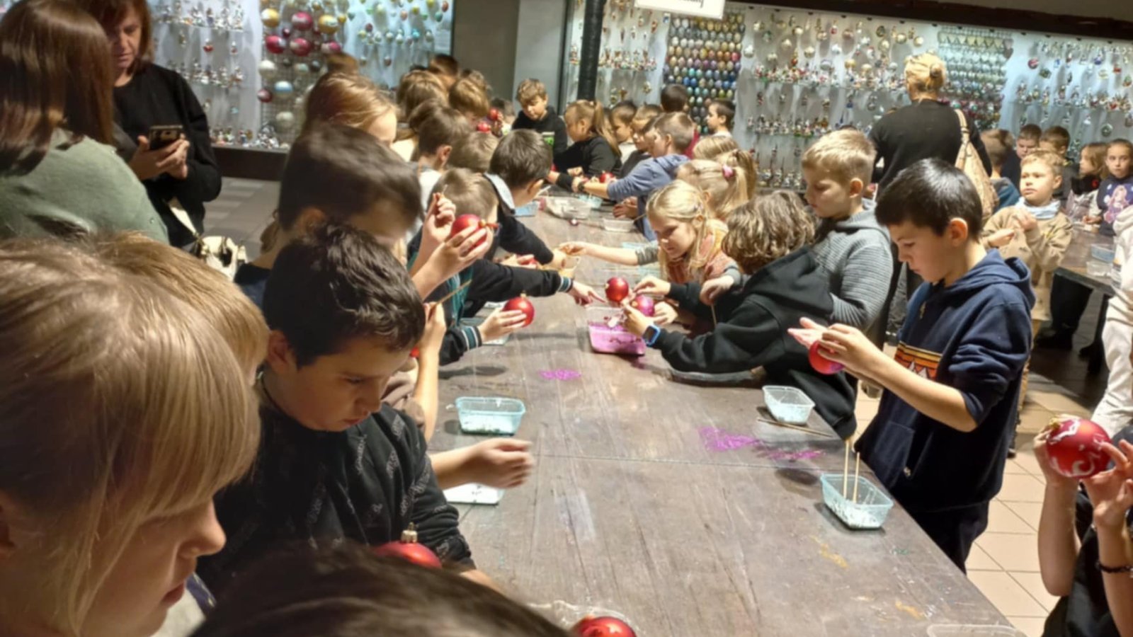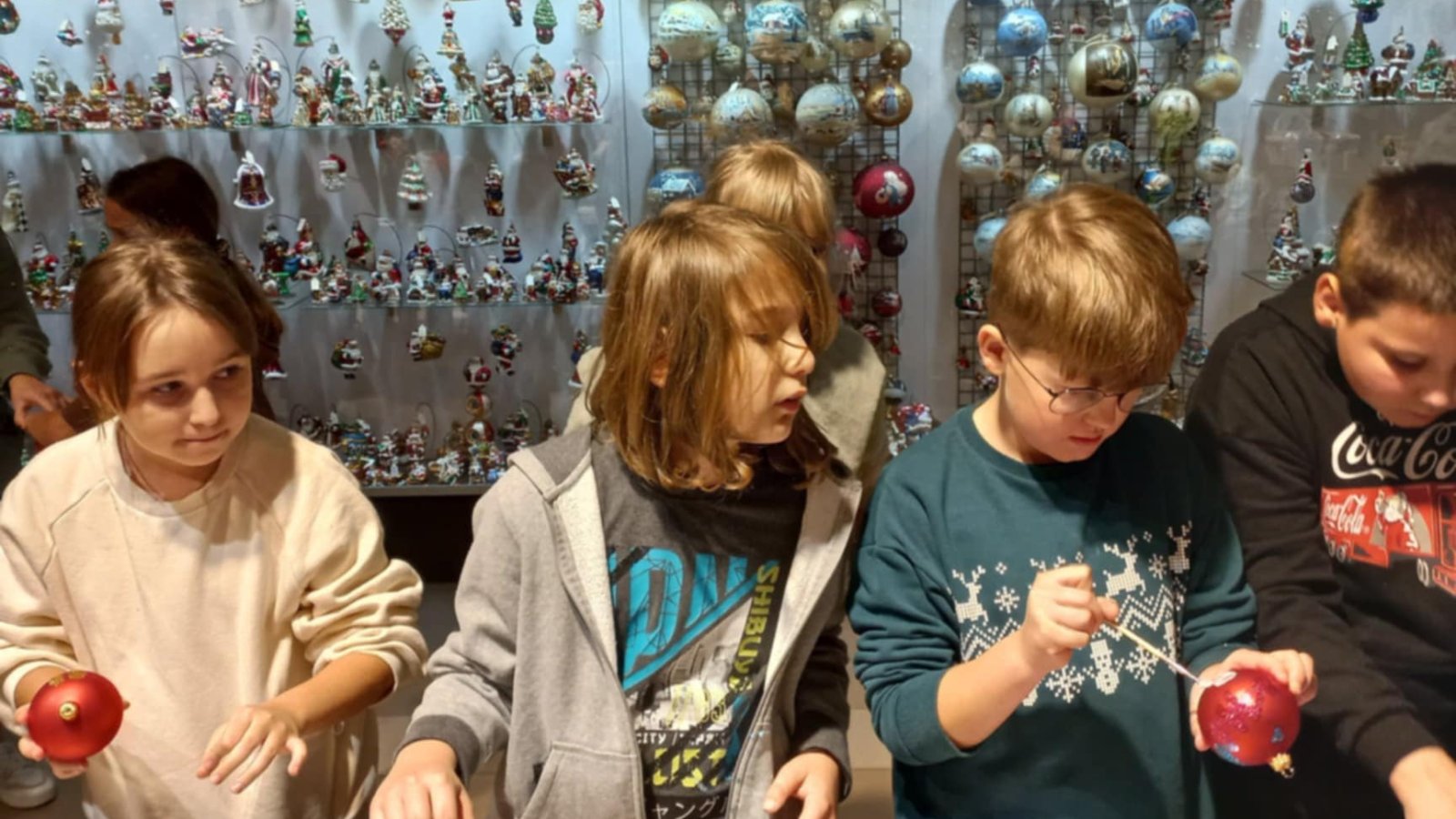 Na początku wycieczki uczniowie mieli okazję zobaczyć, jak powstają ręcznie robione bombki. Z zaciekawieniem obserwowali proces wydmuchiwania szklanych kształtów oraz precyzyjnego malowania i dekorowania każdej ozdoby. Przewodnik opowiadał o tradycjach związanych z dekorowaniem choinek, pokazując unikatowe eksponaty z różnych zakątków świata. Dzieci najbardziej zachwyciła sala wypełniona bombkami o fantazyjnych kształtach – od klasycznych kul po miniaturowe samochody, zwierzątka i postacie z bajek. Było też miejsce na warsztaty, gdzie każdy mógł własnoręcznie ozdobić bombkę, co sprawiło ogromną radość młodym uczestnikom.