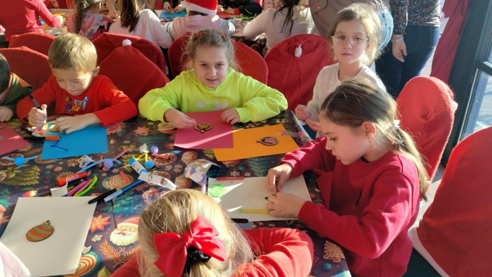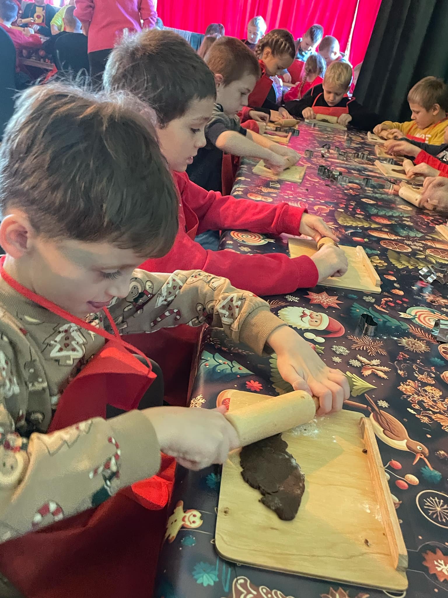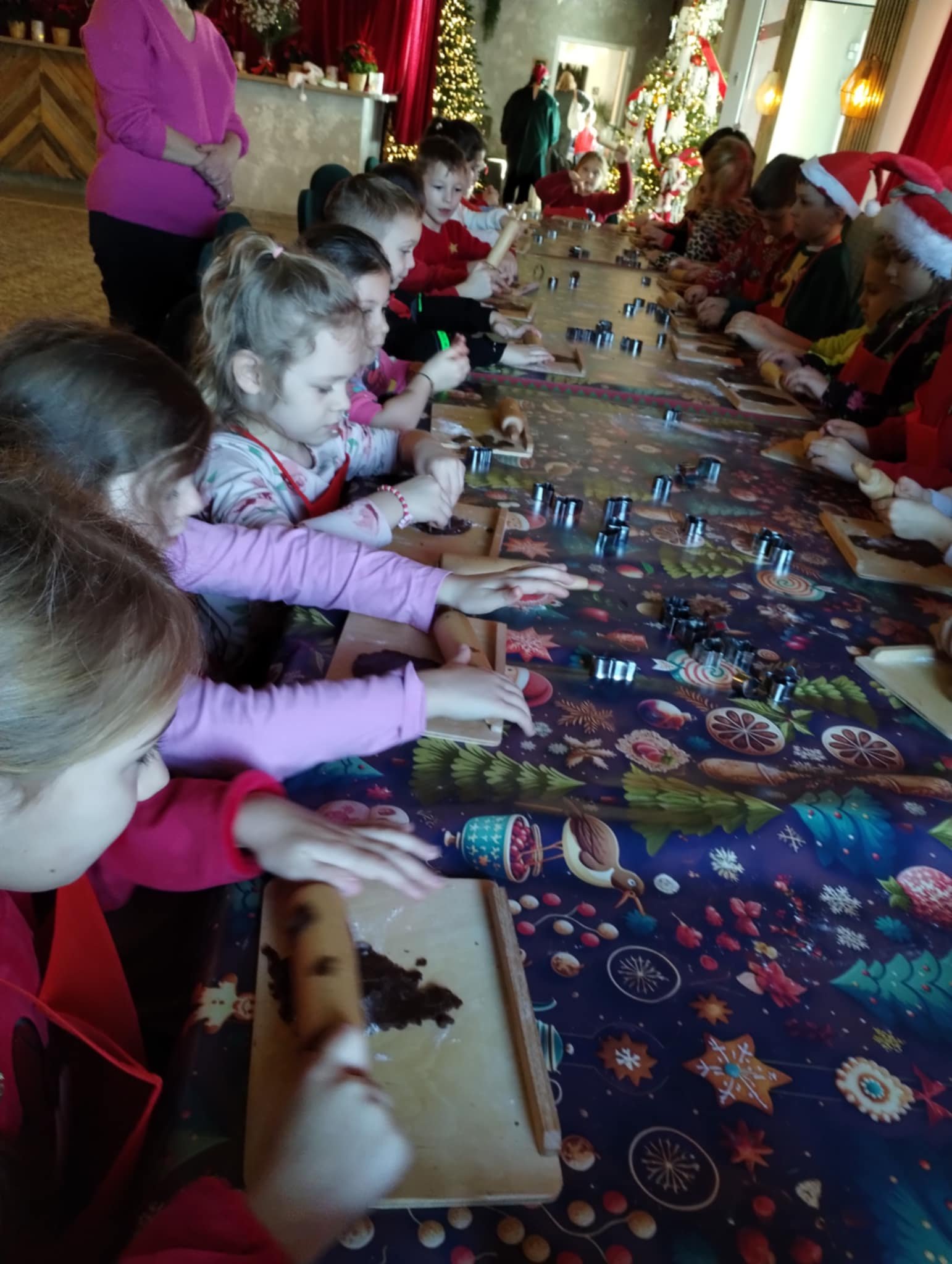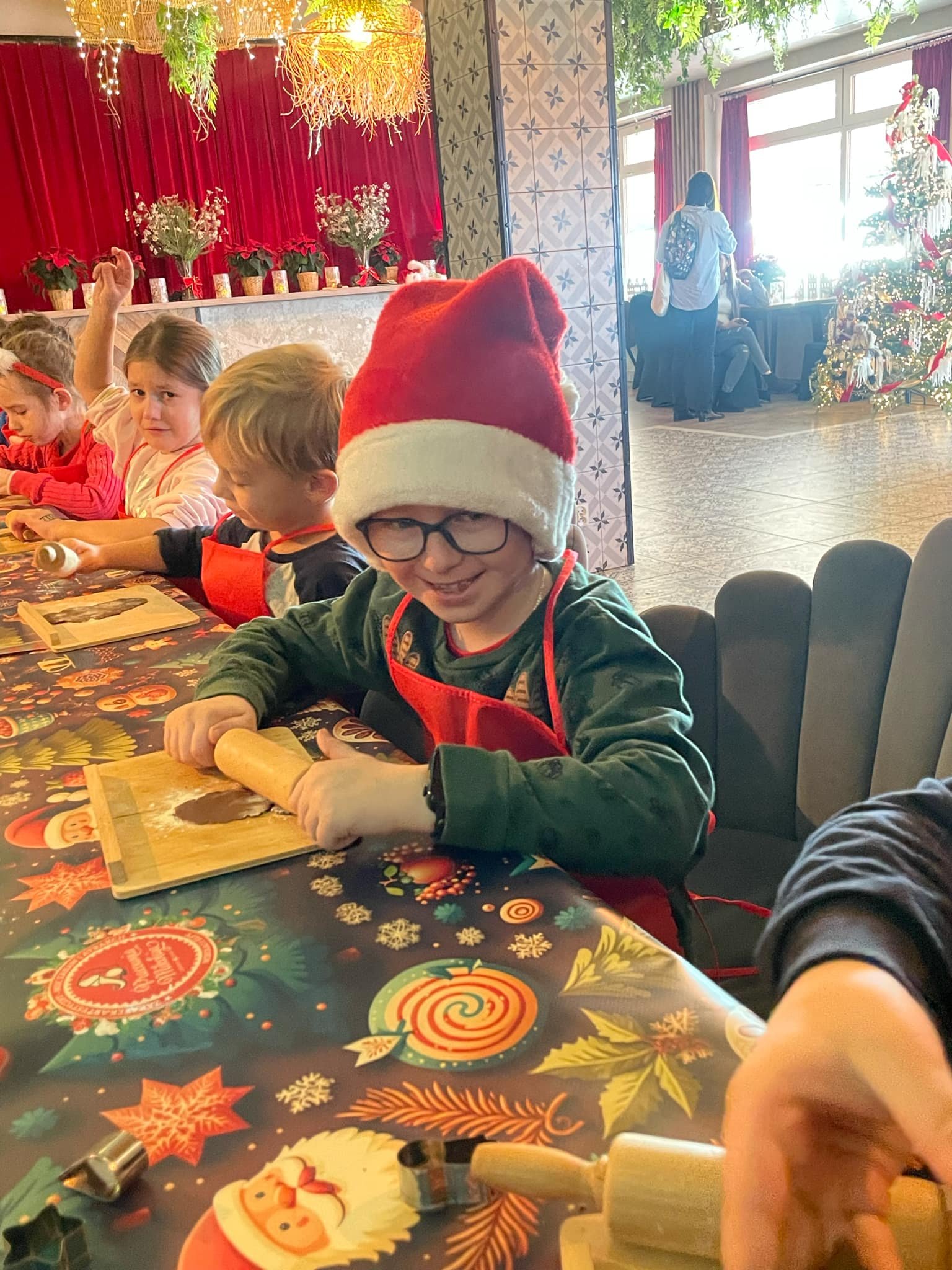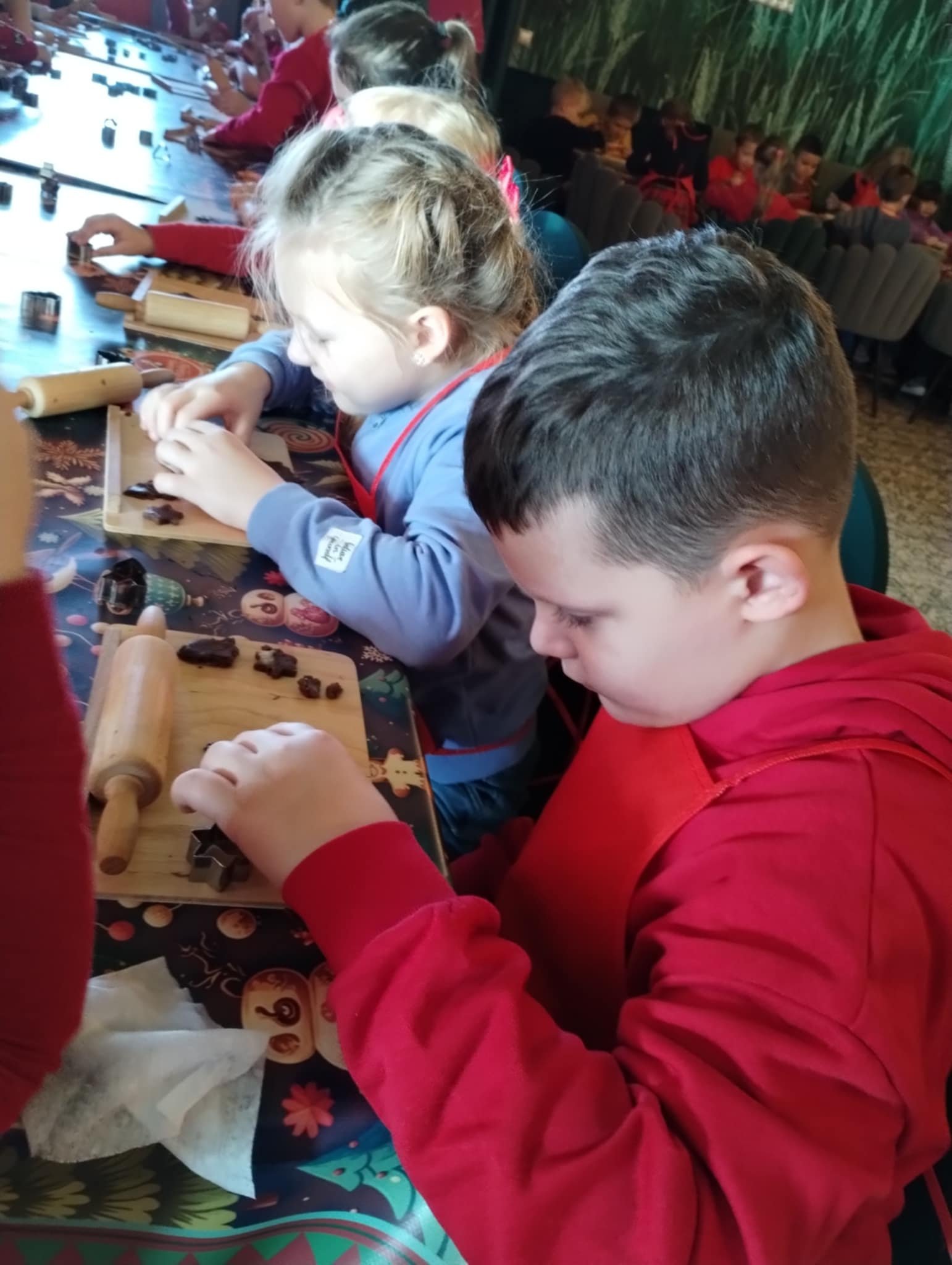 Pierwszym punktem programu były warsztaty pieczenia pierniczków. Dzieci z zapałem wałkowały ciasto, wycinały kształty choinek, gwiazdek i serduszek. Gotowe pierniczki, jeszcze ciepłe, nie tylko pięknie wyglądały, ale i smakowały wyśmienicie! Po słodkich warsztatach uczniowie wzięli udział w konkursie na zgadywanie świątecznych zagadek. Pytania dotyczyły tradycji bożonarodzeniowych, kolęd i postaci związanych ze świętami. Wspólne zgadywanie wywołało mnóstwo śmiechu i rywalizacji. Kolejną atrakcją było dekorowanie bombek. Dzieci, z pomocą elfów, malowały kule różnokolorowymi farbami i ozdabiały je brokatem. Każda bombka była wyjątkowa i odzwierciedlała kreatywność małych artystów. Poza tym uczniowie przygotowali piękne laurki dla Świętego Mikołaja, na których dziękowali za prezenty i składali mu życzenia świąteczne.