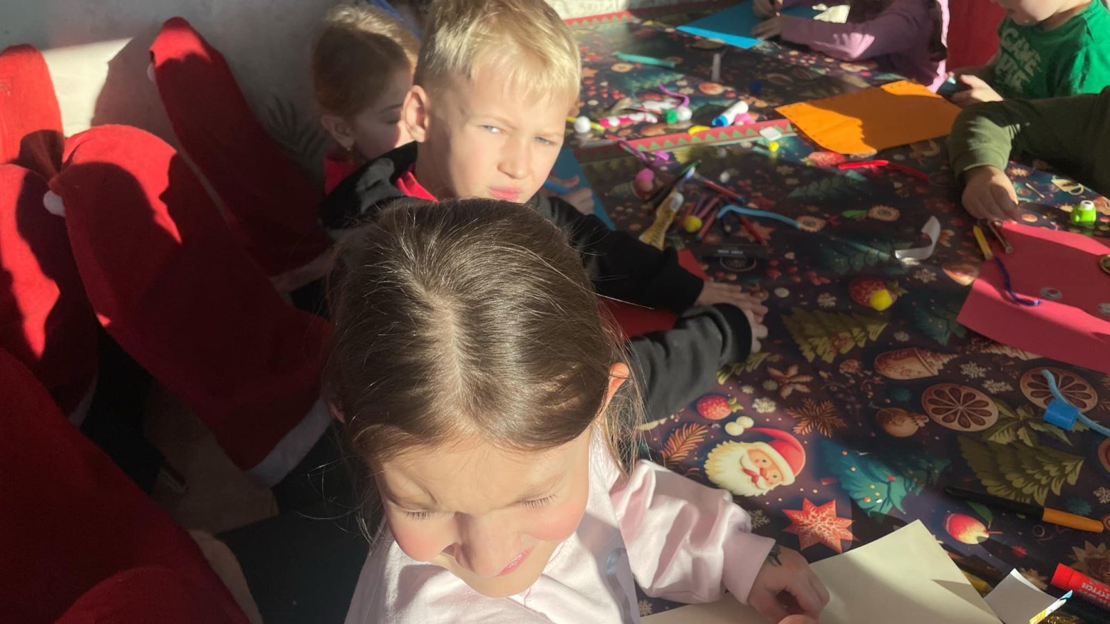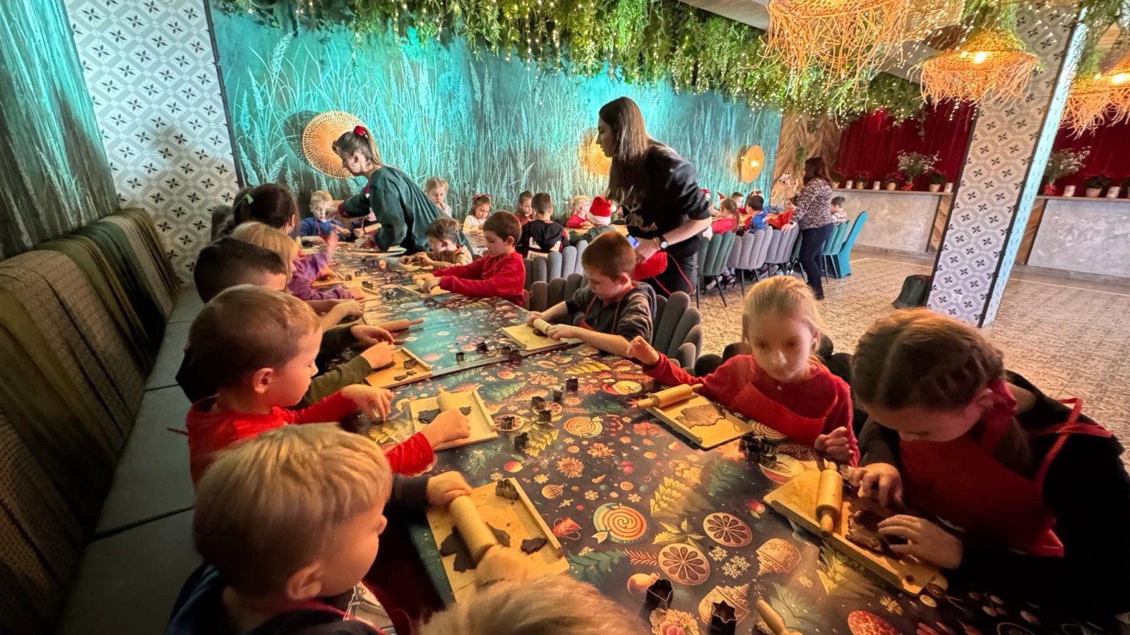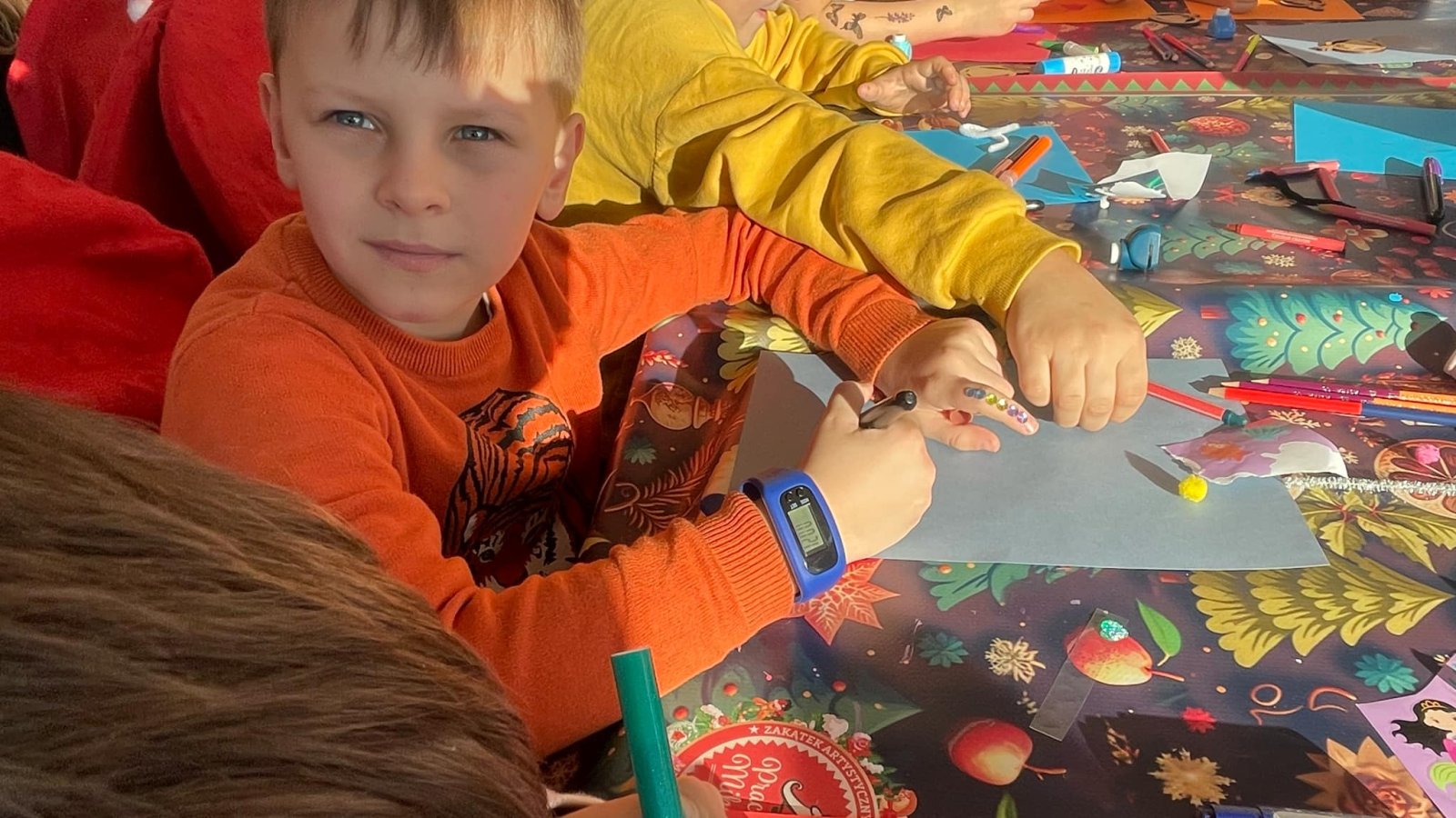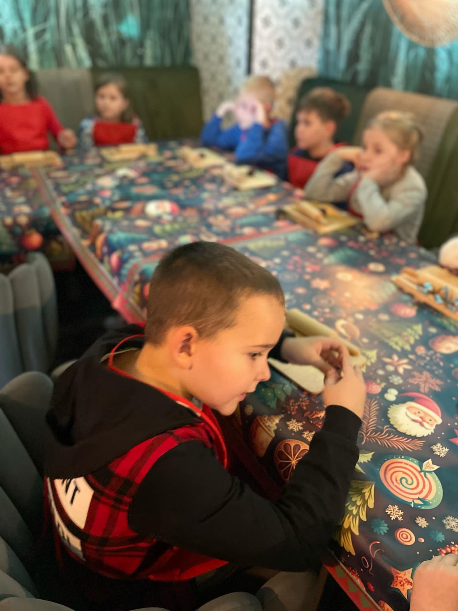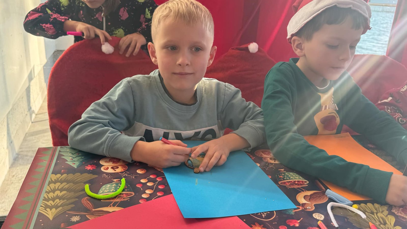 Pierwszym punktem programu były warsztaty pieczenia pierniczków. Dzieci z zapałem wałkowały ciasto, wycinały kształty choinek, gwiazdek i serduszek. Gotowe pierniczki, jeszcze ciepłe, nie tylko pięknie wyglądały, ale i smakowały wyśmienicie! Po słodkich warsztatach uczniowie wzięli udział w konkursie na zgadywanie świątecznych zagadek. Pytania dotyczyły tradycji bożonarodzeniowych, kolęd i postaci związanych ze świętami. Wspólne zgadywanie wywołało mnóstwo śmiechu i rywalizacji. Kolejną atrakcją było dekorowanie bombek. Dzieci, z pomocą elfów, malowały kule różnokolorowymi farbami i ozdabiały je brokatem. Każda bombka była wyjątkowa i odzwierciedlała kreatywność małych artystów. Poza tym uczniowie przygotowali piękne laurki dla Świętego Mikołaja, na których dziękowali za prezenty i składali mu życzenia świąteczne.