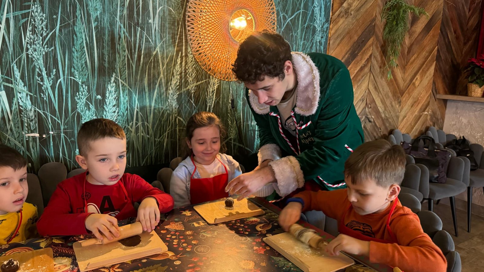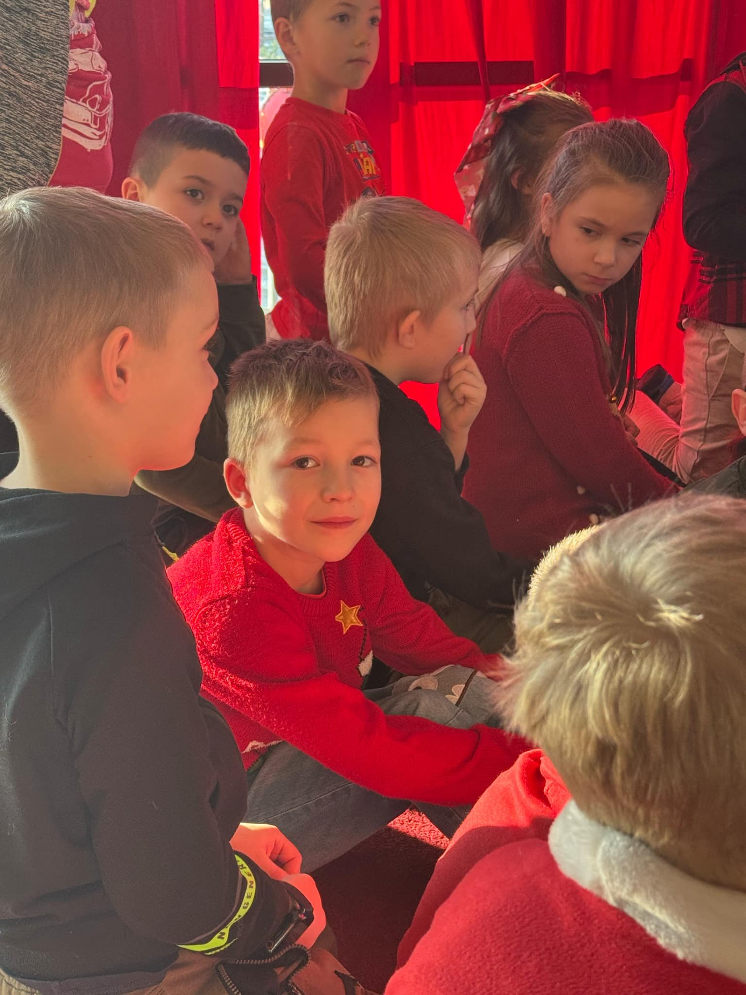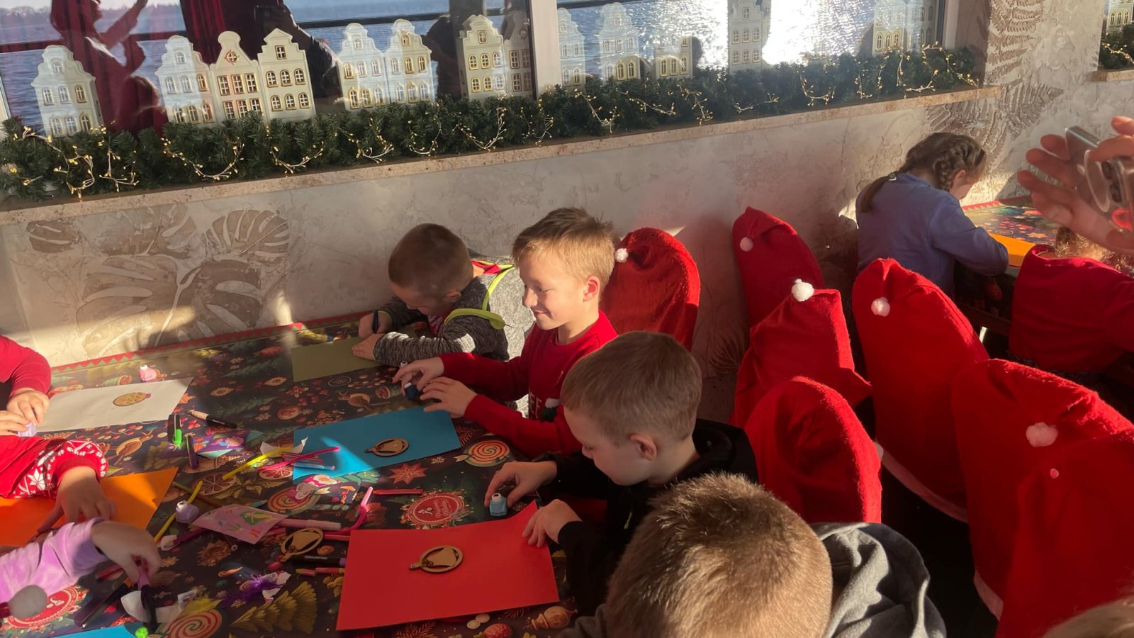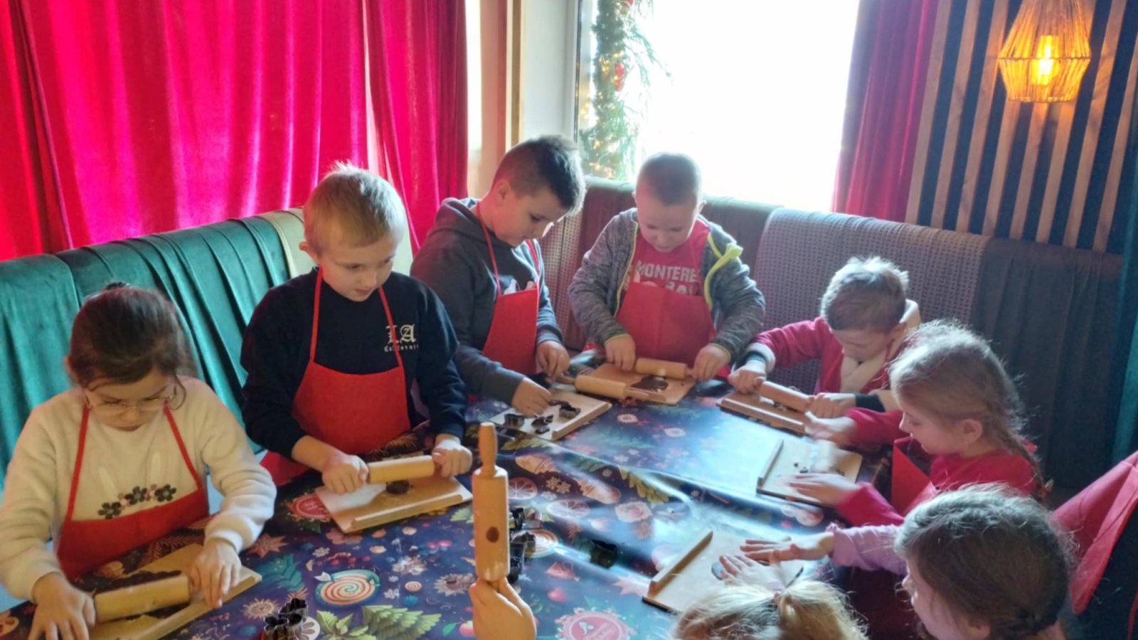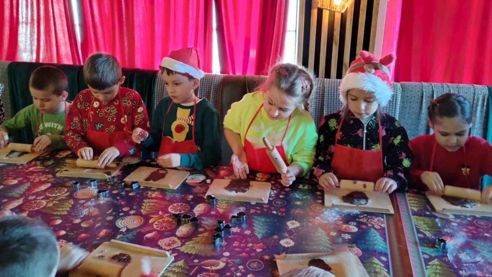 Pierwszym punktem programu były warsztaty pieczenia pierniczków. Dzieci z zapałem wałkowały ciasto, wycinały kształty choinek, gwiazdek i serduszek. Gotowe pierniczki, jeszcze ciepłe, nie tylko pięknie wyglądały, ale i smakowały wyśmienicie! Po słodkich warsztatach uczniowie wzięli udział w konkursie na zgadywanie świątecznych zagadek. Pytania dotyczyły tradycji bożonarodzeniowych, kolęd i postaci związanych ze świętami. Wspólne zgadywanie wywołało mnóstwo śmiechu i rywalizacji. Kolejną atrakcją było dekorowanie bombek. Dzieci, z pomocą elfów, malowały kule różnokolorowymi farbami i ozdabiały je brokatem. Każda bombka była wyjątkowa i odzwierciedlała kreatywność małych artystów. Poza tym uczniowie przygotowali piękne laurki dla Świętego Mikołaja, na których dziękowali za prezenty i składali mu życzenia świąteczne.