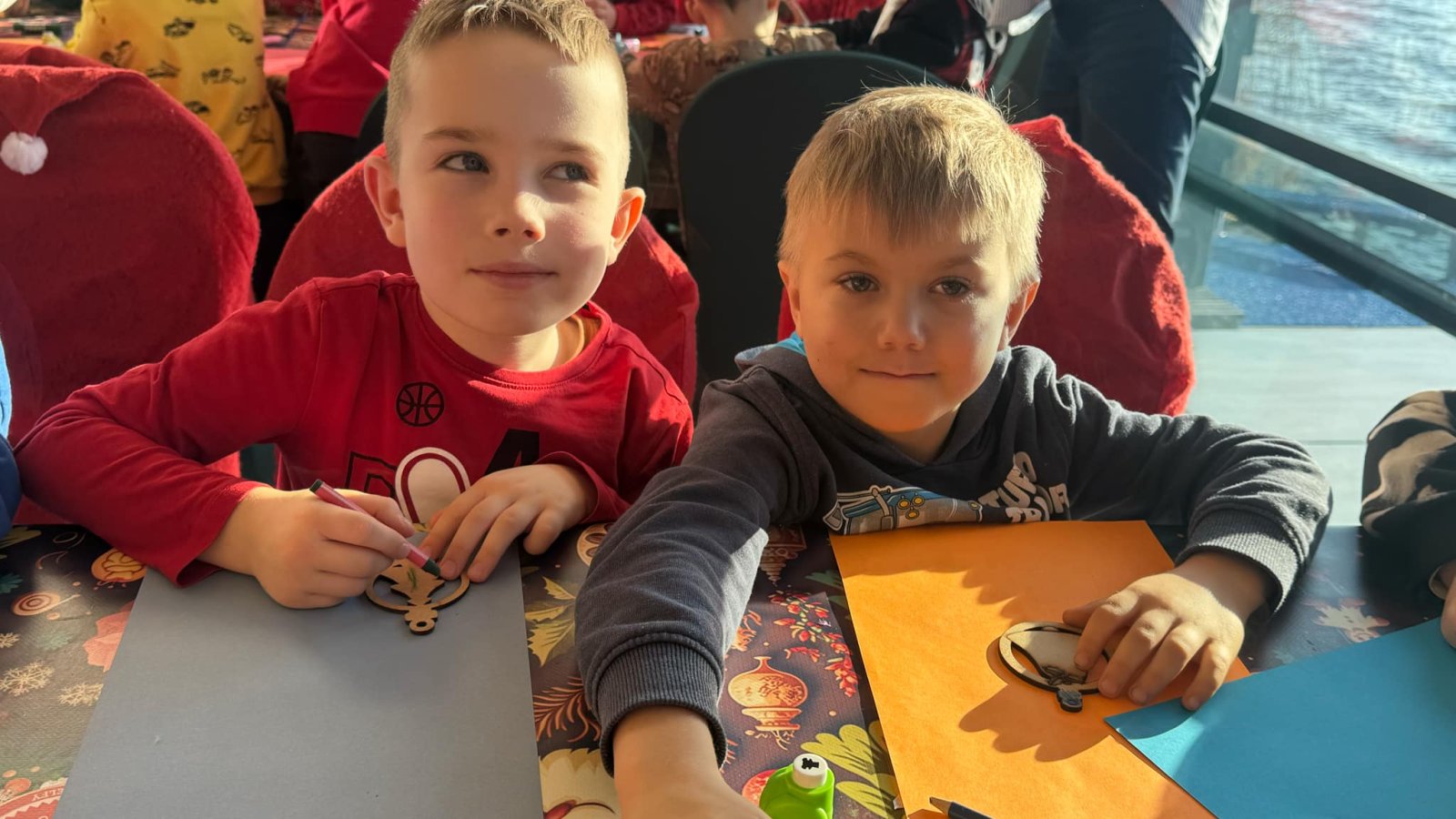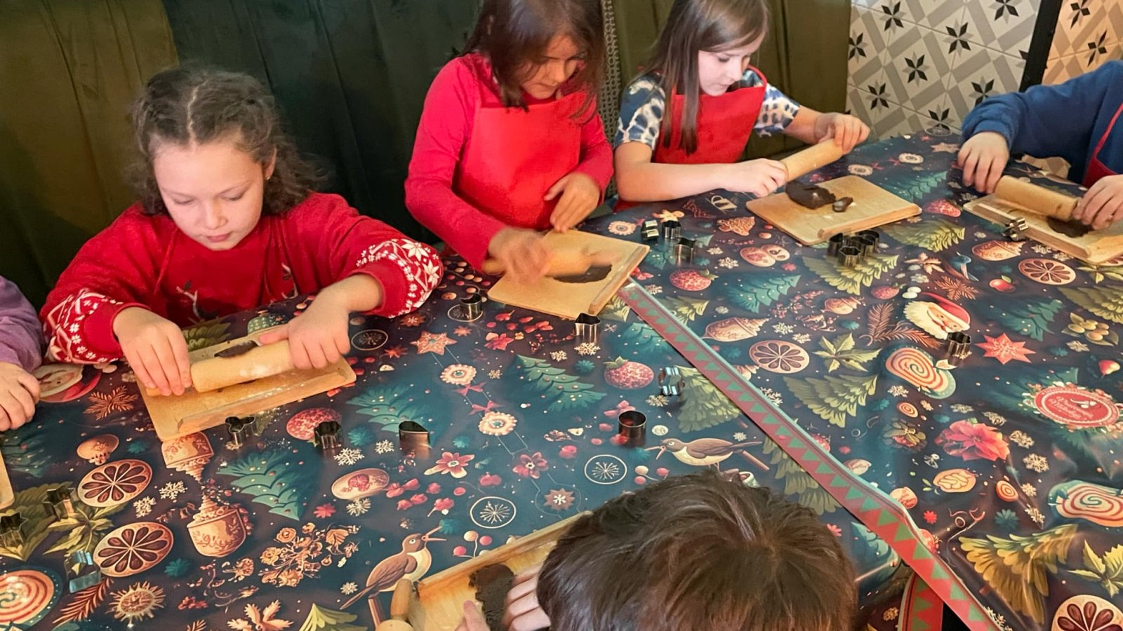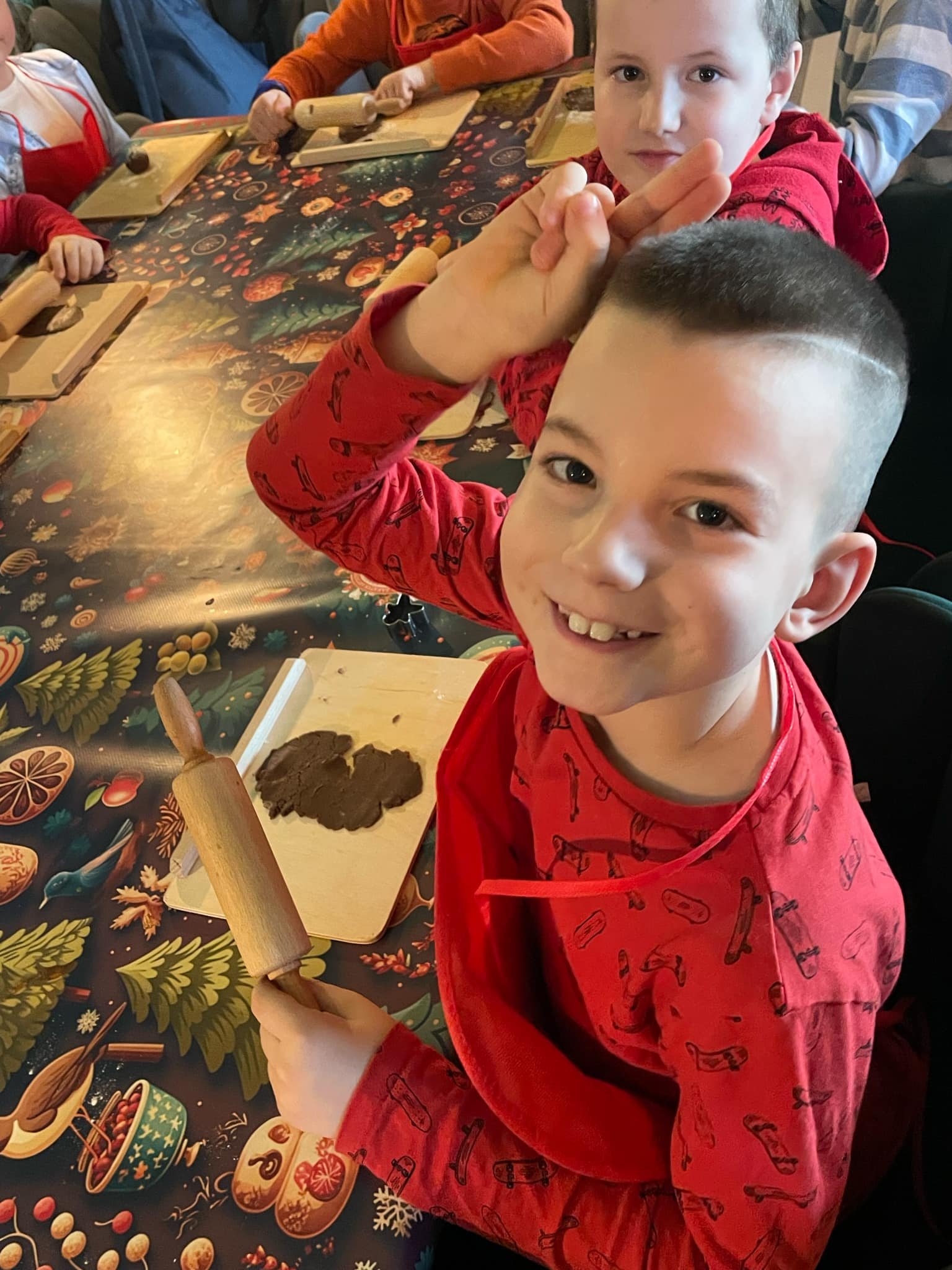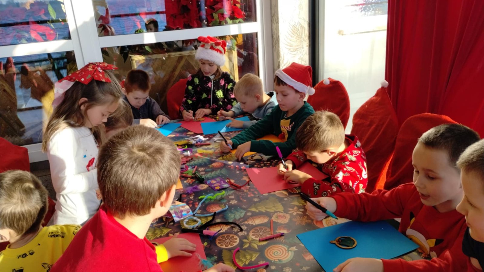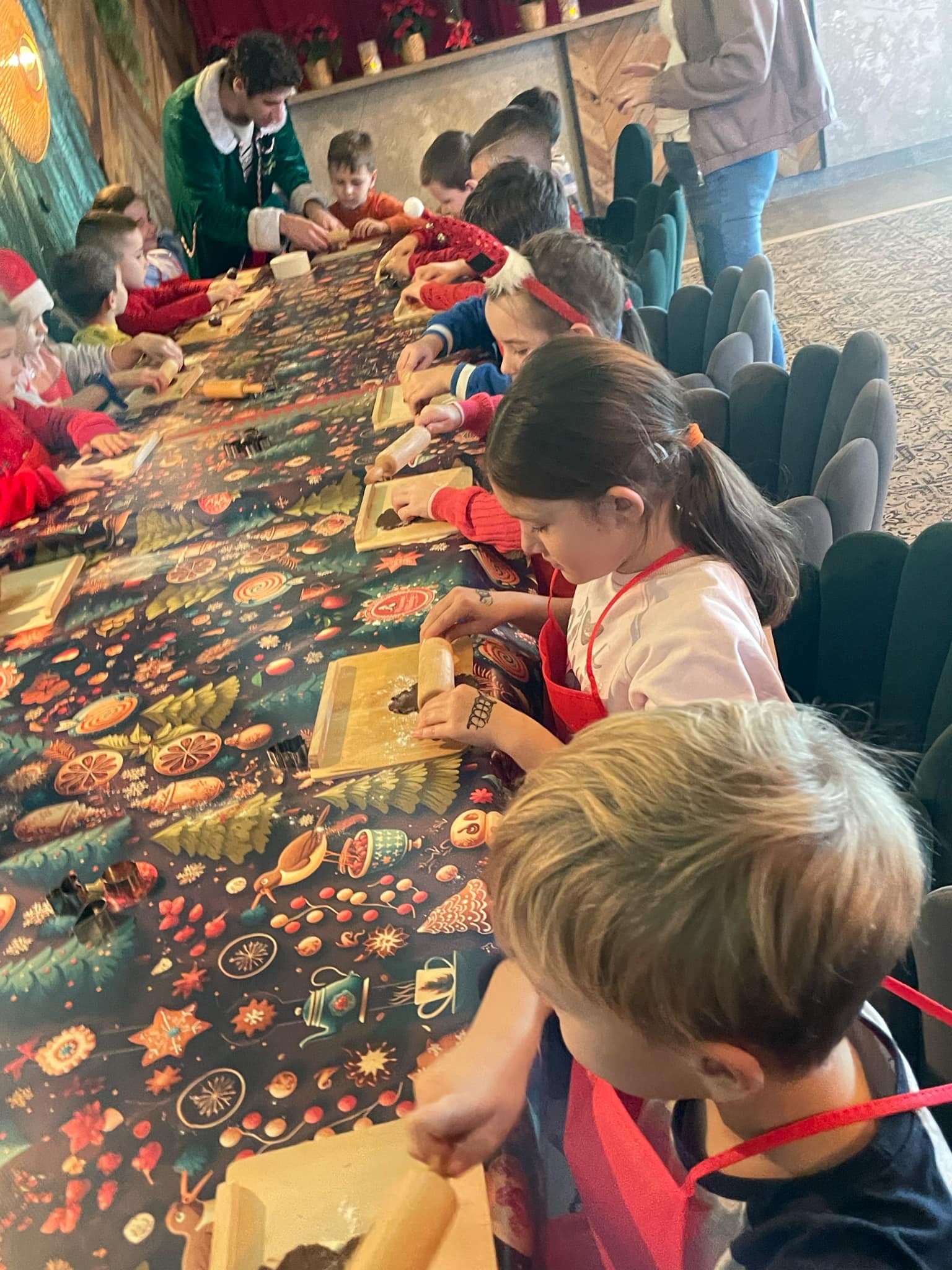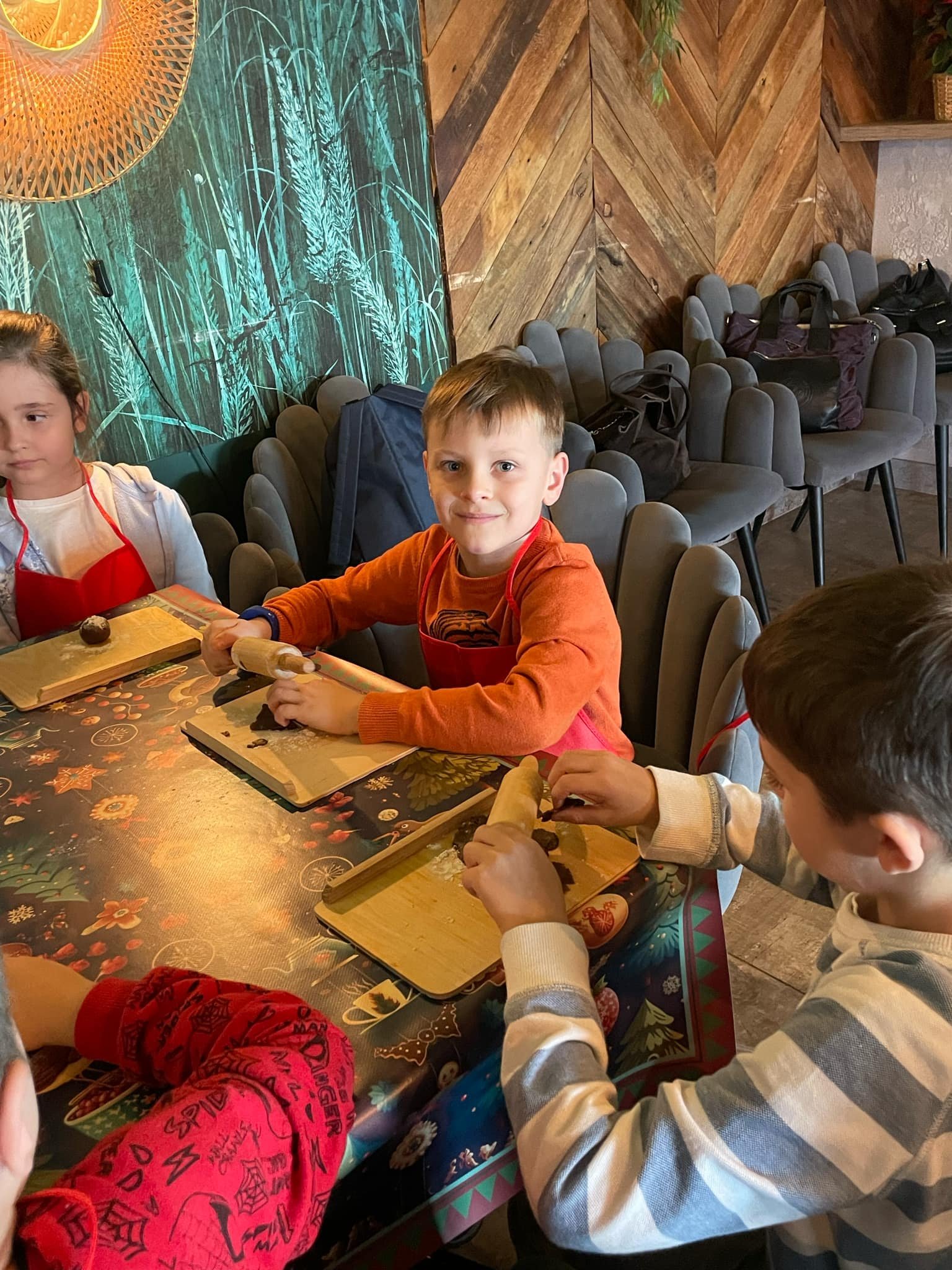 Pierwszym punktem programu były warsztaty pieczenia pierniczków. Dzieci z zapałem wałkowały ciasto, wycinały kształty choinek, gwiazdek i serduszek. Gotowe pierniczki, jeszcze ciepłe, nie tylko pięknie wyglądały, ale i smakowały wyśmienicie! Po słodkich warsztatach uczniowie wzięli udział w konkursie na zgadywanie świątecznych zagadek. Pytania dotyczyły tradycji bożonarodzeniowych, kolęd i postaci związanych ze świętami. Wspólne zgadywanie wywołało mnóstwo śmiechu i rywalizacji. Kolejną atrakcją było dekorowanie bombek. Dzieci, z pomocą elfów, malowały kule różnokolorowymi farbami i ozdabiały je brokatem. Każda bombka była wyjątkowa i odzwierciedlała kreatywność małych artystów. Poza tym uczniowie przygotowali piękne laurki dla Świętego Mikołaja, na których dziękowali za prezenty i składali mu życzenia świąteczne.