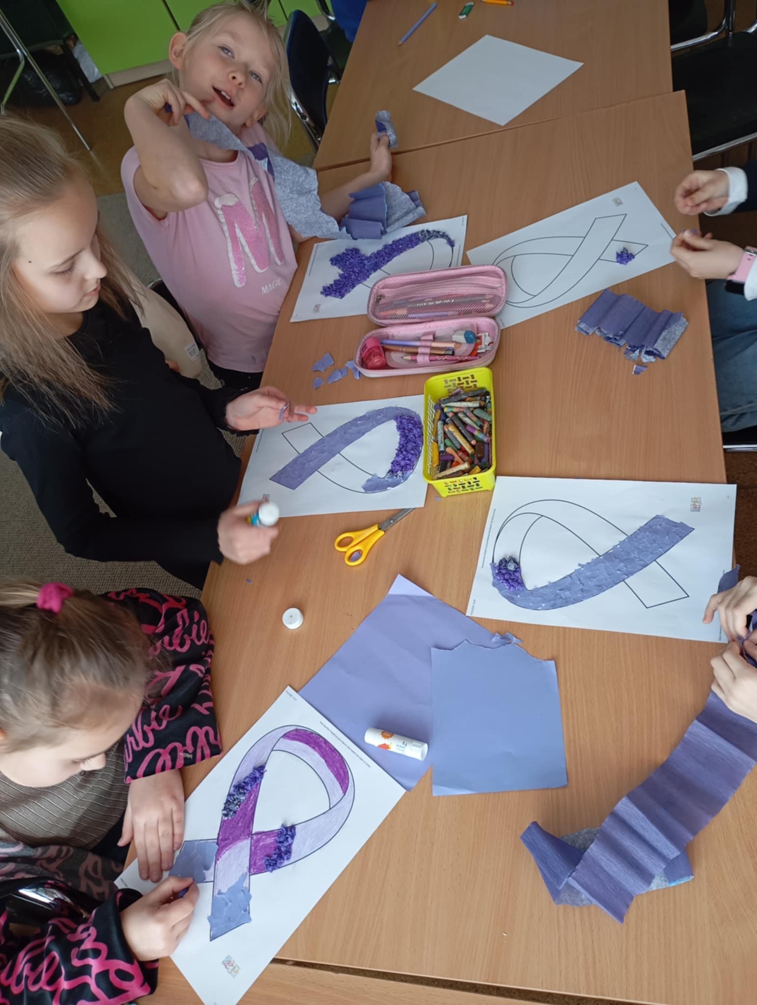 Wychowankowie świetlicy szkolnej w ramach Projektu edukacyjnego „Jak mówić o niepełnosprawności” zapoznali się z informacjami o tej chorobie. Uczniowie wysłuchali opowiadania o Janku, który miał epilepsję. Dzięki zabawie naśladowczej „Wzywamy pomoc” mogli przećwiczyć przykładową rozmowę z dyspozytorem karetki oraz nauczyć się jak należy pomóc osobie podczas napadu padaczki. Podejmowali także próby ułożenia kolegi czy koleżanki w pozycji bocznej ustalonej. Na koniec zajęć uczniowie wykonali pracę plastyczną ”Lawendowa wstążka”, która jest symbolem wsparcia i zrozumienia dla chorych na padaczkę.