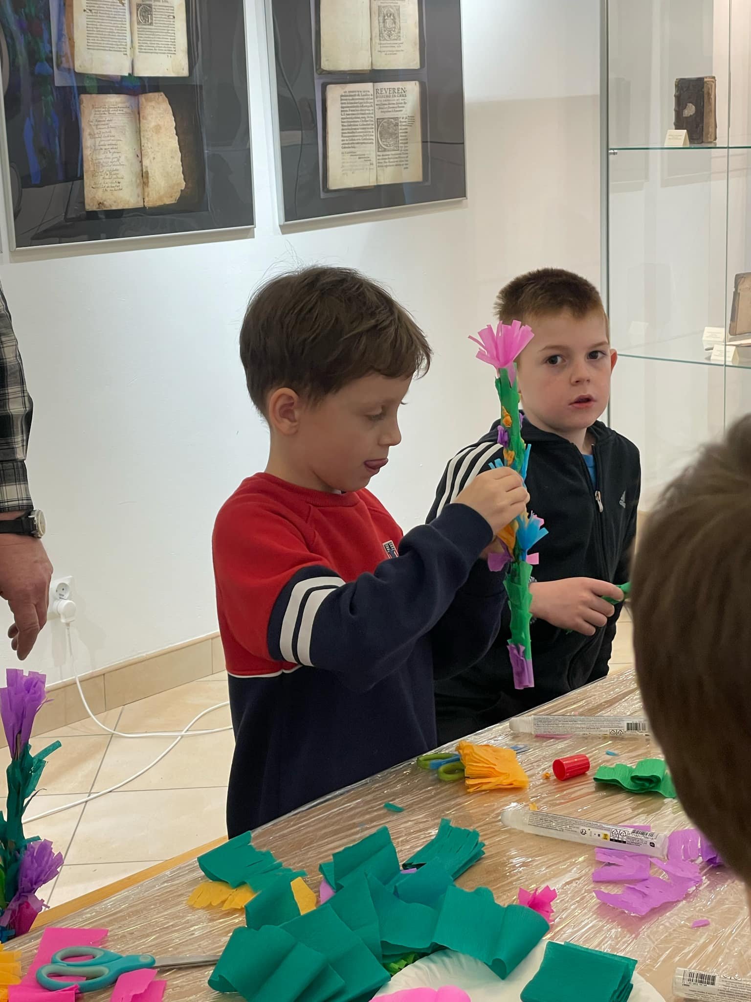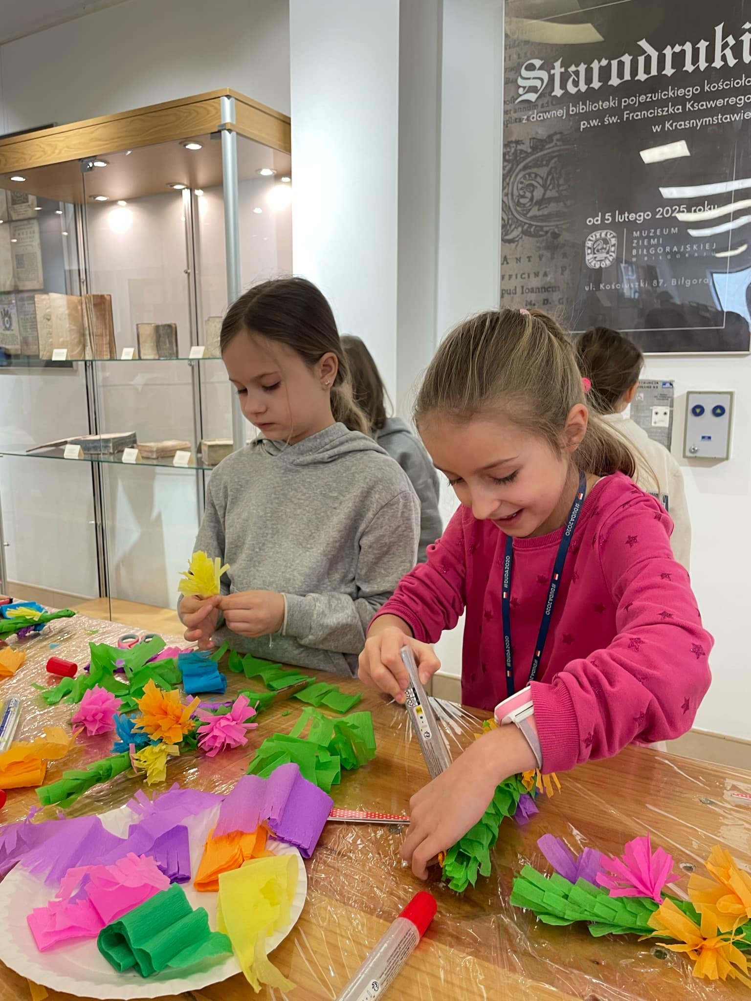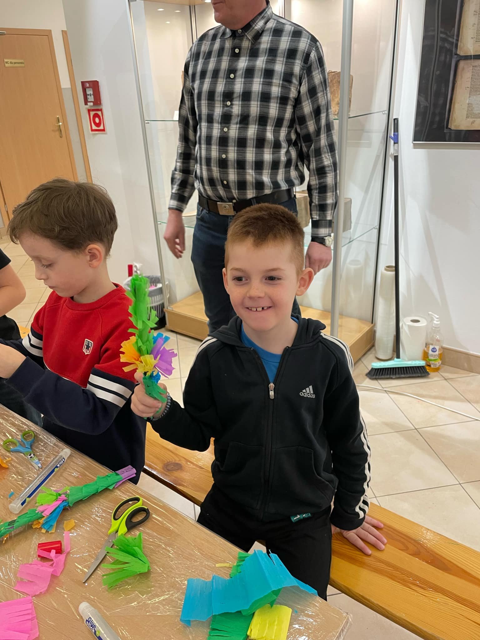 Z okazji nadchodzących Świąt Wielkanocnych w dniu dzisiejszym dzieci z klasy 1b i 1c uczestniczyły w warsztatach wyrobu palem wielkanocnych w Muzeum Ziemi Biłgorajskiej. Celem zajęć było przybliżenie tradycji Świąt Wielkanocnych, doskonalenie umiejętności współpracy, rozwijanie poczucia estetyzmu i rozbudzanie wyobraźni. Podczas warsztatów każdy uczestnik wykonał tradycyjną palmę wielkanocną z bibuły. Na zajęciach panowała miła, radosna atmosfera.
