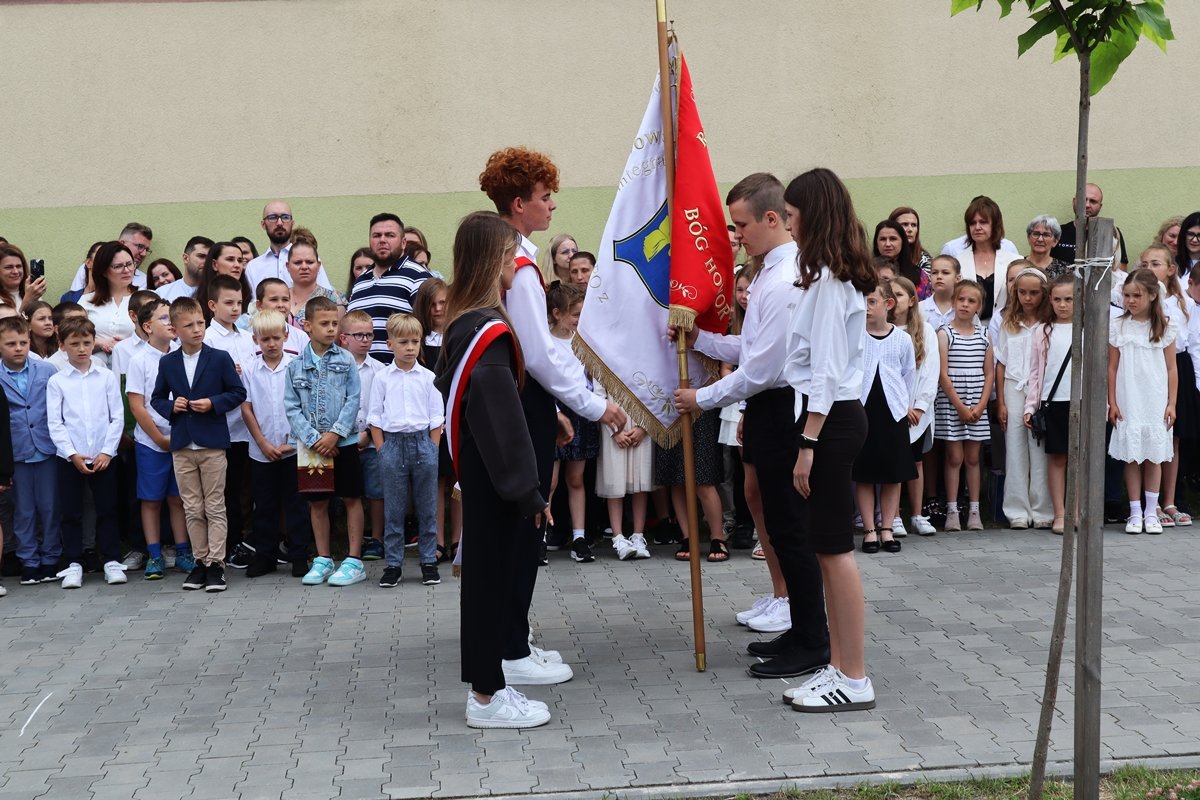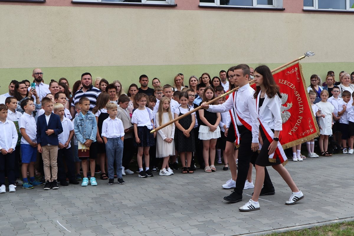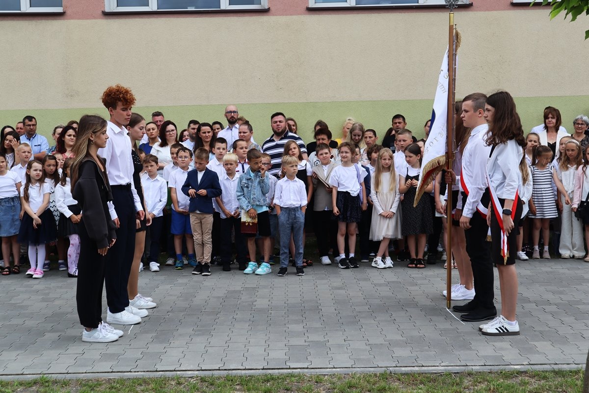 Podczas ceremonii wręczono nagrody dla najzdolniejszych uczniów, którzy przez cały rok wyróżniali się wynikami w nauce, zaangażowaniem oraz działalnością na rzecz szkoły i społeczności lokalnej. Gratulujemy wszystkim nagrodzonym – jesteśmy z Was bardzo dumni! Szczególnym momentem było tradycyjne przekazanie sztandaru. Ósmoklasiści, kończący swoją edukację w naszej szkole, przekazali go siódmoklasistom – jako symbol kontynuacji wartości i tradycji, które od lat budują naszą szkolną wspólnotę. Podczas uroczystości głos zabrali: Dyrektor szkoły, Pani Wicedyrektor, Przewodniczący Rady Rodziców oraz Radny. W swoich przemówieniach podkreślali wagę wspólnego wysiłku, sukcesów naszych uczniów oraz roli, jaką szkoła odgrywa w życiu młodych ludzi. Nie zabrakło także słów podziękowania dla nauczycieli, rodziców i wszystkich, którzy wspierają szkołę na co dzień. Szczególne podziękowania należą się naszym nauczycielom, którzy przez cały rok z zaangażowaniem i pasją prowadzili uczniów przez świat wiedzy i wartości. To dzięki ich codziennej pracy, cierpliwości i oddaniu możliwe są wszystkie sukcesy naszych podopiecznych. Również organizacja piątkowego zakończenia roku była efektem ich wspólnego wysiłku i troski o to, by każdy uczeń czuł się częścią czegoś ważnego.