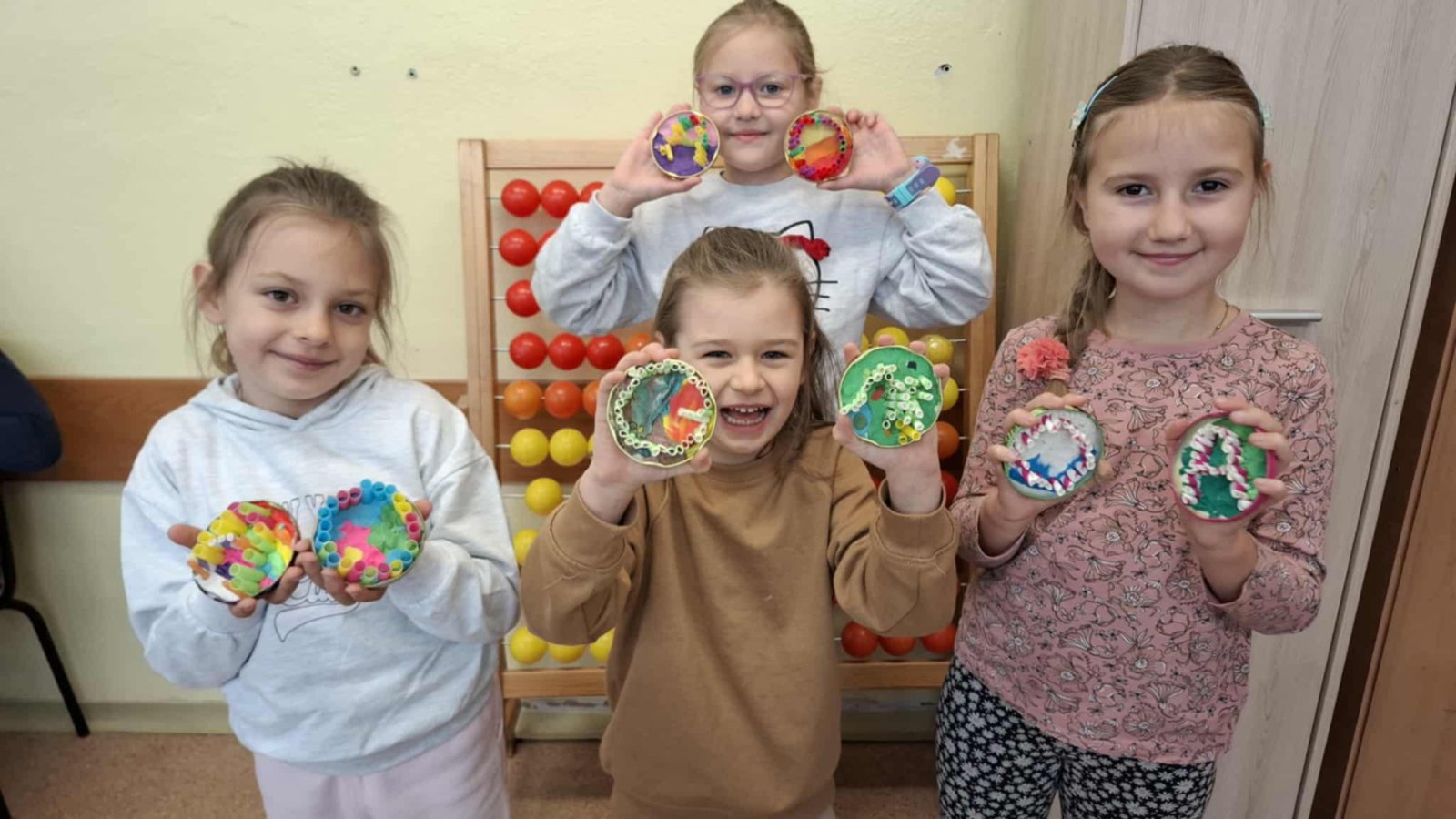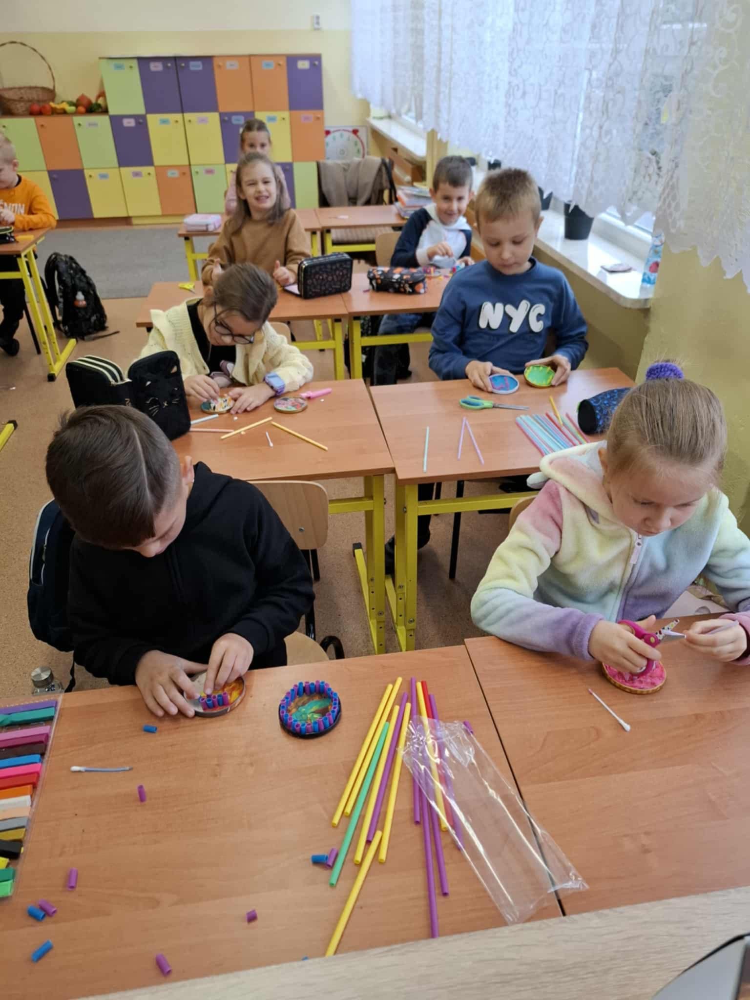 Uczniowie klasy 1a zrealizowali pierwsze zadanie w ramach projektu edukacyjnego „Literki w akcji”, którego celem jest wspieranie nauki czytania i pisania poprzez angażujące, kreatywne działania. Zadanie polegało na wyklejeniu plasteliną wieczka od słoika, co stanowiło kolorową i ciekawą bazę do dalszej pracy. Następnie dzieci tworzyły litery z pociętych słomek do napojów, układając je według wzoru lub własnego pomysłu.