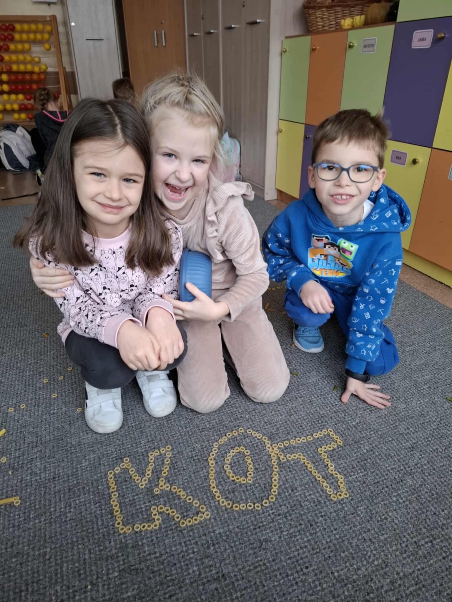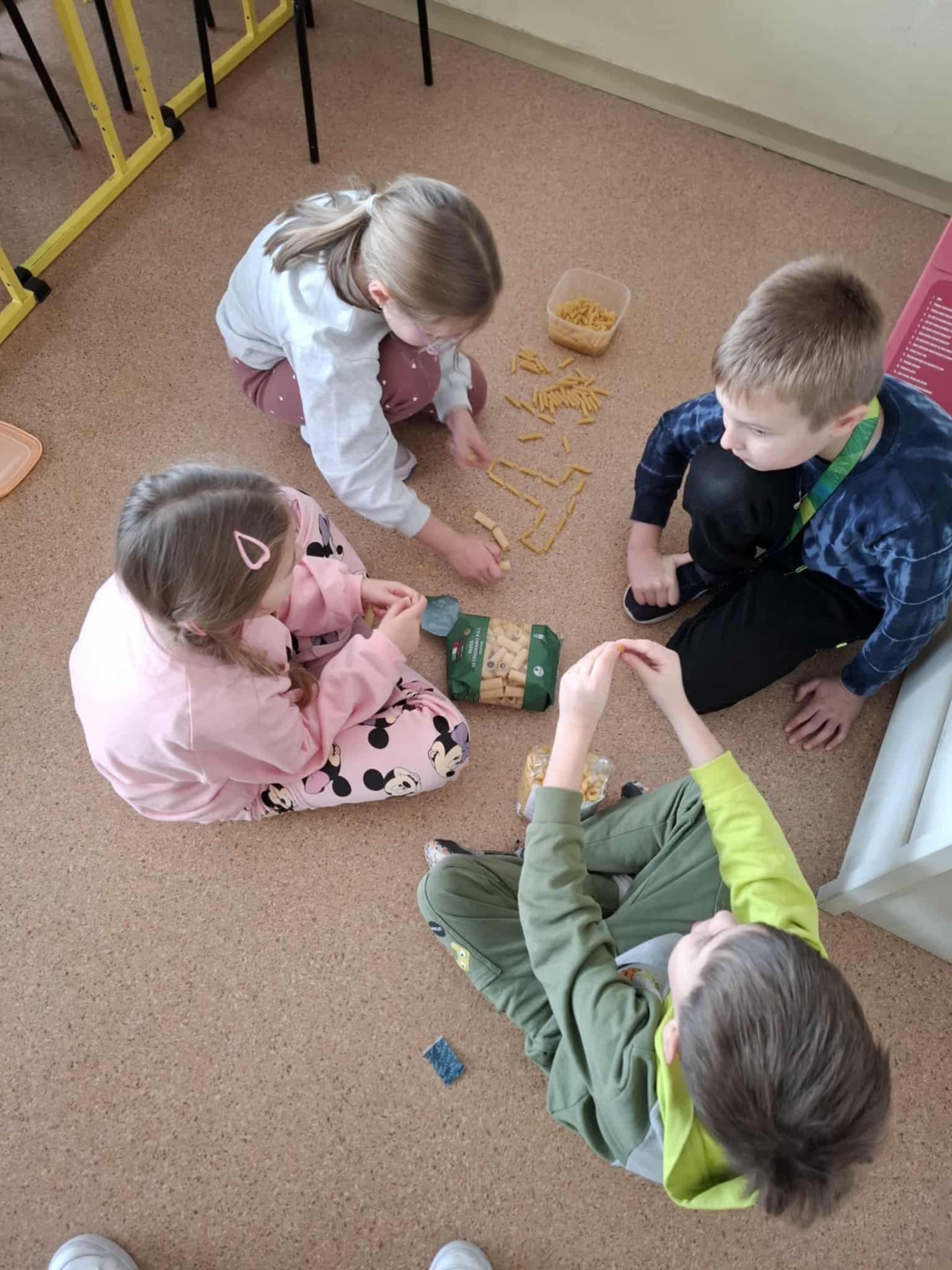 Dzieci z wielkim entuzjazmem wybierały odpowiednie kształty makaronu, tworzyły z nich litery alfabetu, a następnie układały krótkie, własne wyrazy. Ćwiczenie to nie tylko rozwijało umiejętności językowe, lecz także wspierało motorykę małą, kreatywność oraz współpracę w grupie.