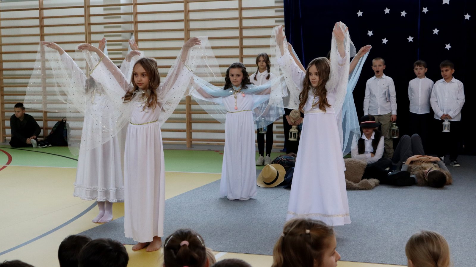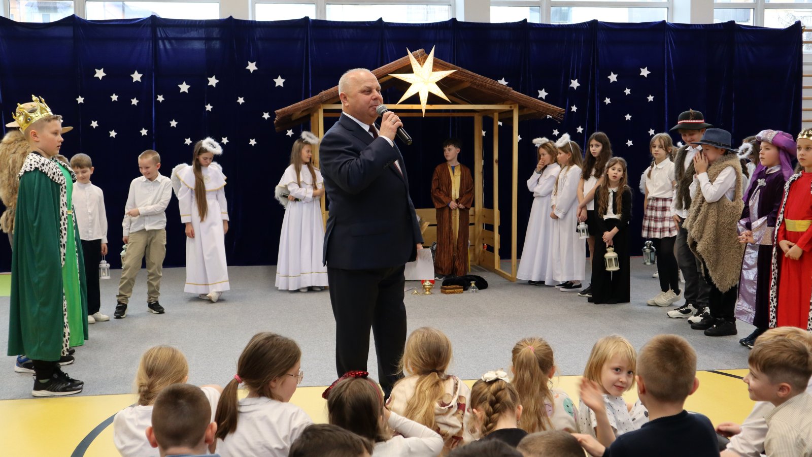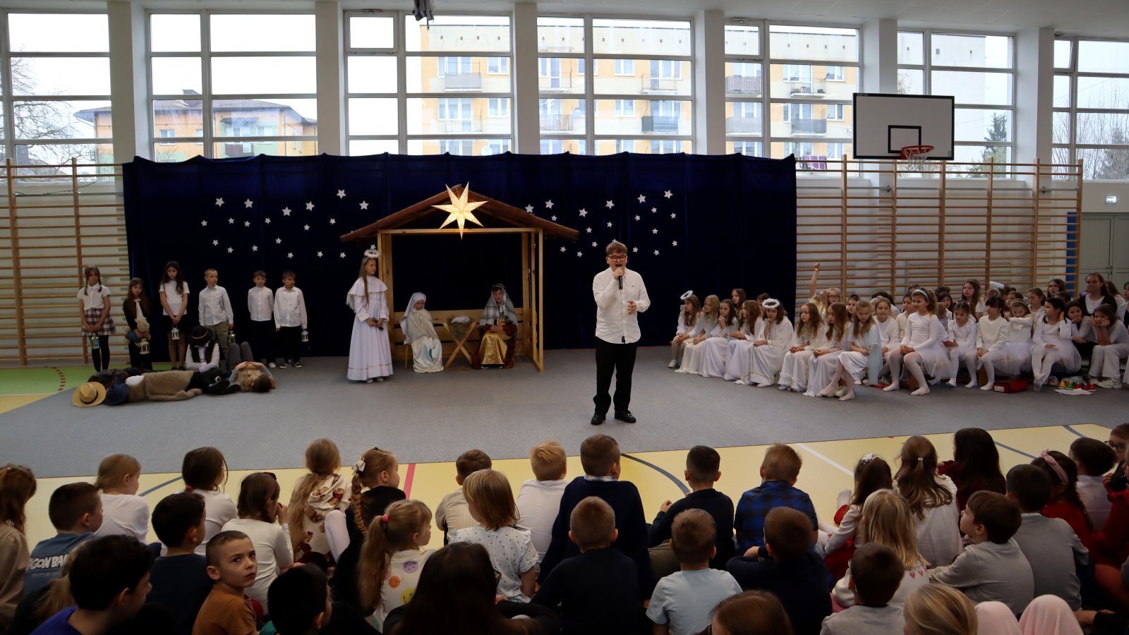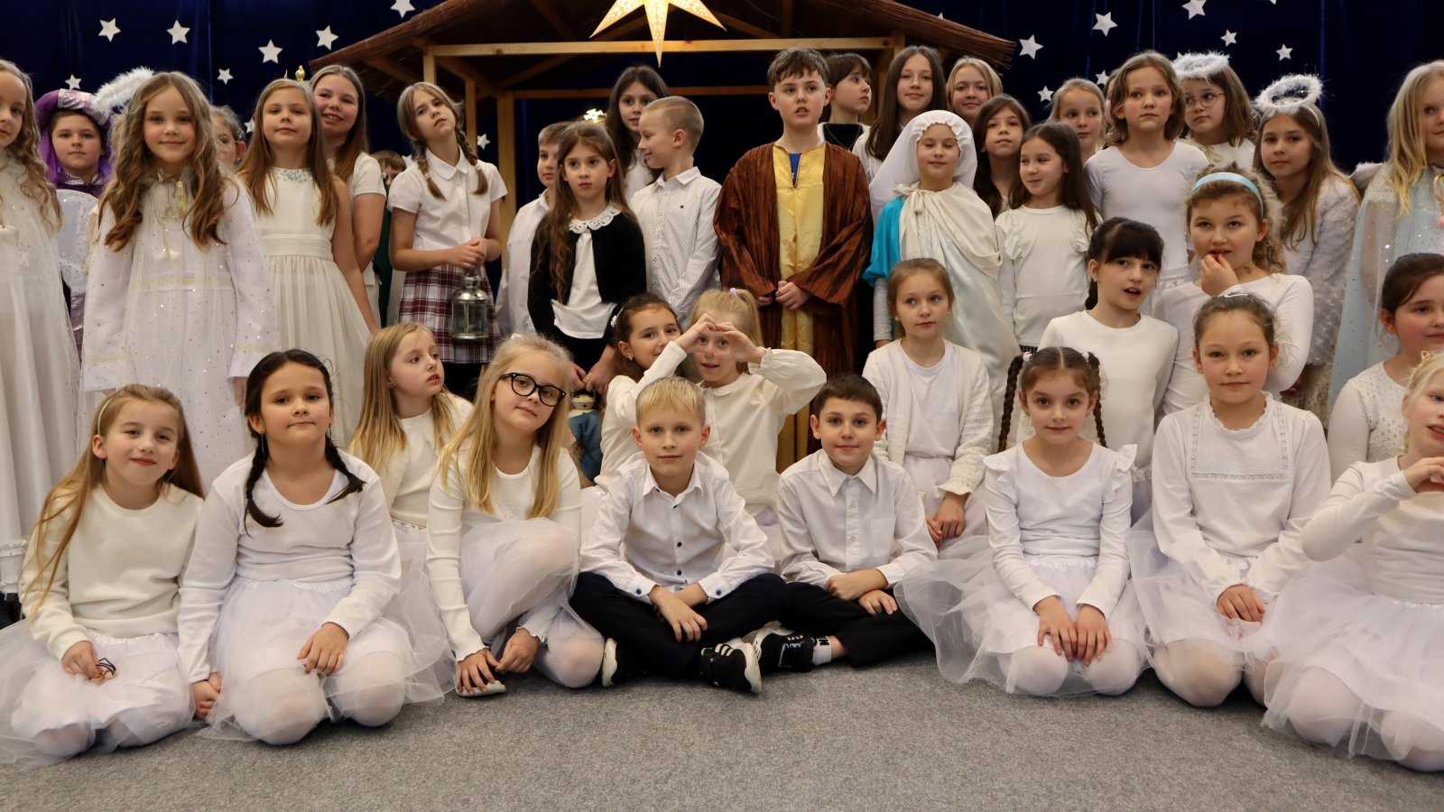 Uczniowie z wielkim zaangażowaniem zaprezentowali historię narodzin Jezusa, wcielając się w role Maryi, Józefa, pasterzy, aniołów oraz Trzech Króli. Przedstawienie zostało wzbogacone pięknymi kolędami i pastorałkami, które stworzyły podniosłą i ciepłą atmosferę. Starannie przygotowane stroje, dekoracje oraz oprawa muzyczna sprawiły, że występ na długo pozostanie w pamięci widzów. Jasełka były nie tylko artystycznym wydarzeniem, ale również okazją do wspólnego przeżywania wartości takich jak dobro, miłość, pokój i wzajemna życzliwość. Publiczność nagrodziła młodych artystów gromkimi brawami, doceniając ich trud, talent i odwagę sceniczną.
