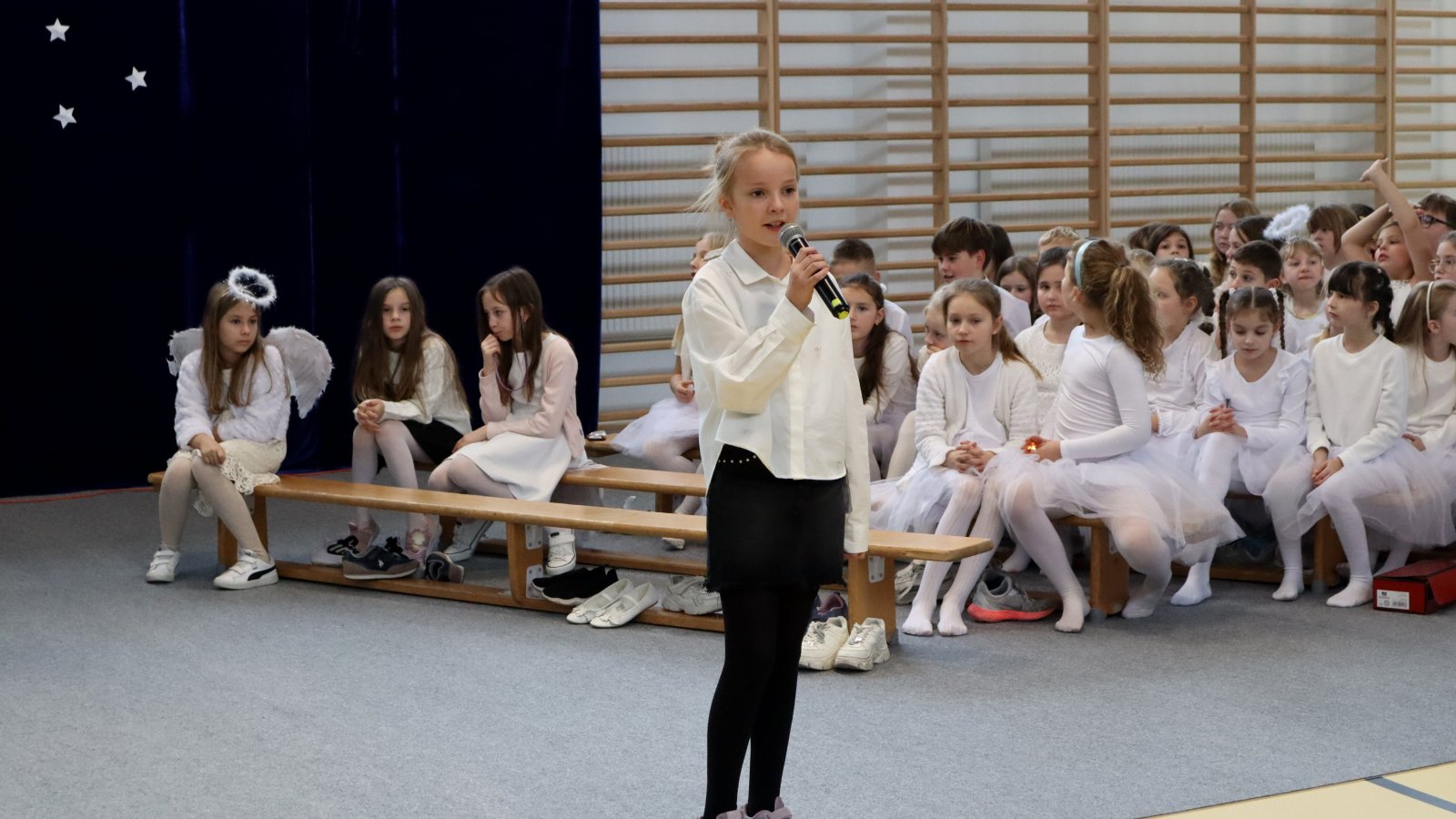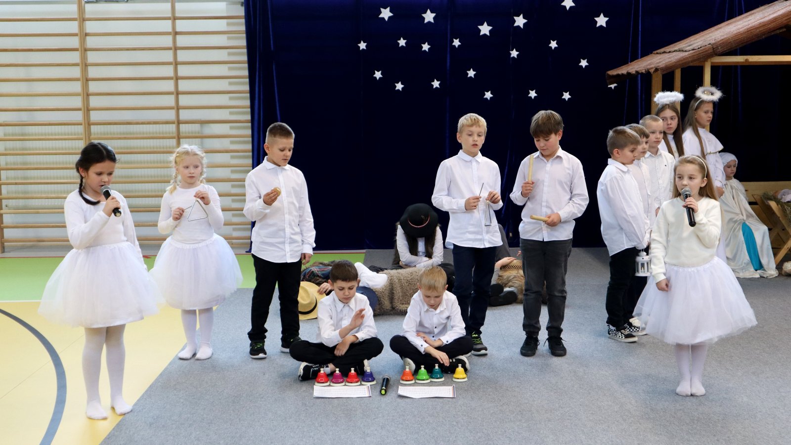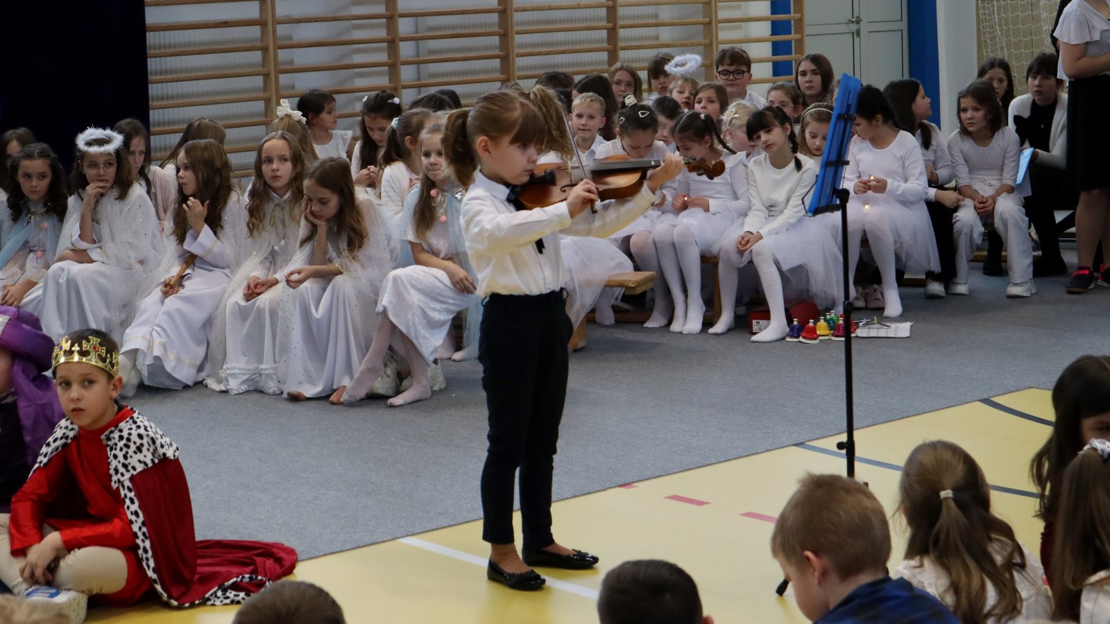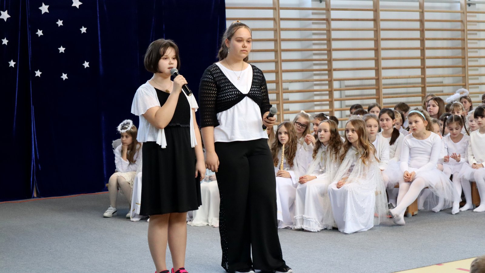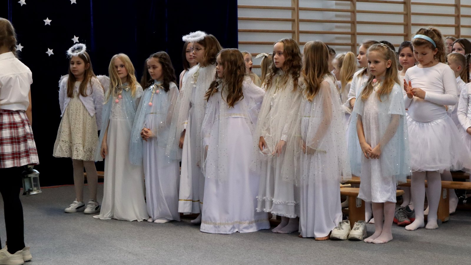 Uczniowie z wielkim zaangażowaniem zaprezentowali historię narodzin Jezusa, wcielając się w role Maryi, Józefa, pasterzy, aniołów oraz Trzech Króli. Przedstawienie zostało wzbogacone pięknymi kolędami i pastorałkami, które stworzyły podniosłą i ciepłą atmosferę. Starannie przygotowane stroje, dekoracje oraz oprawa muzyczna sprawiły, że występ na długo pozostanie w pamięci widzów. Jasełka były nie tylko artystycznym wydarzeniem, ale również okazją do wspólnego przeżywania wartości takich jak dobro, miłość, pokój i wzajemna życzliwość. Publiczność nagrodziła młodych artystów gromkimi brawami, doceniając ich trud, talent i odwagę sceniczną.