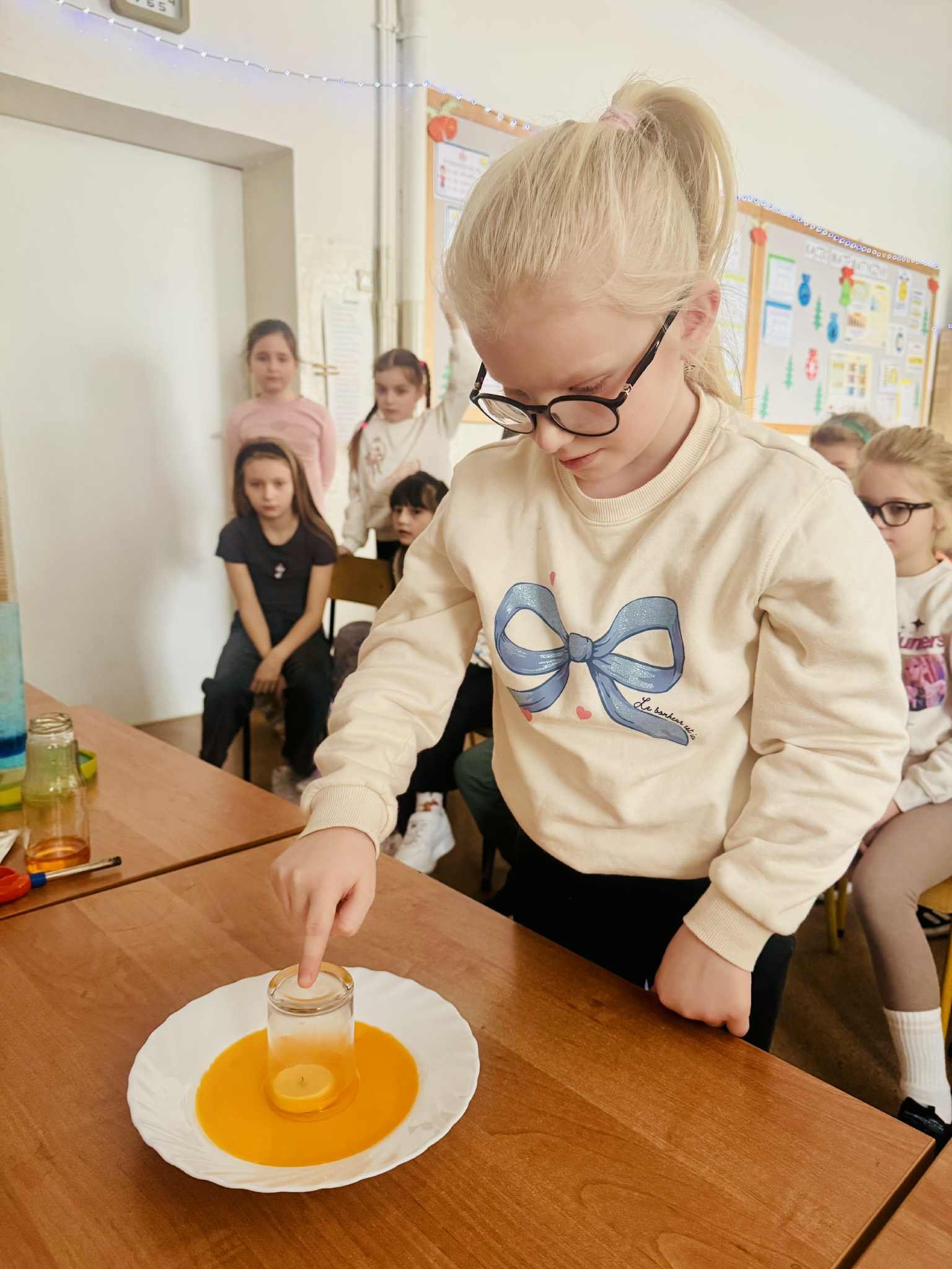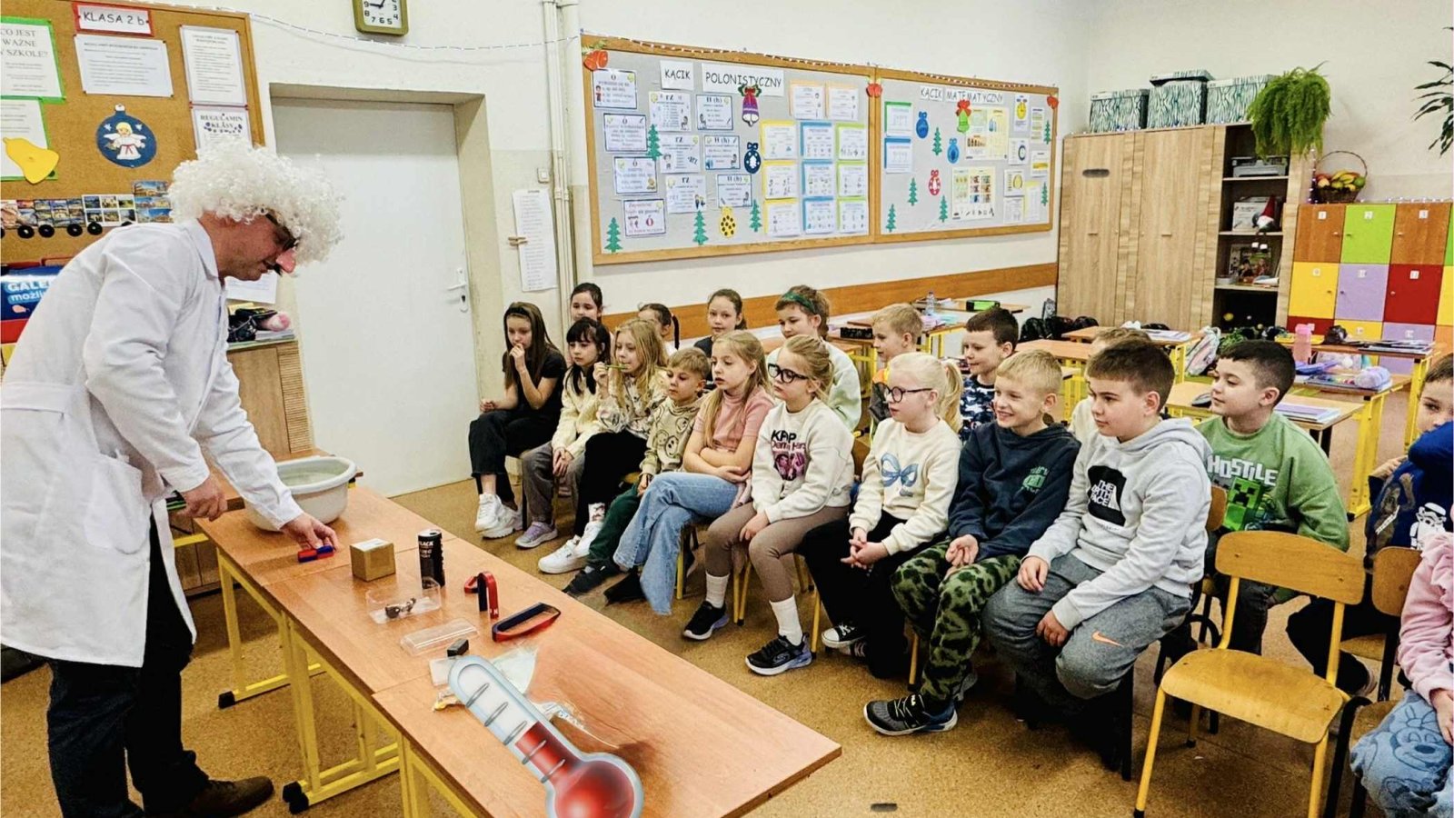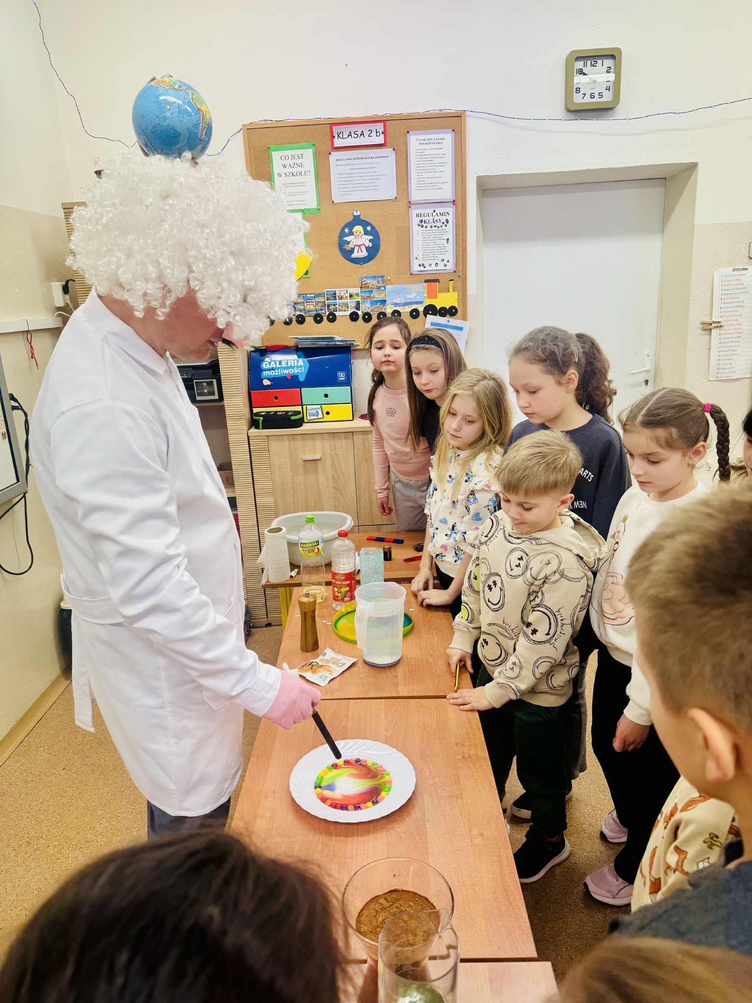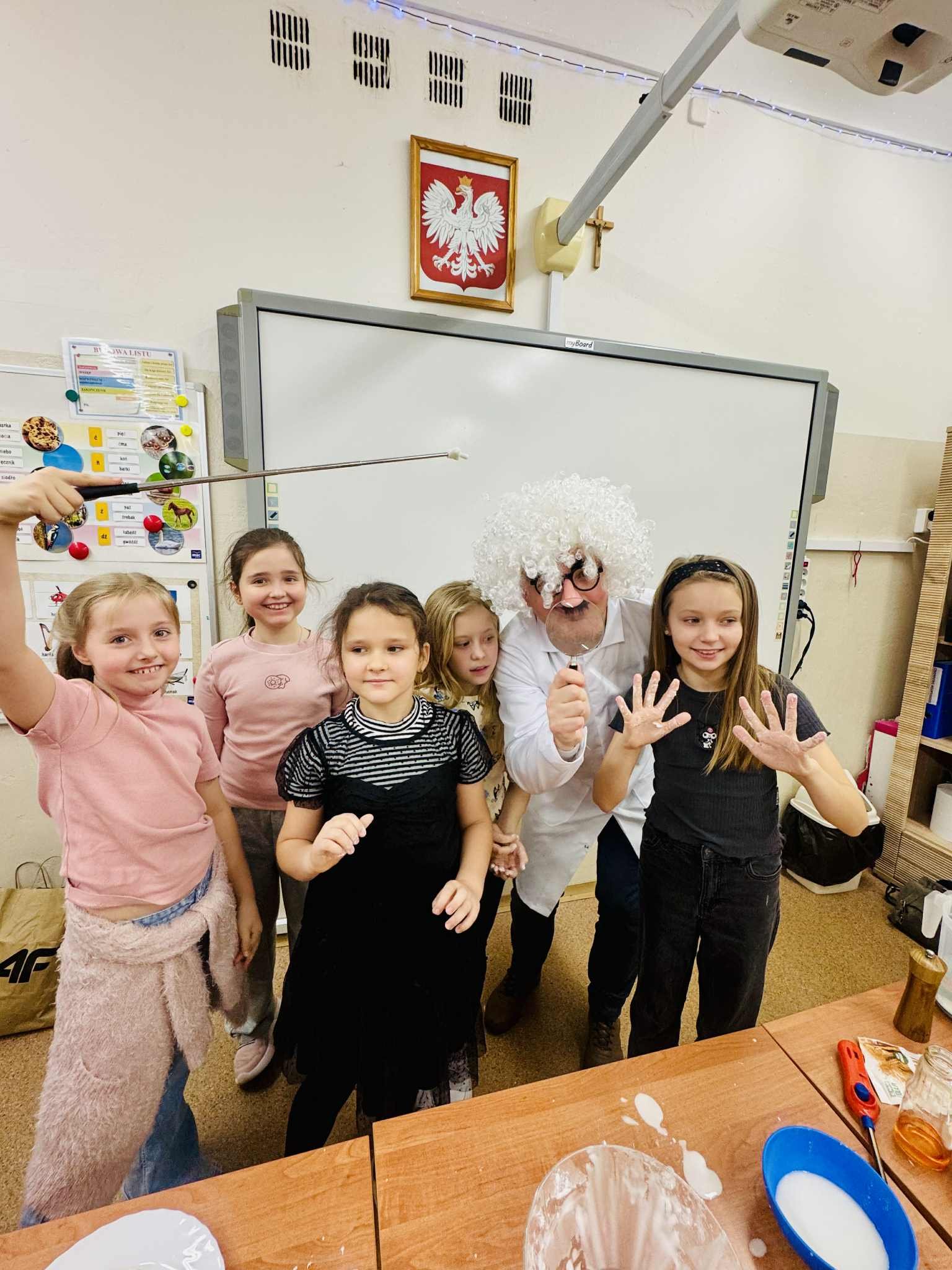 Z tej okazji klasę odwiedził pan prof. Jan Konewka, który w ciekawy i przystępny sposób przybliżył dzieciom podstawowe zagadnienia naukowe. Uczniowie mieli możliwość samodzielnego obserwowania prostych doświadczeń, eksperymentowania oraz zadawania pytań. Zajęcia wzbudziły ogromne zainteresowanie i zachęciły dzieci do aktywnego udziału w odkrywaniu świata. Spotkanie było doskonałym uzupełnieniem omawianej lektury, a jednocześnie wartościową lekcją pokazującą, że nauka może być fascynującą przygodą. Postać Marii Skłodowskiej-Curie stała się dla uczniów inspirującym przykładem tego, że ciekawość, wytrwałość i pasja mogą prowadzić do wielkich osiągnięć.