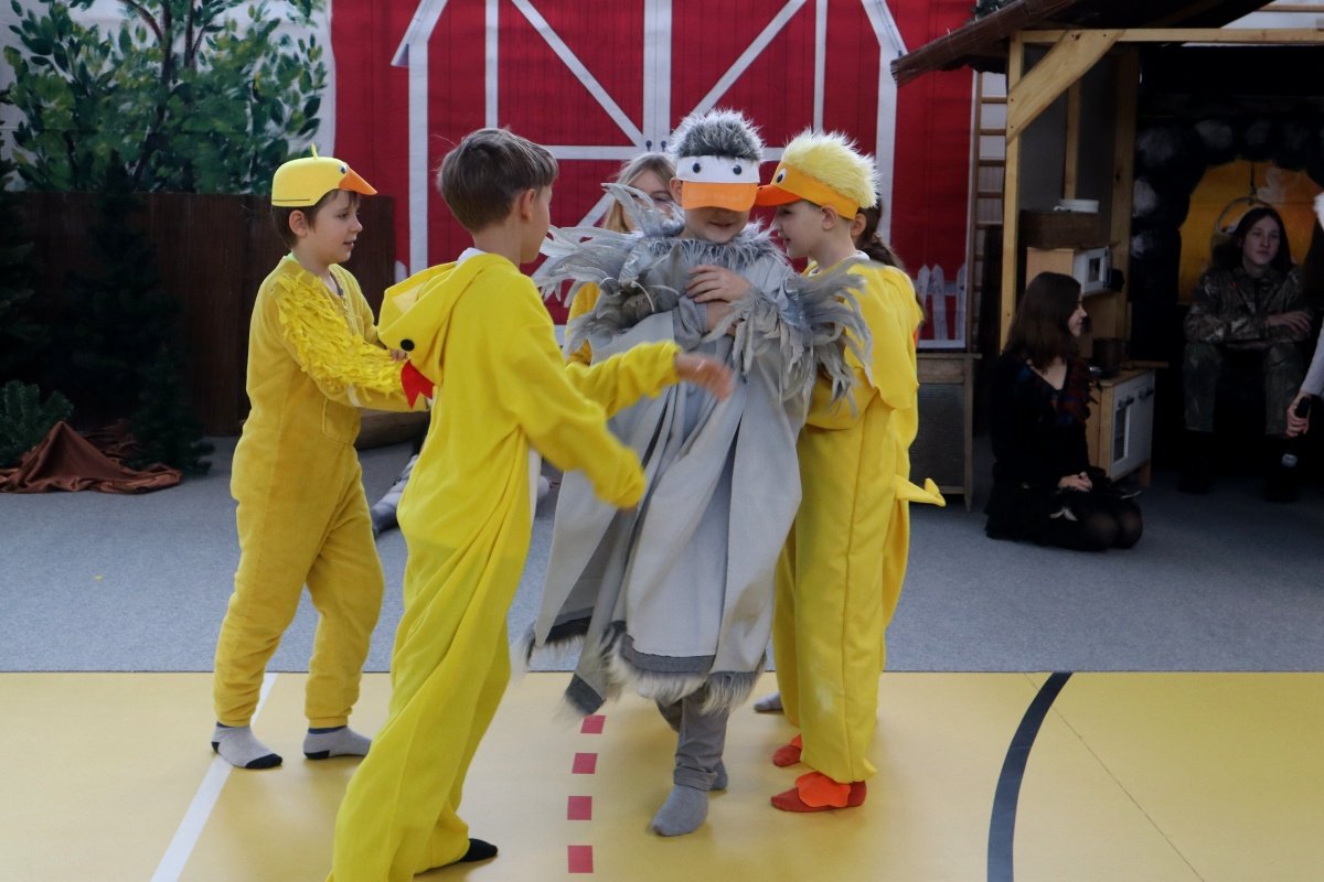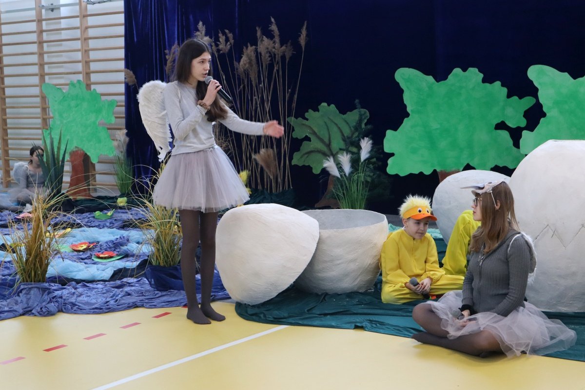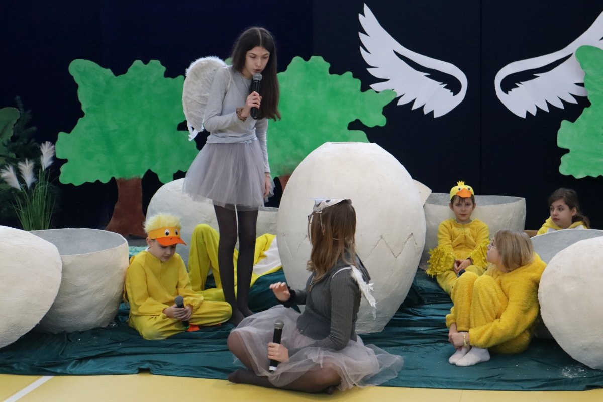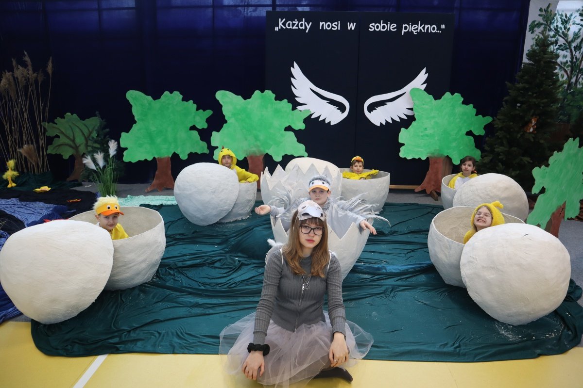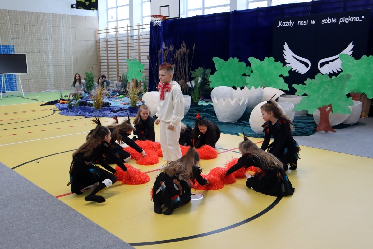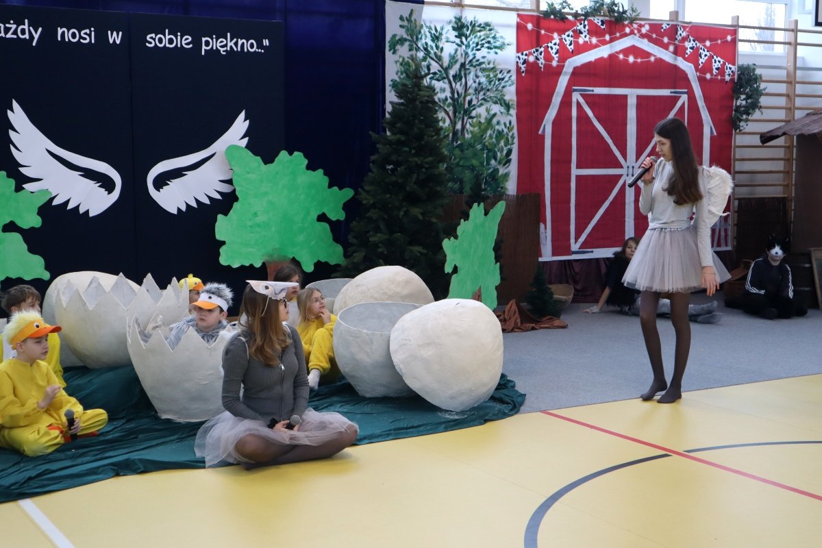 Najważniejszym punktem dnia było przedstawienie pt. „Brzydkie Kaczątko”, przygotowane przez uczniów i nauczycieli. Wybór tej baśni nie był przypadkowy. Historia małego kaczątka, które doświadcza odrzucenia i braku akceptacji, a ostatecznie odnajduje swoje miejsce i odkrywa własną wartość, stała się piękną metaforą przesłania tego dnia. Młodzi aktorzy z ogromnym zaangażowaniem wcielili się w swoje role, wzruszając i skłaniając do refleksji zgromadzoną publiczność. Wspólna praca nad spektaklem była także przykładem integracji w praktyce- współdziałania, wzajemnej pomocy i budowania relacji opartych na szacunku.