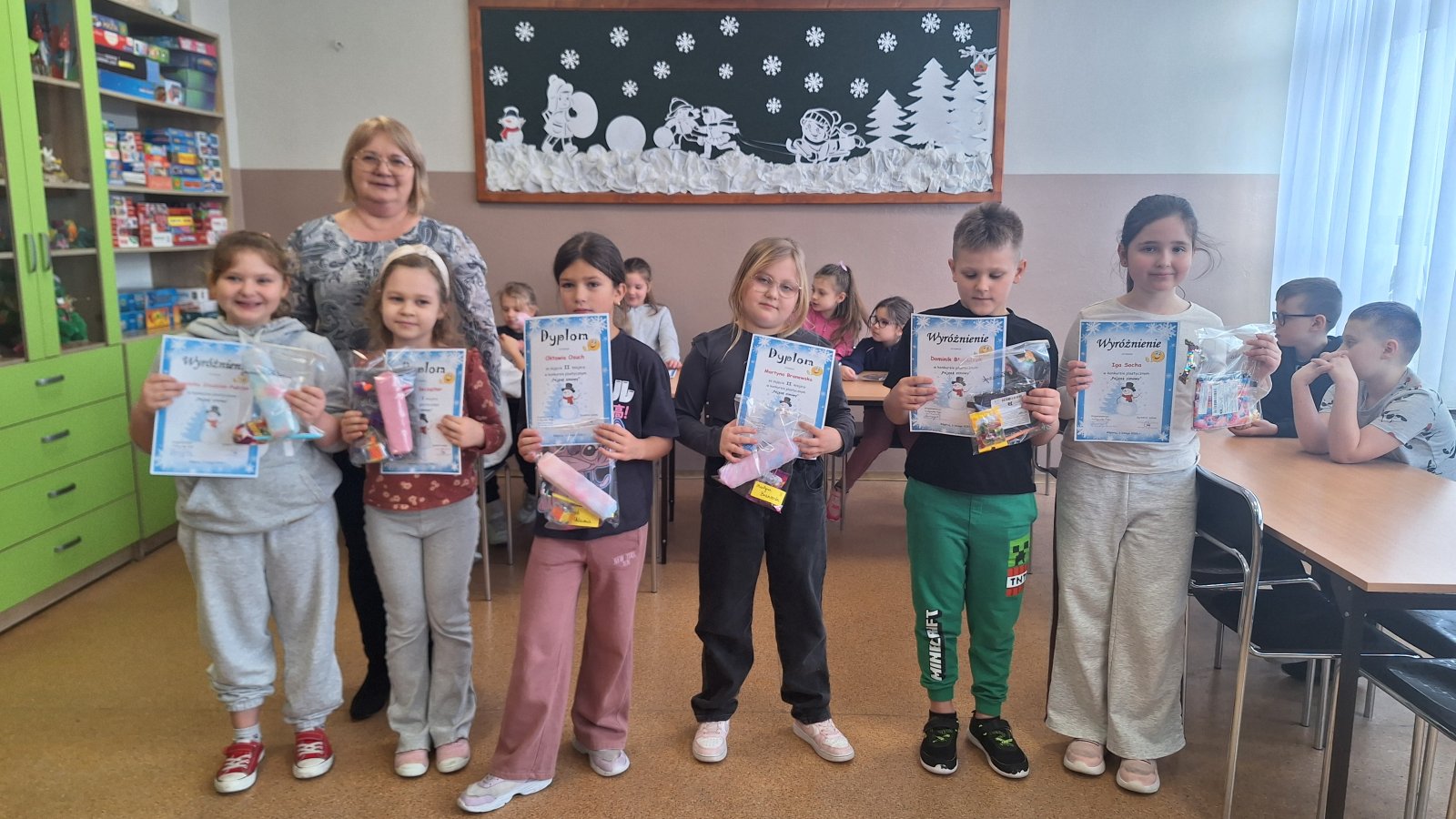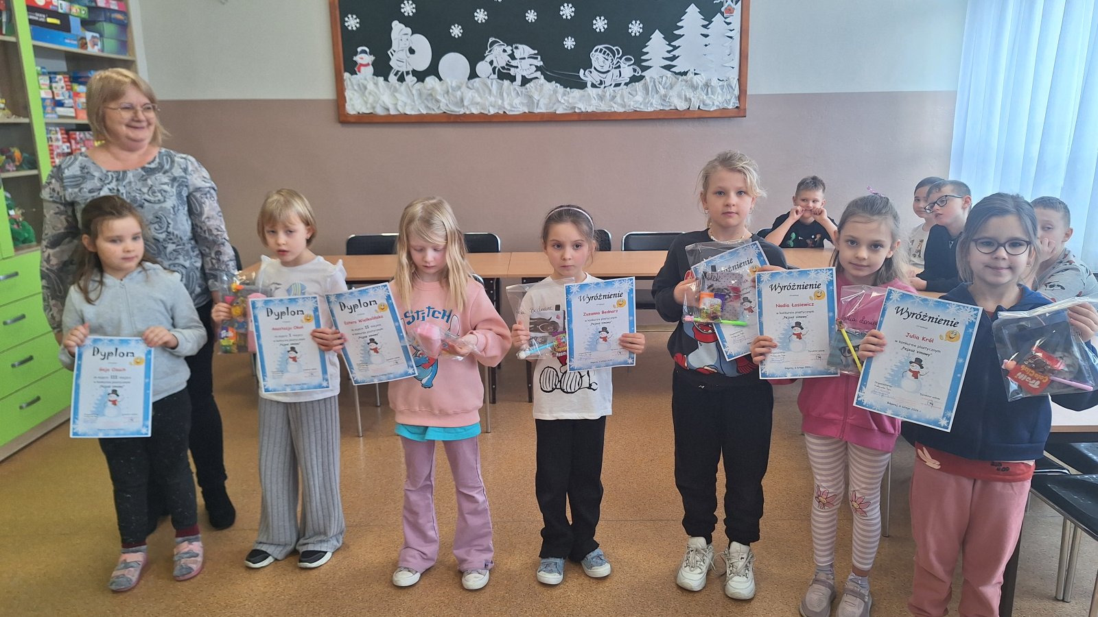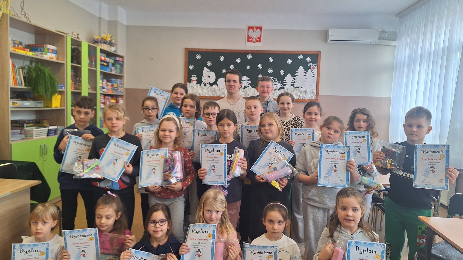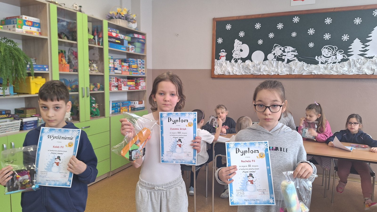 Zima, zima, zima, pada, pada śnieg…Zima to przepiękna pora roku, która w tym roku, wyjątkowo, świat obdarowała pieknym, śnieżnym, białym puchem. 11 lutego 2026 r. w świetlicy szkolnej odbyło się uroczyste podsumowanie oraz wręczenie dyplomów i nagród w konkursie plastycznym „Pejzaż zimowy”. Celem konkursu było rozwijanie wyobraźni i kreatywności dzieci, doskonalenie umiejętności plastycznych oraz uwrażliwianie na piękno zimowej przyrody. Uczniowie wykazali się dużym zaangażowaniem i pomysłowością, prezentując prace wykonane różnymi technikami plastycznymi. Wszystkie prace cechowały się oryginalnością oraz starannością wykonania. Komisja konkursowa miała niezwykle trudne zadanie, ponieważ każda z prac była piękna i niepowtarzalna.